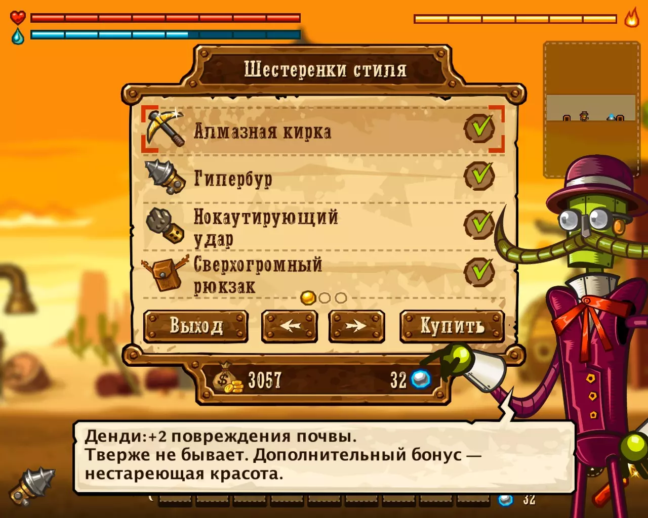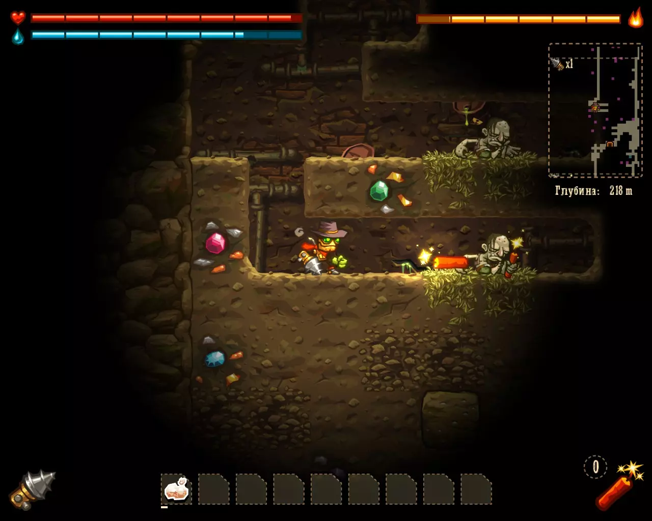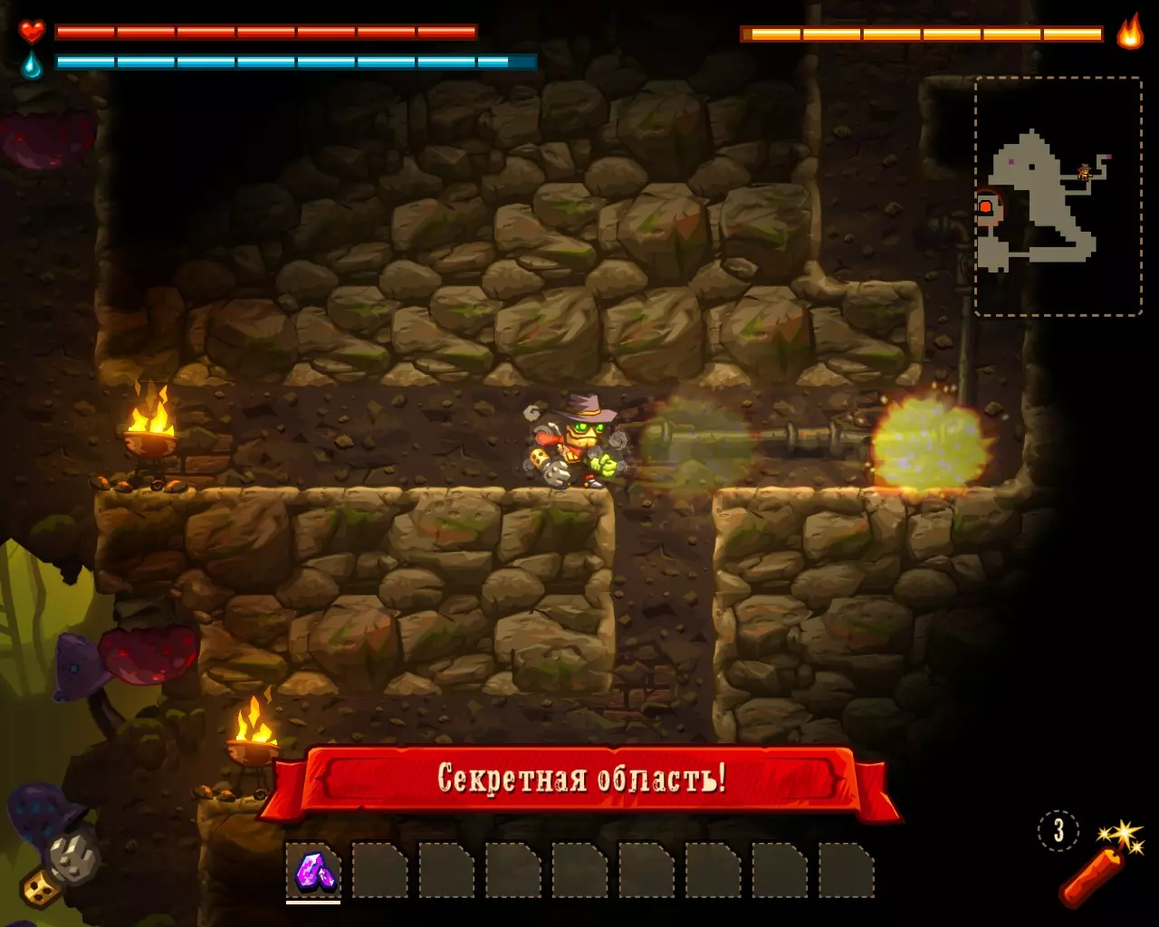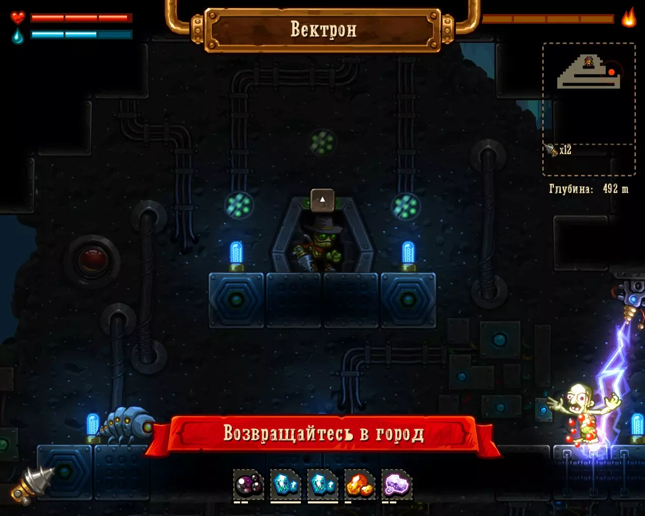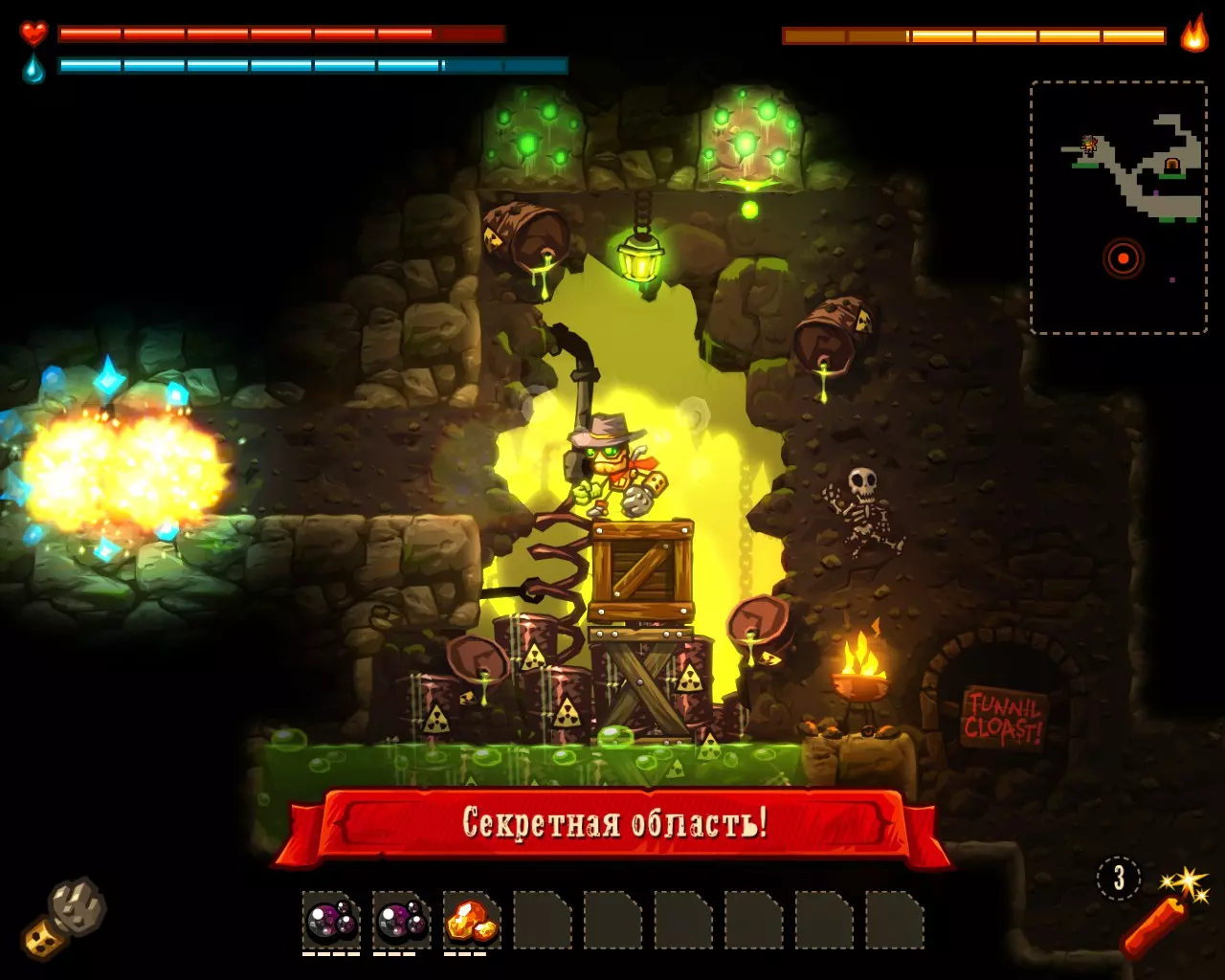______________________________________________________________________________ Внимание! Эту часть с расчетами Вы можете пропустить. Руководство ниже - после них. ______________________________________________________________________________ Условные обозначения: Архея, Старый мир и Вектрон будем называть мир #1, мир #2 и мир #3 соответственно. В каждом мире: К1, К2 и К3 - квестовые комнаты. [0-1] - промежуток между началом мира и К1. [1-2] - промежуток между К1 и К2. [2-3] - промежуток между К2 и концом мира. Неосновные (не квестовые) комнаты называем в зависимости от того, на каком промежутке они находятся: Н1[0-1], Н2[0-1] - первая и вторая комната первого промежутка в мирах. Н1[1-2], Н2[1-2] - первая и вторая комната второго промежутка в мирах. Н1[2-3], Н2[2-3] - первая и вторая комната третего промежутка в мирах. Расчеты: Мир #1 .................................... Мир #2........................................ Мир #3 [0-1] - $71 и 0 сфер ________ [0-1] - $1021 и 6 сфер _______ [0-1] - $2424 и 13 сфер [1-2] - $202 и 0 сфер _______ [1-2] - $1855 и 9 сфер _______ [1-2] - $1673 и 6 сфер [2-3] - $812 и 16 сфер ______ [2-3] - $2768 и 9 сфер _______ [2-3] - $8467 и 36 сфер К1 - $712 и 9 сфер ................ К1 - $75 и 10 сфер .................... К1 - $650 и 3 сфер К2 - $67 и 10 сфер ................ К2 - $100 и 10 сфер .................. К2 - $900 и 14 сфер К3 - $128 и 6 сфер ................ К3 - $888 и 10 сфер .................. К3 - $0 и 0 сфер (босс) Н1[1-2] - $16 и 3 сфер ______ Н1[0-1] - $0 и 7 сфер ________ Н1[0-1] - $183 и 3 сфер Н1[2-3] - $66 и 0 сфер ______ Н1[1-2] - $100 и 7 сфер ______ Н1[1-2] - $300 и 3 сфер Н2[2-3] - $50 и 3 сфер ______ Н2[1-2] - $100 и 7 сфер ______ Н1[2-3] - $600 и 7 сфер ...................................................................................................... Н2[2-3] - $740 и 3 сфер Всего: Мир #1: пространство мира $1085 и 16 сфер; все комнаты этого мира $1039 и 31 сфер Мир #2: пространство мира $5644 и 24 сфер; все комнаты этого мира $1263 и 51 сфер Мир #3: пространство мира $12564 и 55 сфер; все комнаты этого мира $3373 и 33 сфер ______________________________________________________________________________ Руководство: Начинаем игру. Не обращаем внимания на руду (сферы собираем только если заметим). Главное - как можно скорее достигнуть мира Вектрона и получить сканер минералов. Приоритет улучшений: 1 - бур; 2 - бак воды; 3 - увеличения жизни; 4 - фонарь. Получили сканер, затем опустошаем полностью третий мир "Вектрон" - руда+сферы (сам мир и все его комнаты - $16000 и 88 сфер). Видим, что не хватило 3-4 тысячи золота. Нехватку добираем в: В комнатах с генераторами, попутно ломая их! (1-я квестовая комната "Археи" - $712 и 3-я квестовая комната "Старого мира" - $888) Во втором мире - промежуток от 2-й квестовой комнаты до конца мира (там $2768) Пользуемся только буром! Динамит и телепорт всегда носим полными. Не боимся заставлять все телепортами, главное - экономия времени. Собрав $20 000 золота, пробегаем по всем комнатам первого и второго мира собирая сферы (в таблице расчетов, выше, указано сколько сфер в комнатах К1, К2, К3 и Нx[x-x]) Записывайте сколько Вы потратили сфер на улучшения и покупку телепортов + сколько у Вас сфер в инвентаре (Tab), что бы узнать сколько еще не хватает. А показатель собранного золота находится у скупщицы руды. Когда все собрали и уничтожили генераторы - вперед к боссу. Следите за временем! В меню выбора профиля показывается время игры. Когда вылезаем на поверхность (надпись "игра сохранина"), можно выйти из игры, посмотреть время и зайти. Время при нажатом Esc и Tab - не идет. И помните! Если Вы погибли или потратили уйму времени впустую - откатывайте игру до последнего сохранения (Alt+F4 или Alt+Tab -> диспетчер задач -> завершить процесс SteamWorld Dig) Примечание: Это руководство для тех - кто уже прошел игру хоть раз, т.к. для такого уровня требуется специальная с