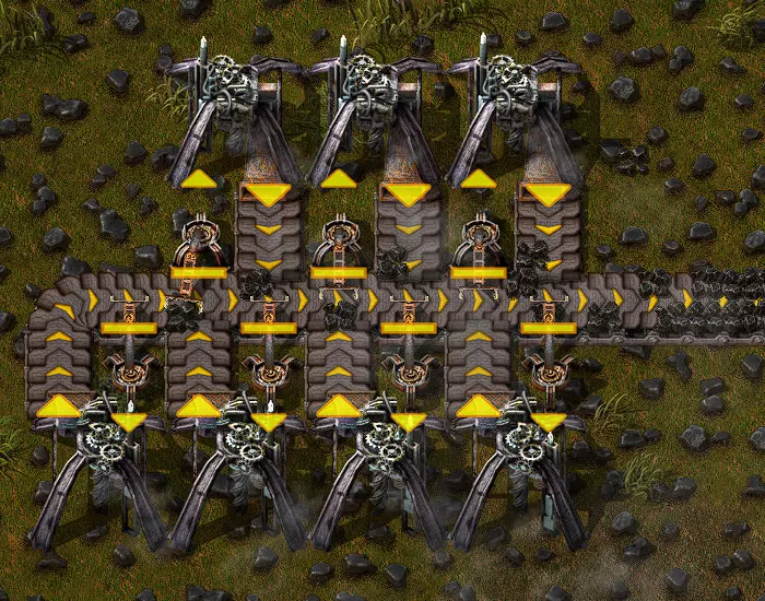 30.590 千瓦(电力)5x5 请注意,燃油采石机的尺寸与其开采面积相同(2x2),而电动采石机的尺寸比开采面积大1格(尺寸3x3,开采面积5x5)。请将电动采石机尽量紧密地放置在矿脉中心,在矿脉边缘则可放置得较为松散,以确保每台采石机都能获得等量资源,从而实现均匀产出。与其他机制不同,职业机制无需使用机械臂即可推出物品。 高效放置固体燃料钻机 方法1:两台固体燃料钻机若面对面放置在煤炭层上,可相互补充燃料。每个熔炉的运作方式都不同,煤炭会在它们的堆叠中逐渐积累,所以实际上你拥有100个煤炭(2堆,每座固体燃料熔炉各有50个煤炭,总共100个)。你也可以对4个或其他任何偶数数量的熔炉进行这样的操作。