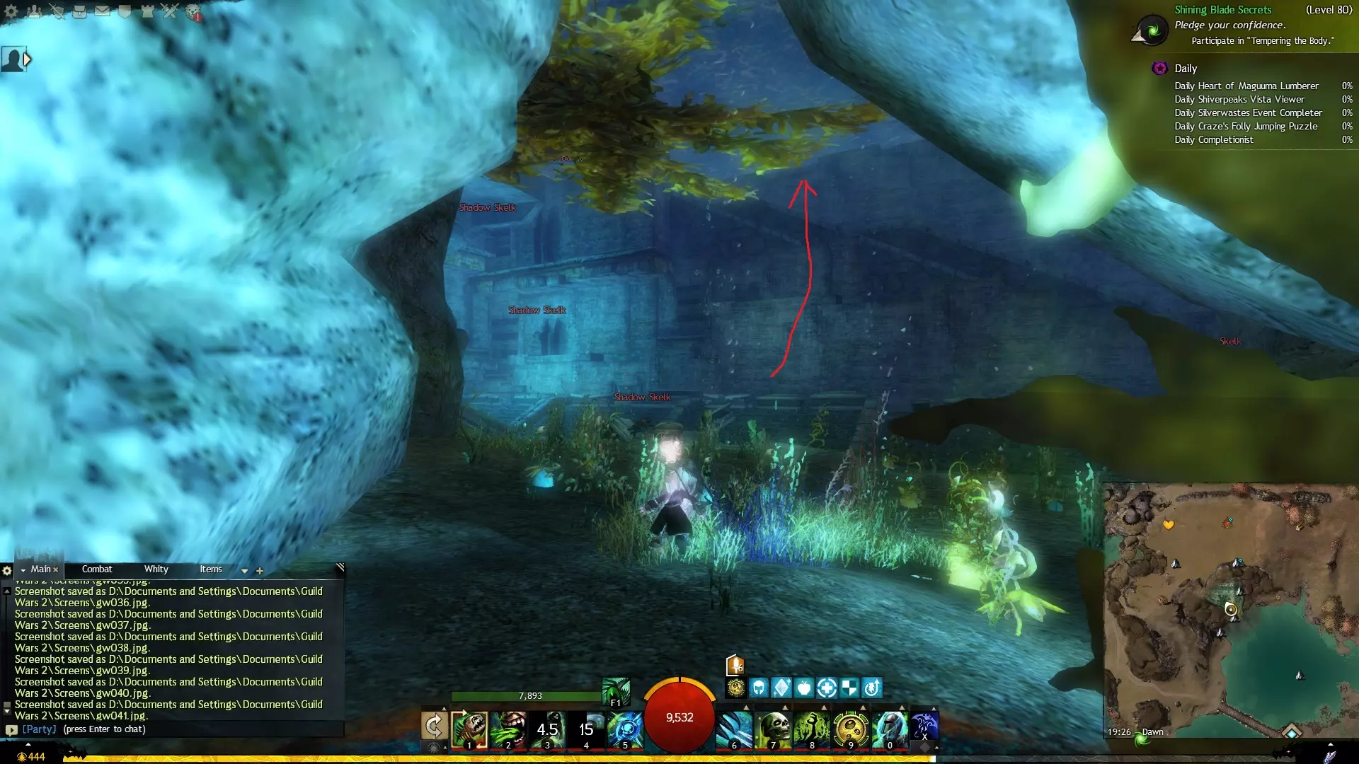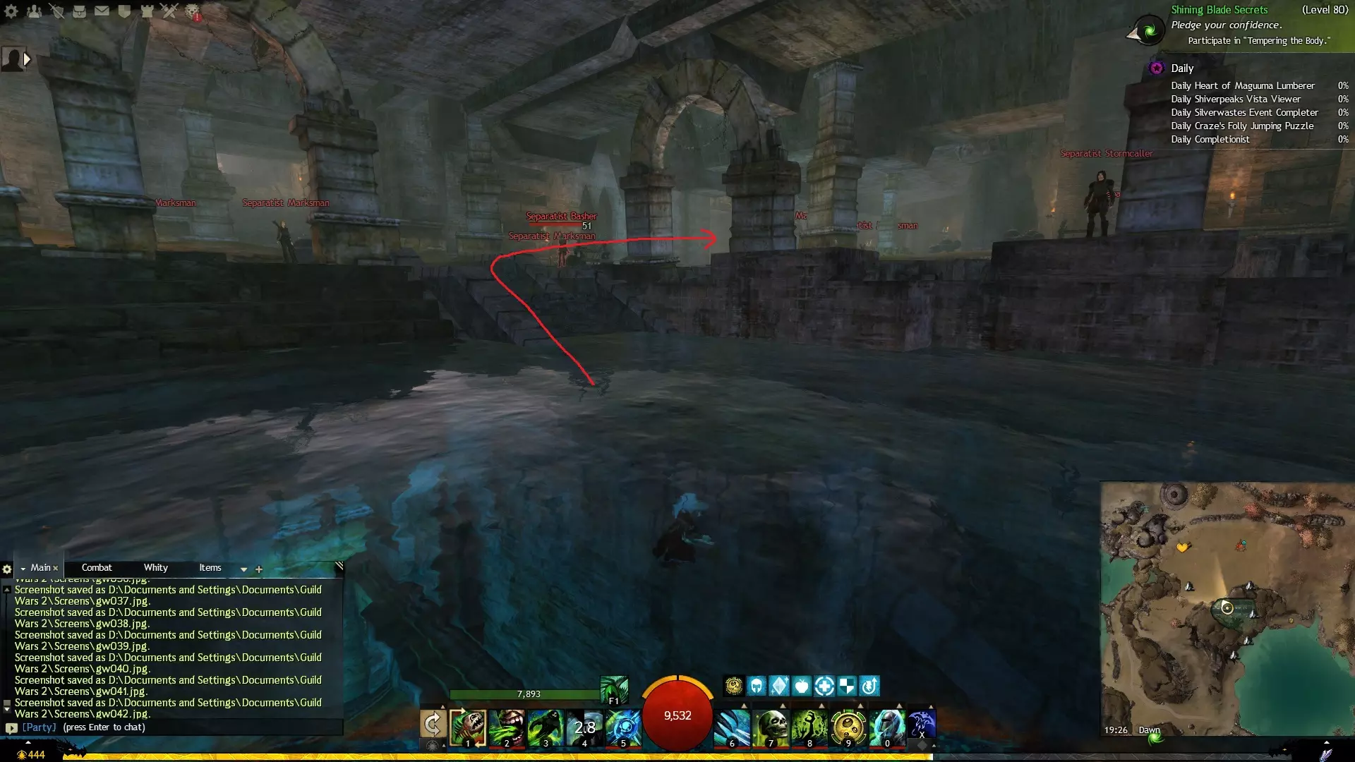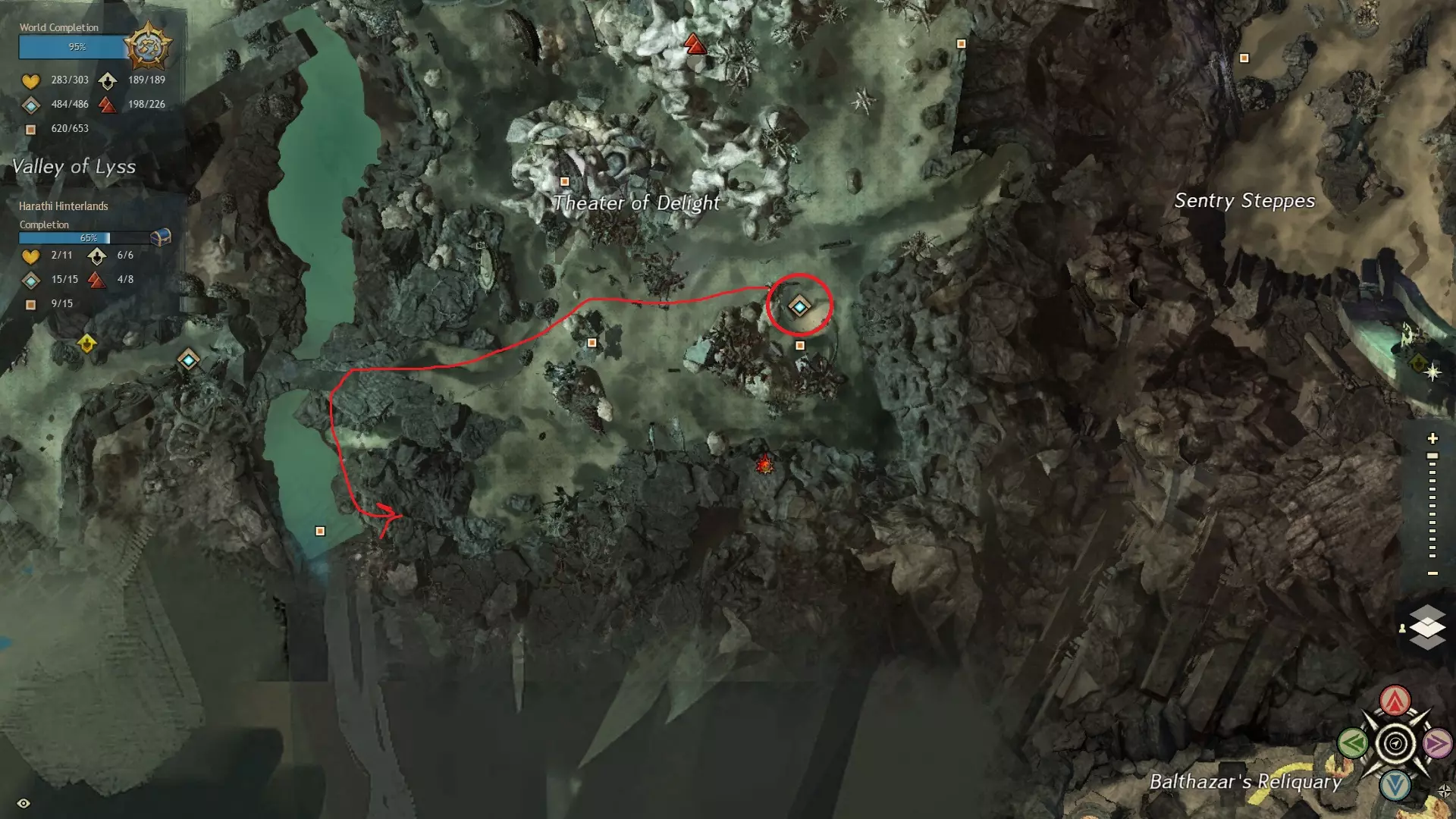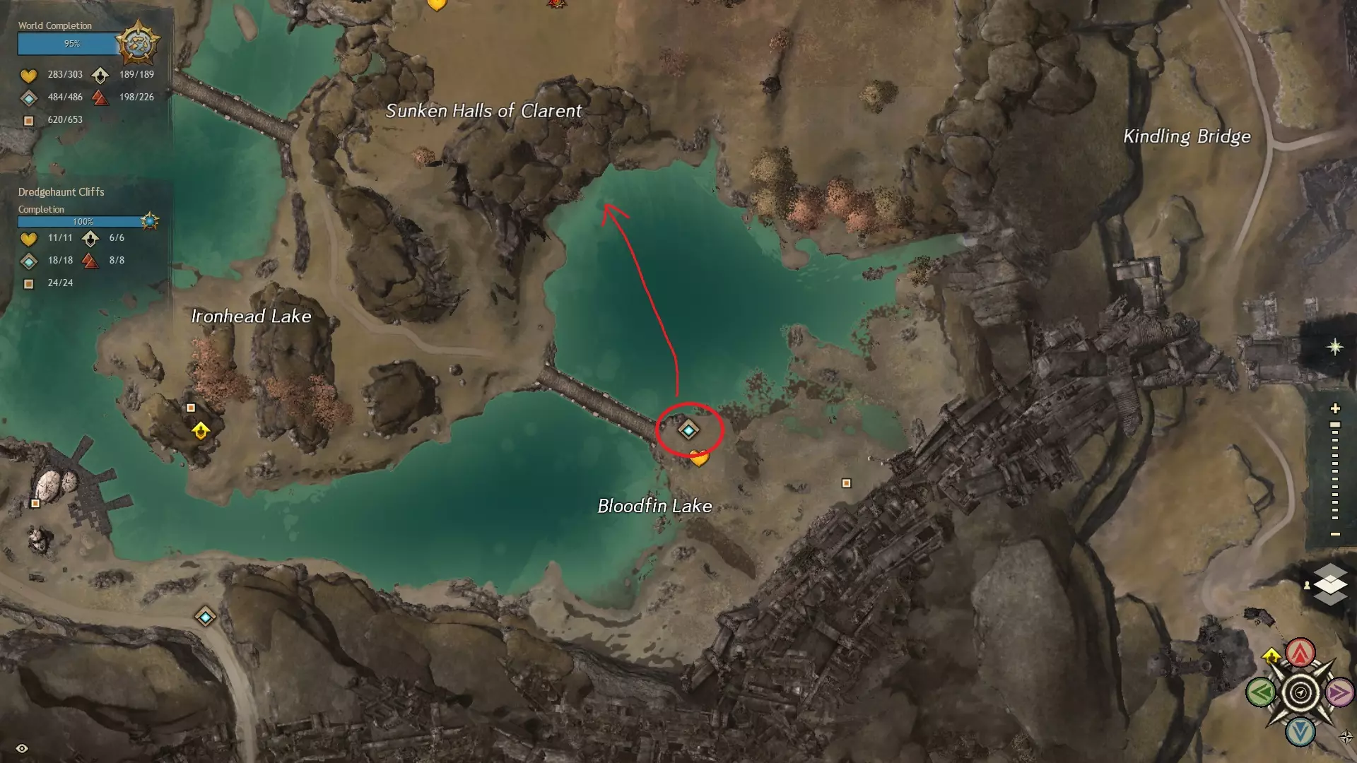 第一个技能位于血潮海岸区域的雷曼达盐沼传送点附近。当然还有大家熟悉的红线标出的小路。当我们看到技能点已经在我们下方时,就开始沿着楼梯向下走。