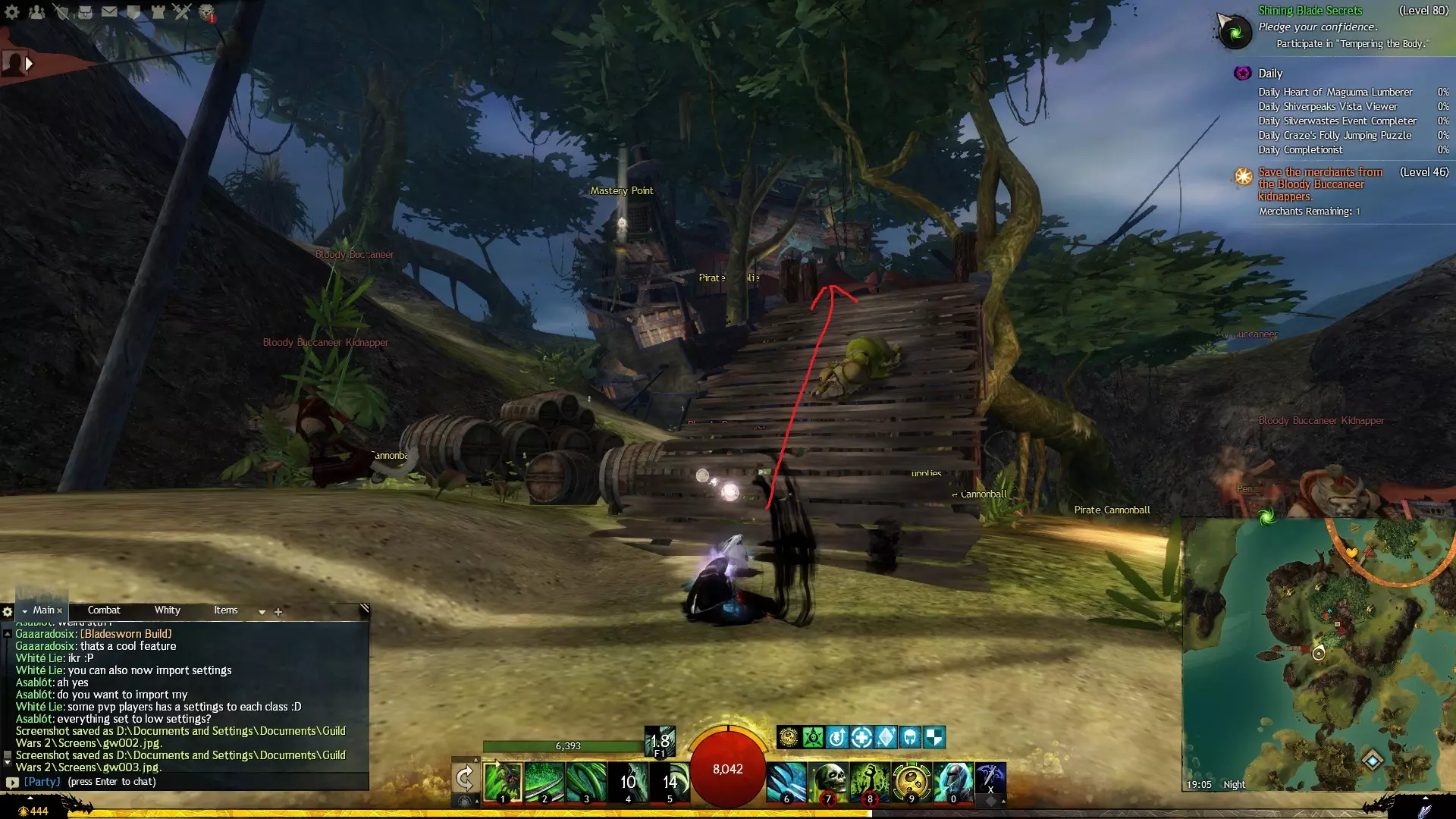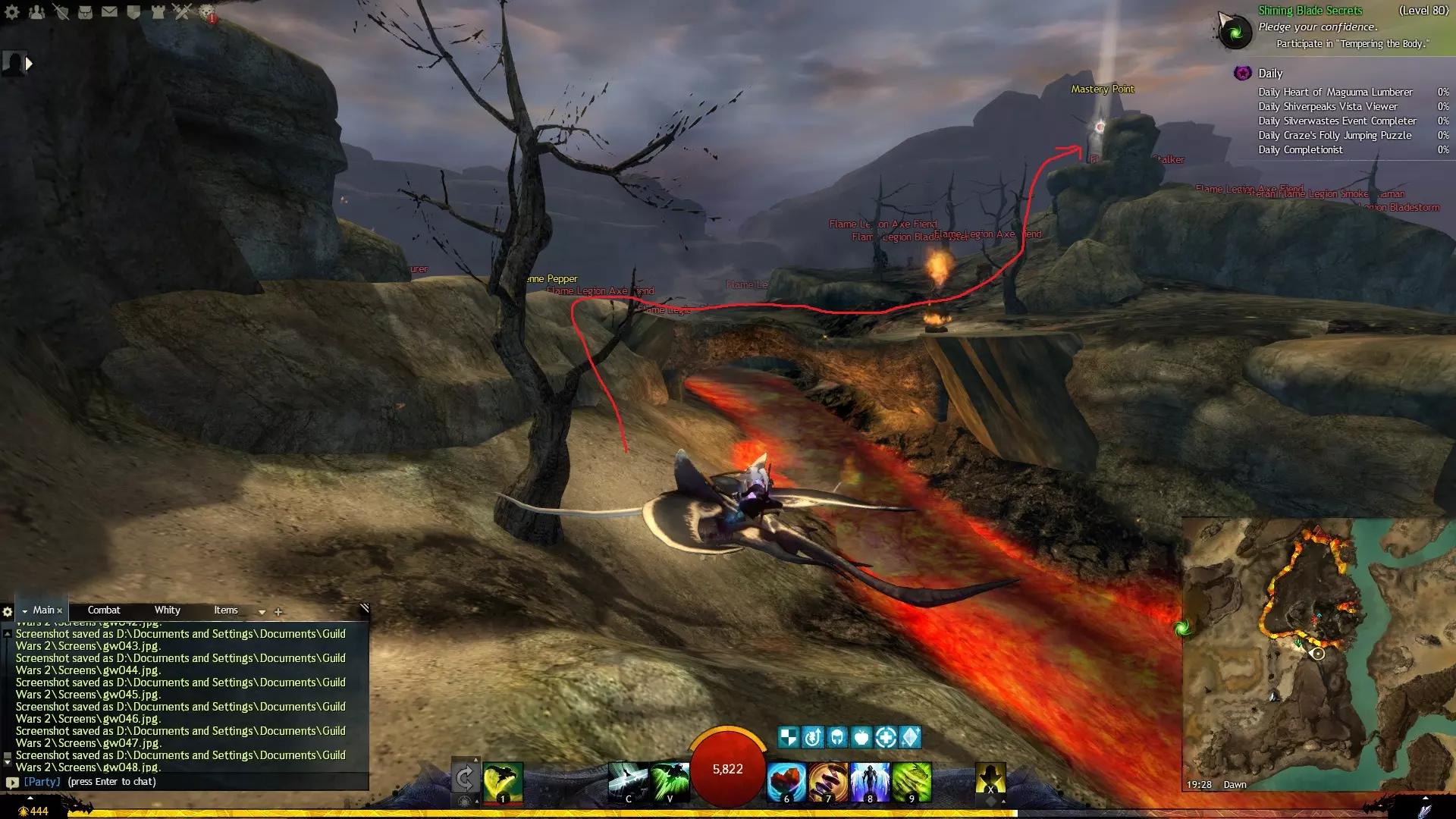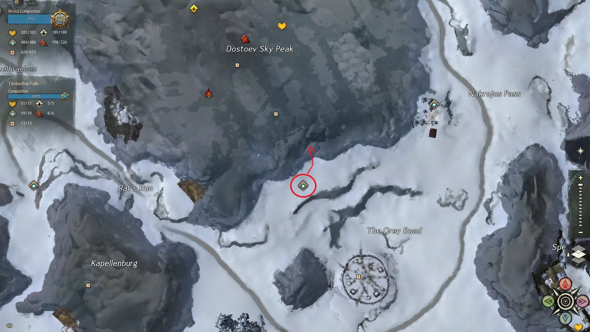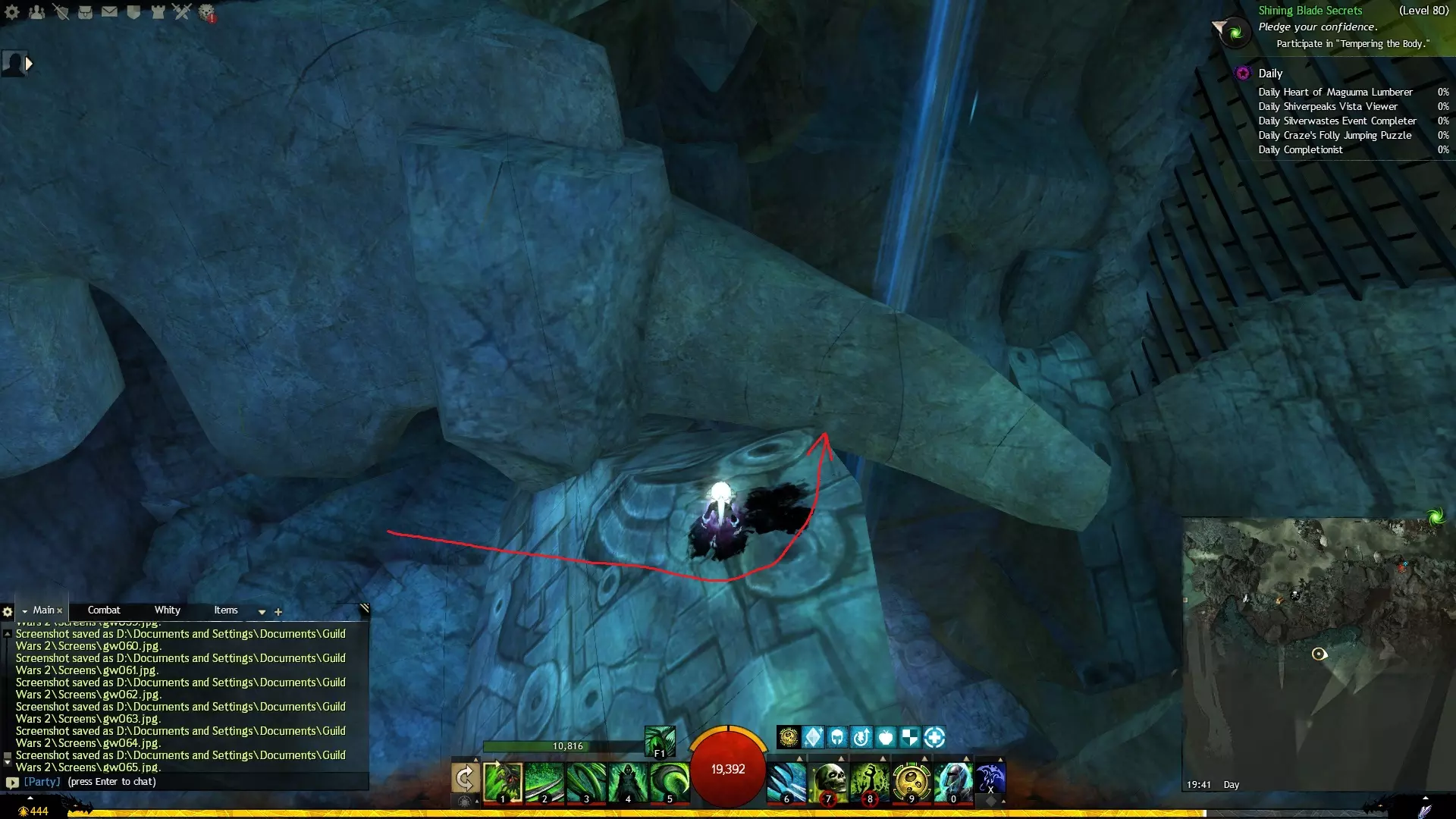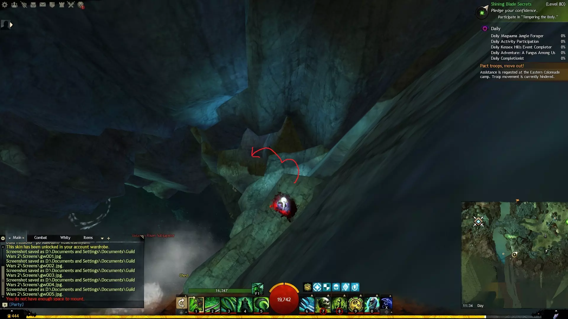 第一个技能位于血潮海岸区域的雷曼达盐沼传送点附近。当然还有大家熟悉的红线标出的小路。当我们看到技能点已经在我们下方时,就开始沿着楼梯向下走。