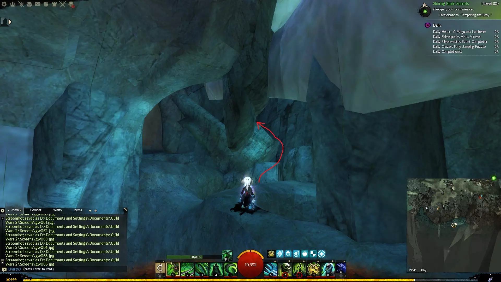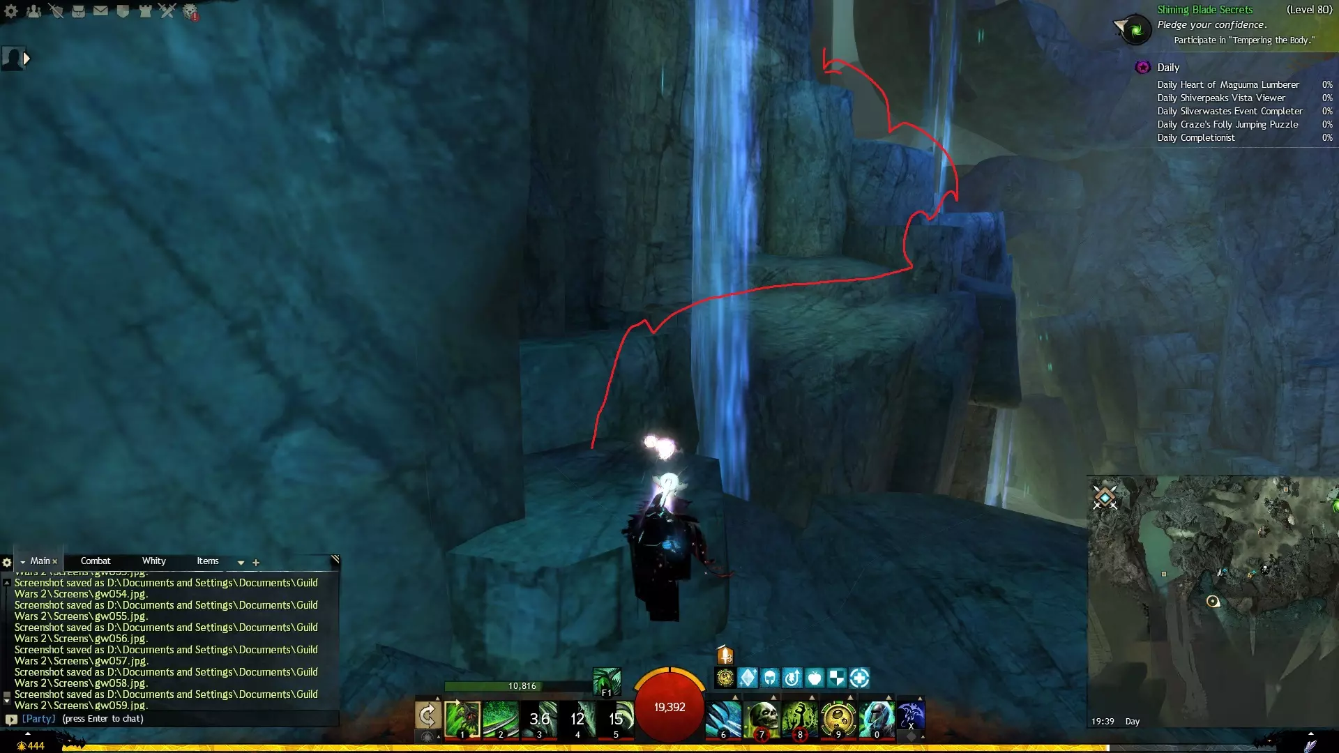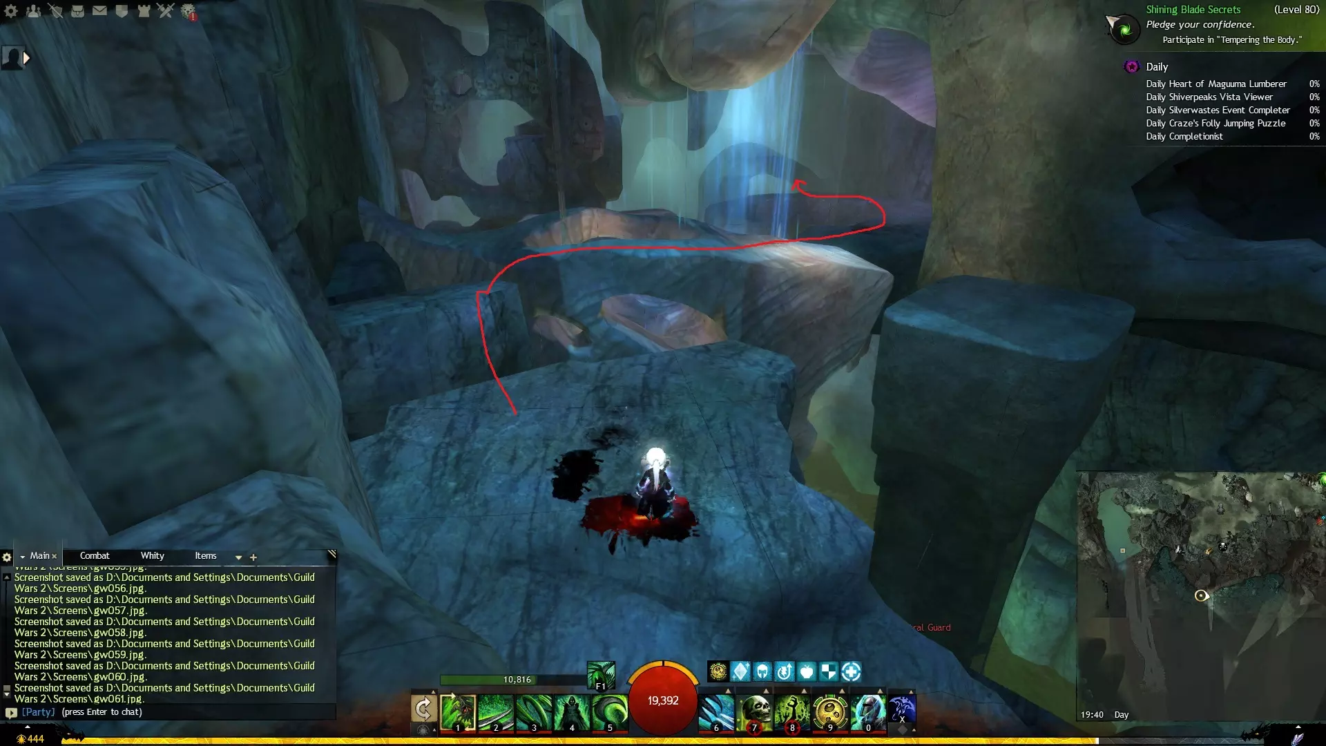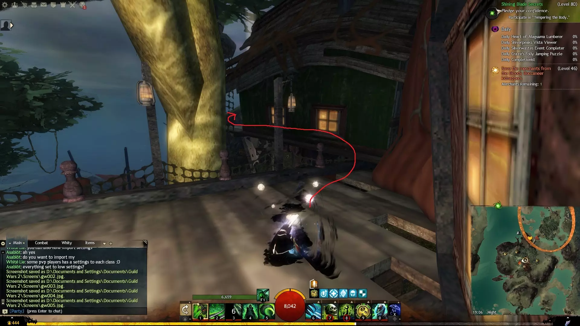 第一个技能位于血潮海岸区域的雷曼达盐沼传送点附近。当然还有大家熟悉的红线标出的小路。当我们看到技能点已经在我们下方时,就开始沿着楼梯向下走。
