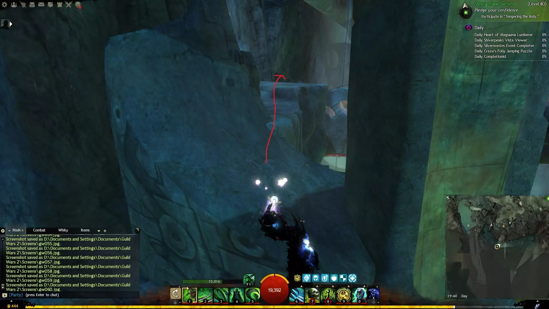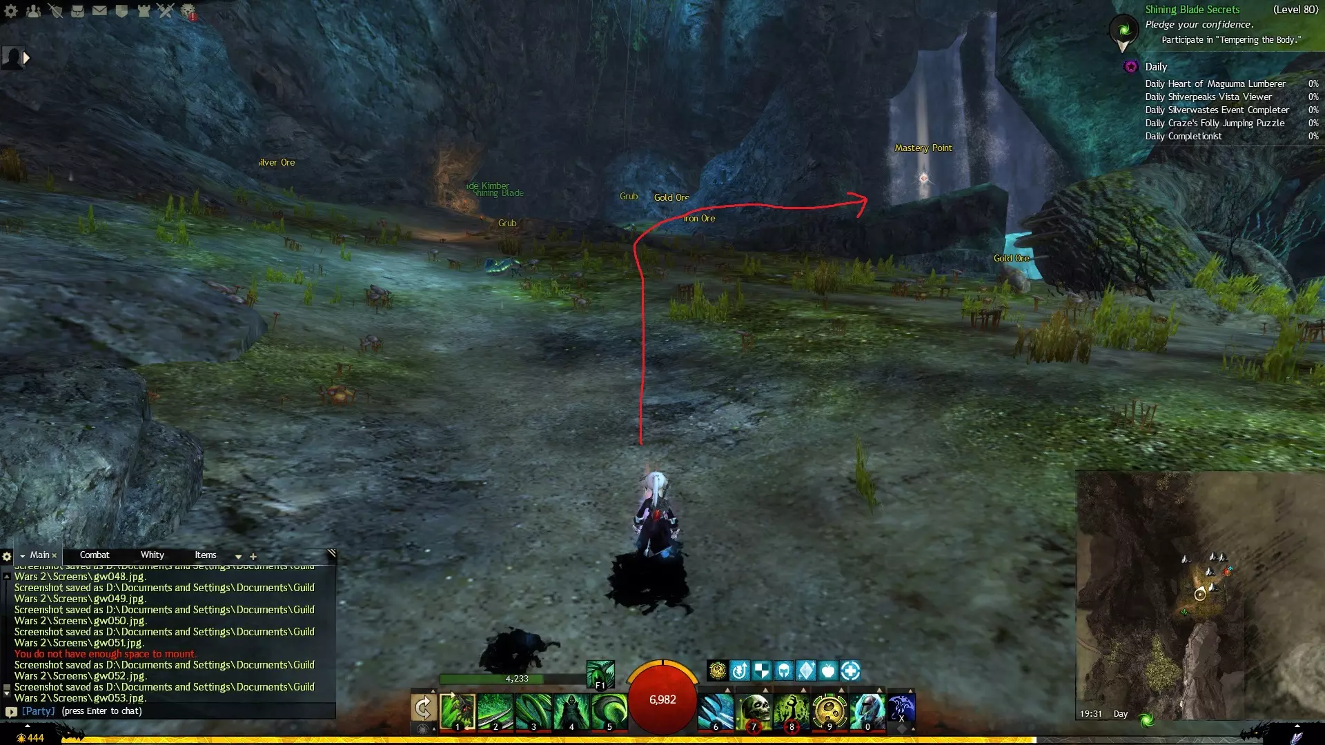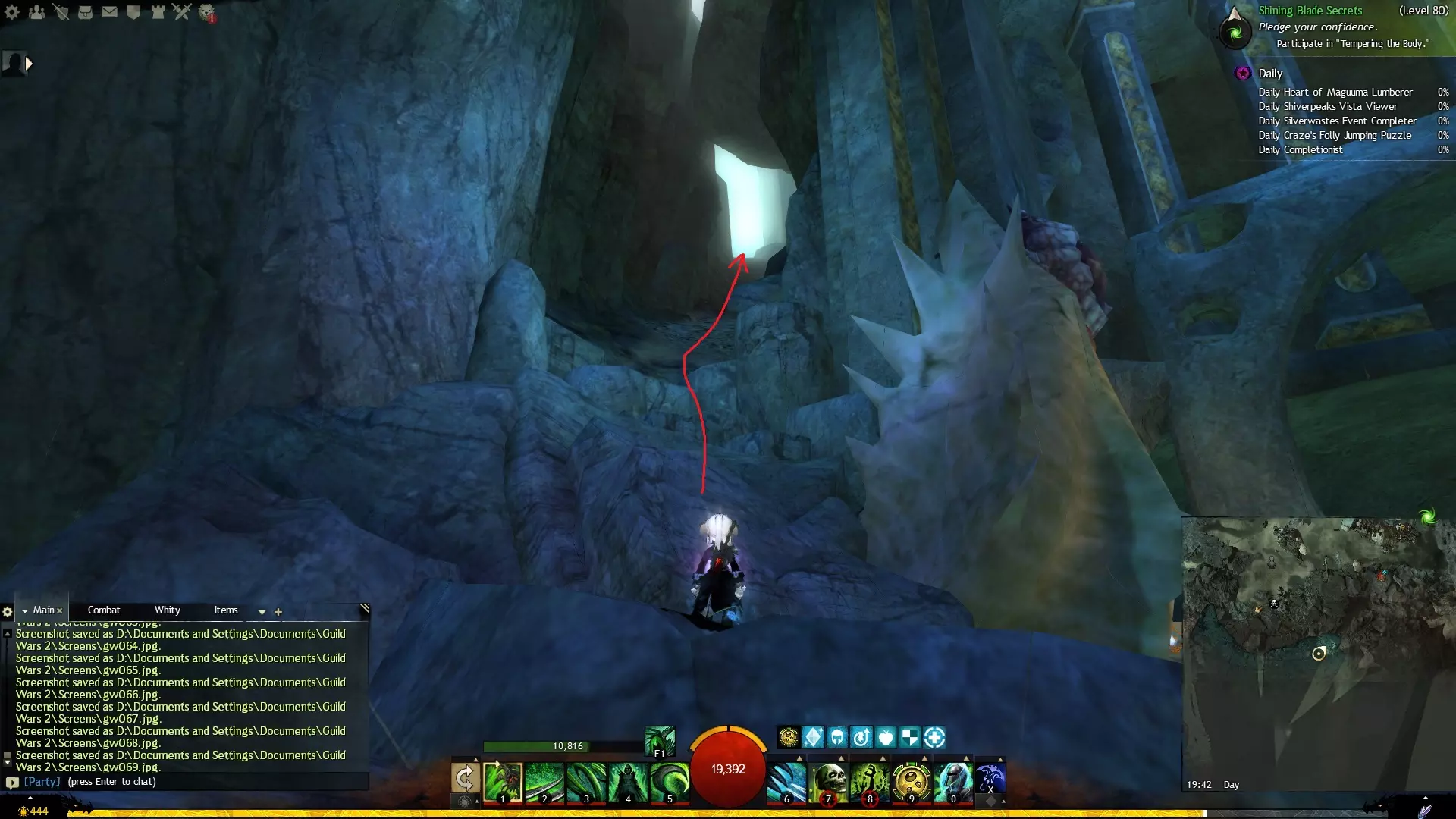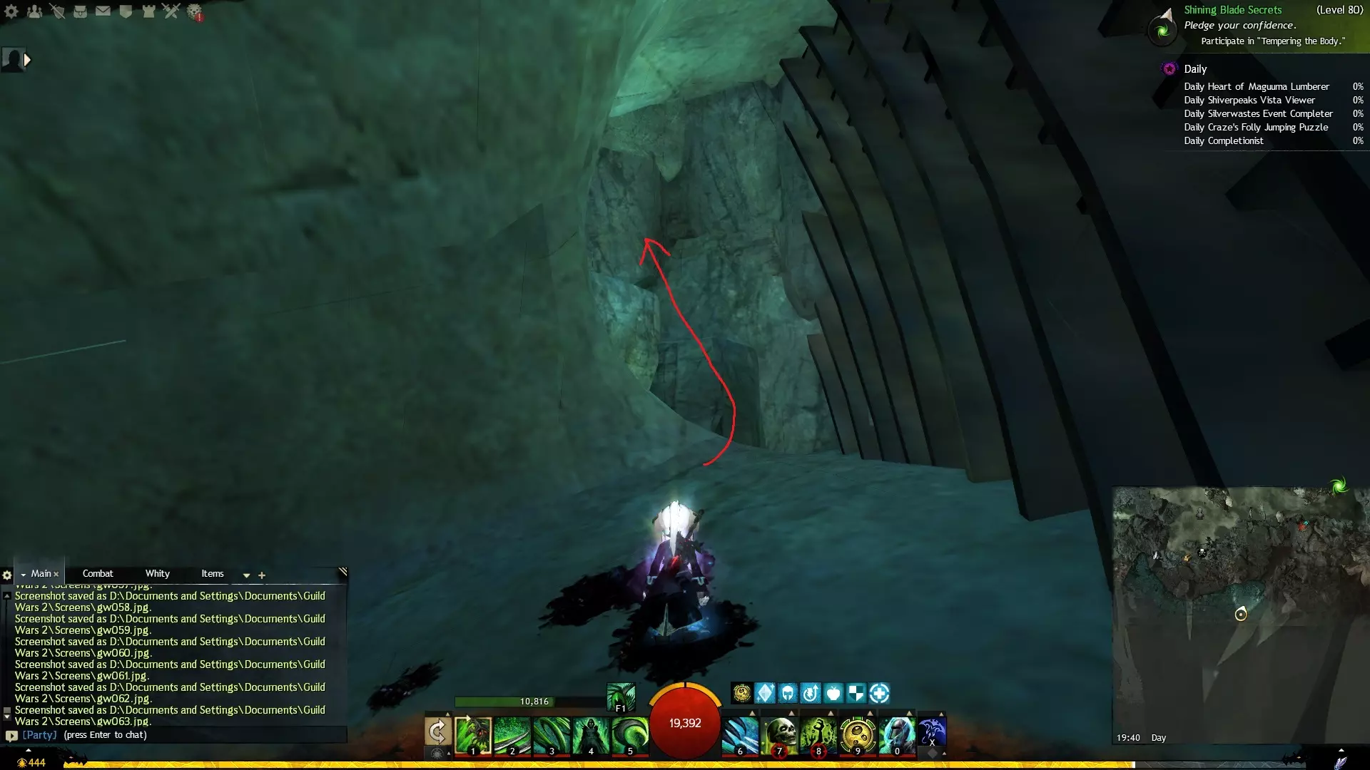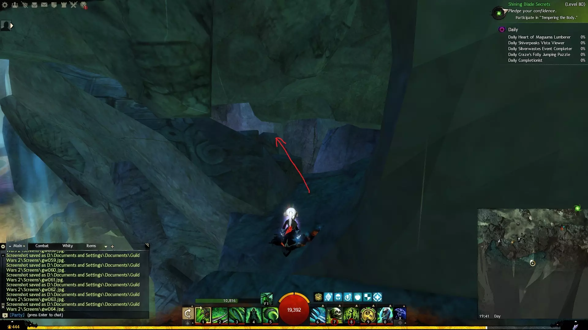 第一个技能位于血潮海岸区域的雷曼达盐沼传送点附近。当然还有大家熟悉的红线标出的小路。当我们看到技能点已经在我们下方时,就开始沿着楼梯向下走。