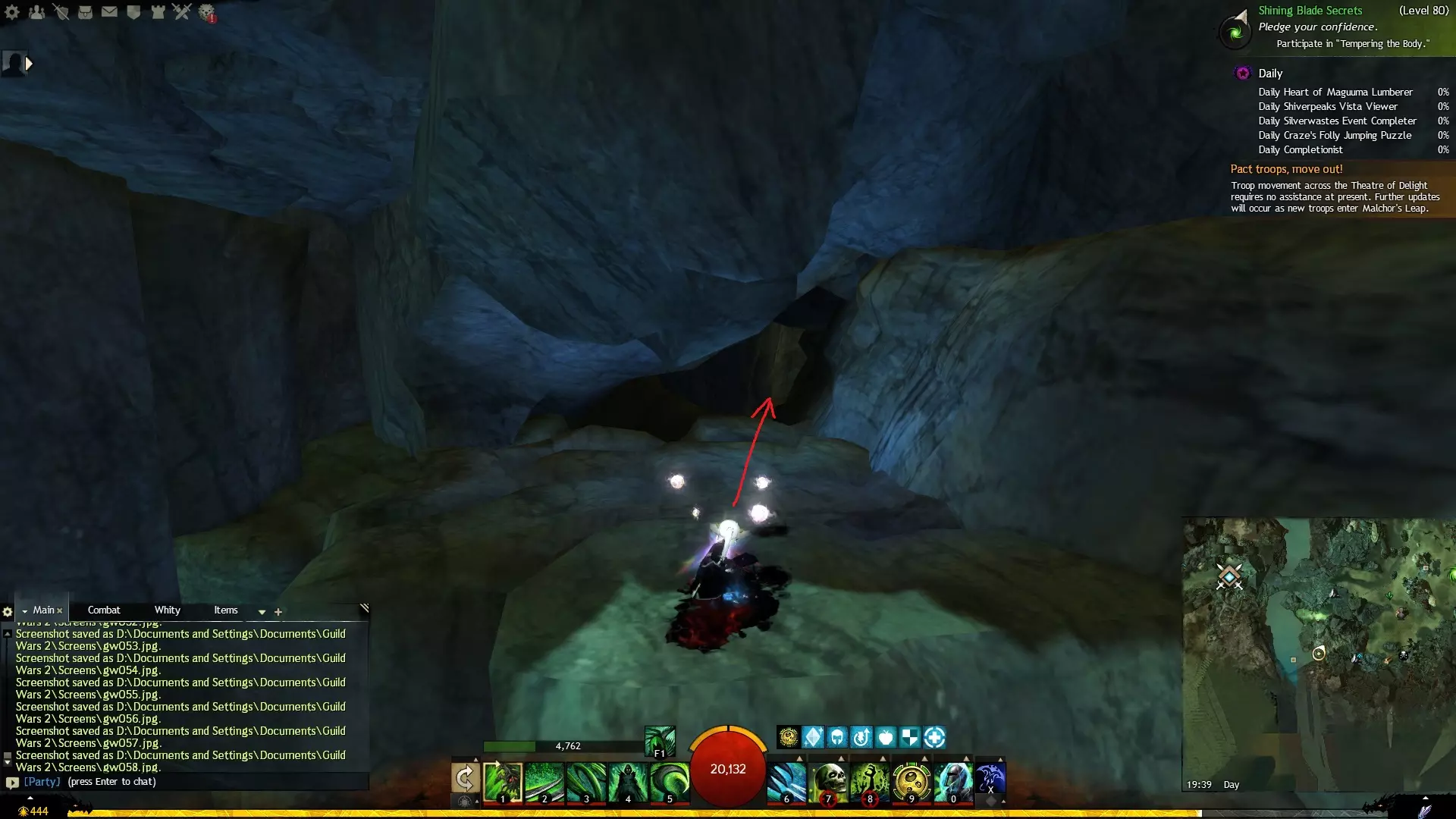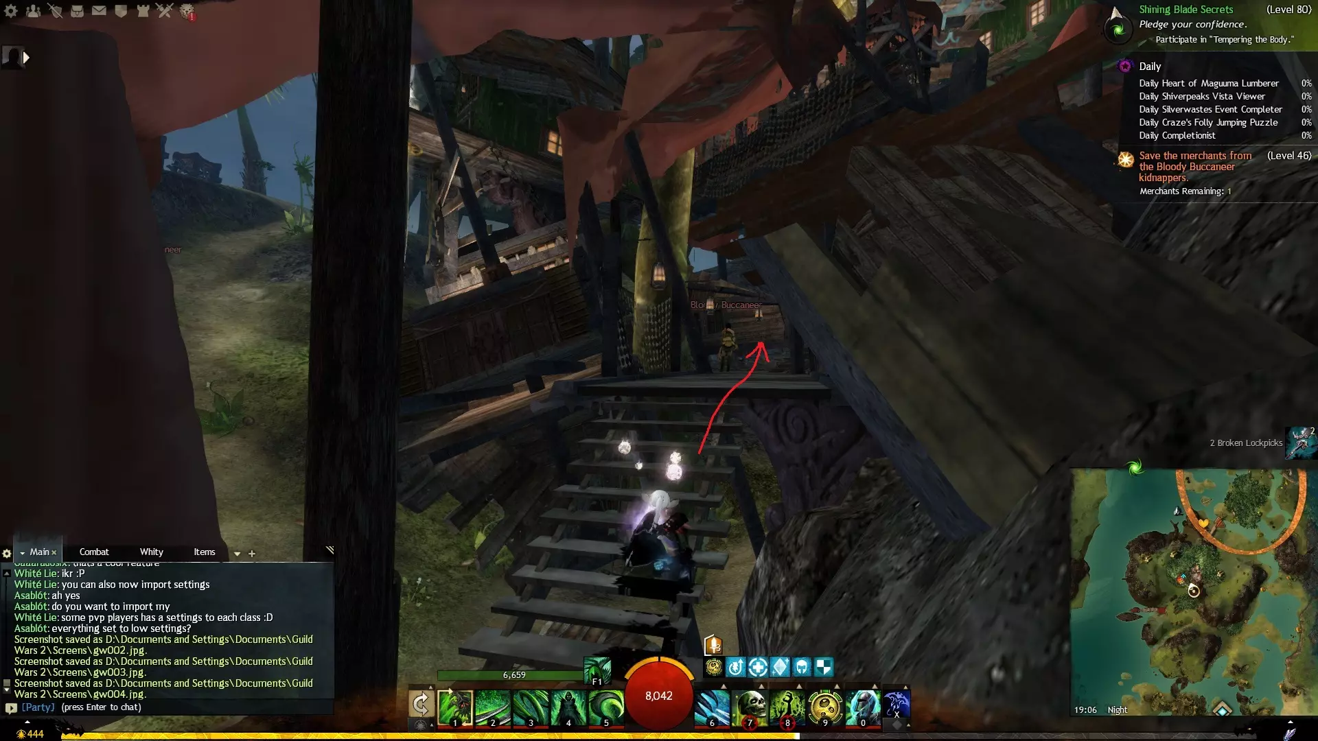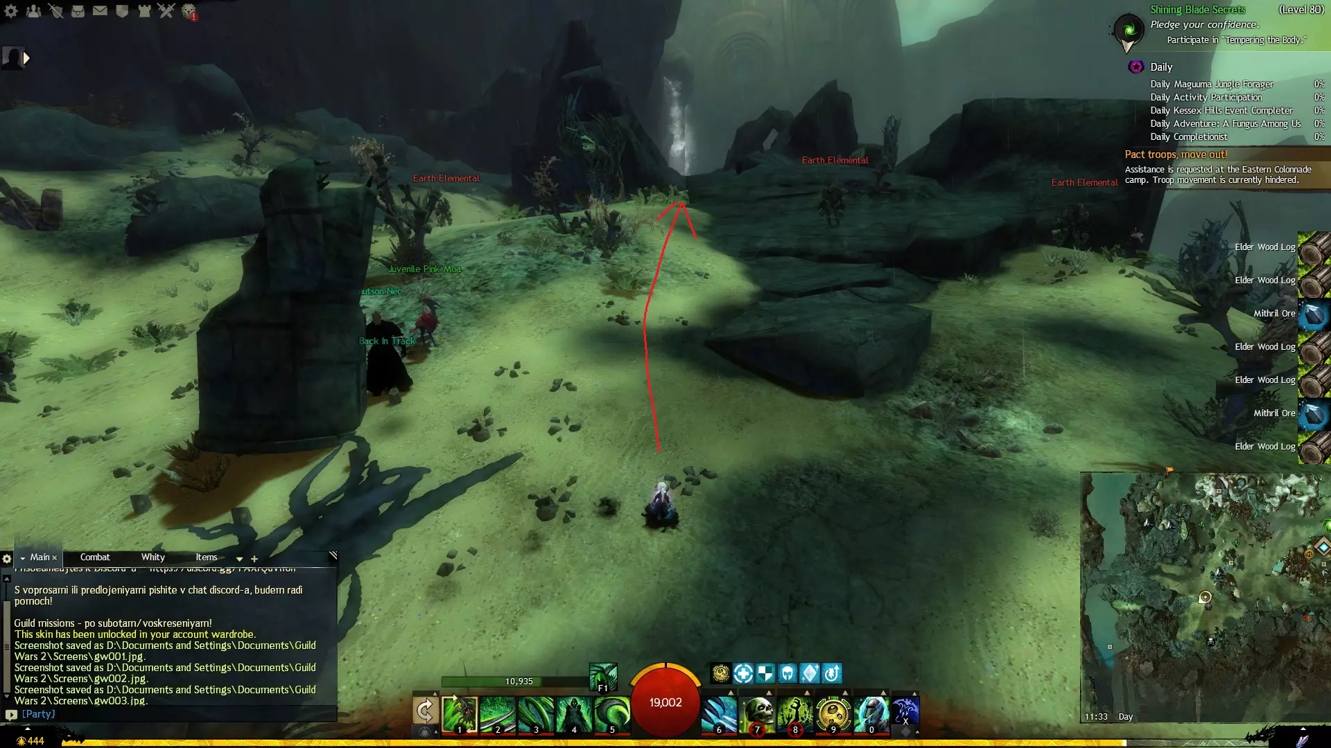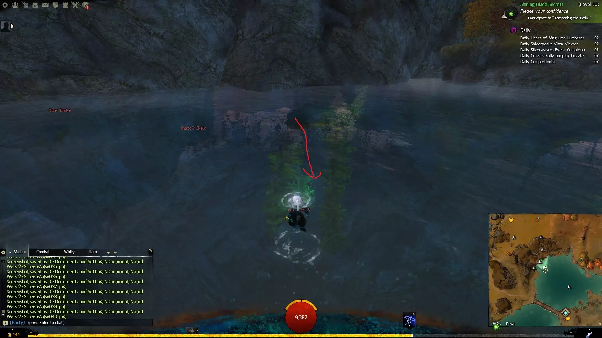 第一个技能位于血潮海岸区域的雷曼达盐沼传送点附近。当然还有大家熟悉的红线标出的小路。当我们看到技能点已经在我们下方时,就开始沿着楼梯向下走。
