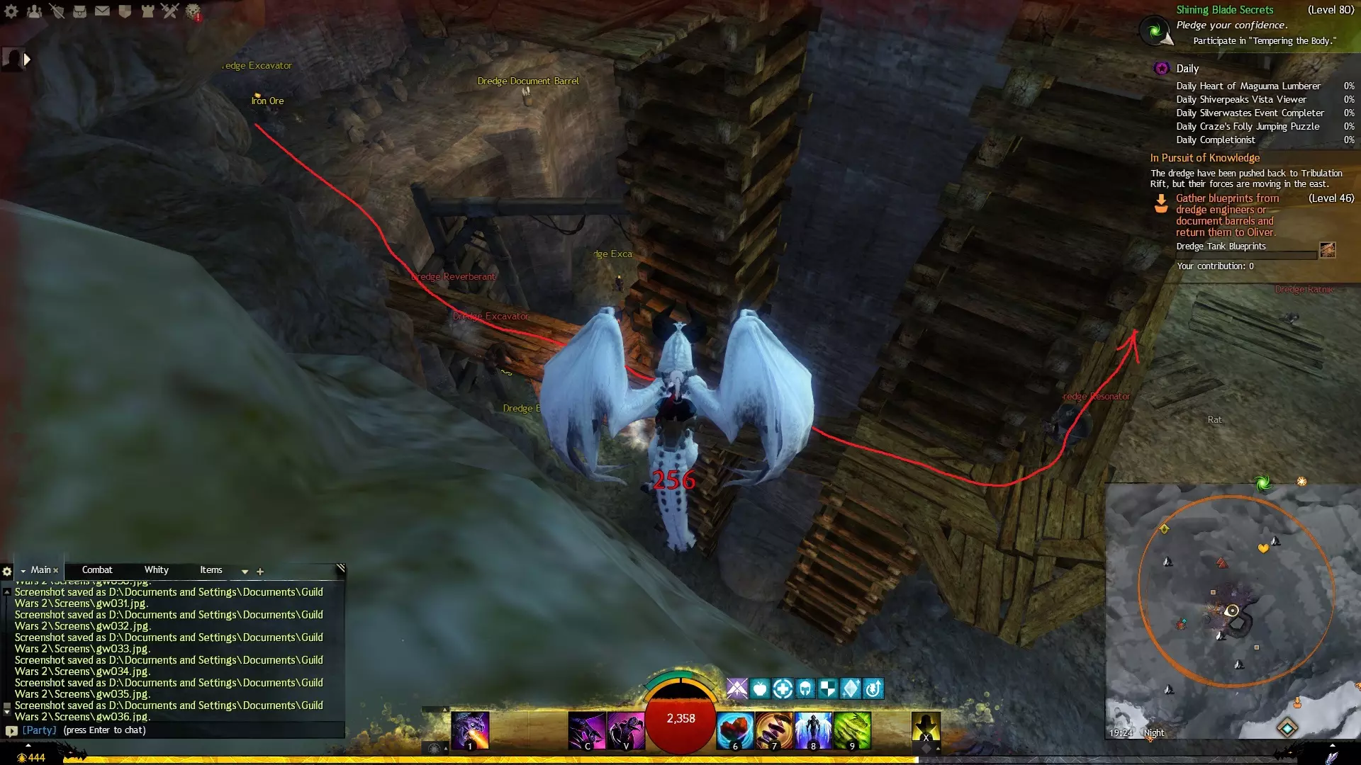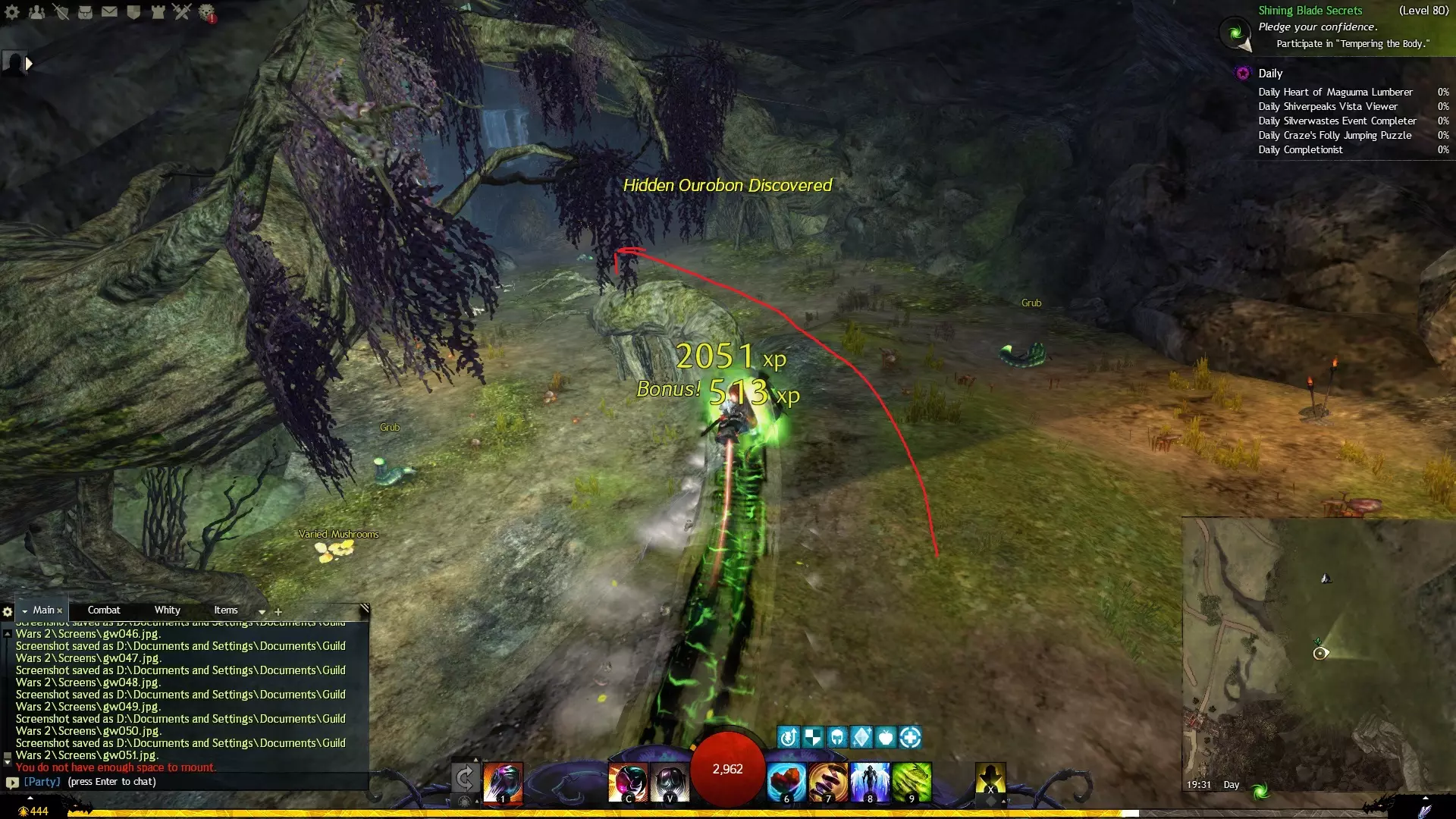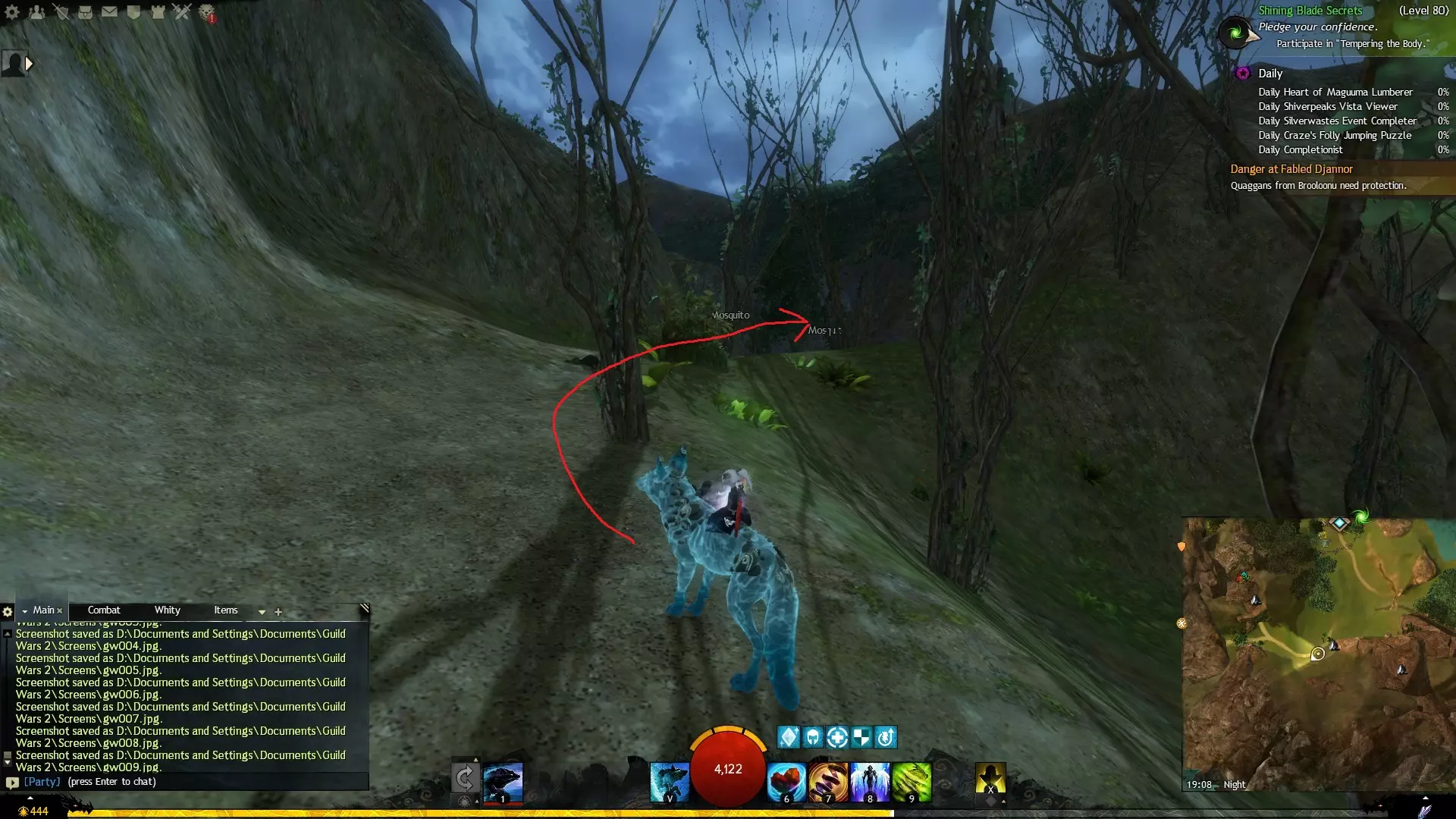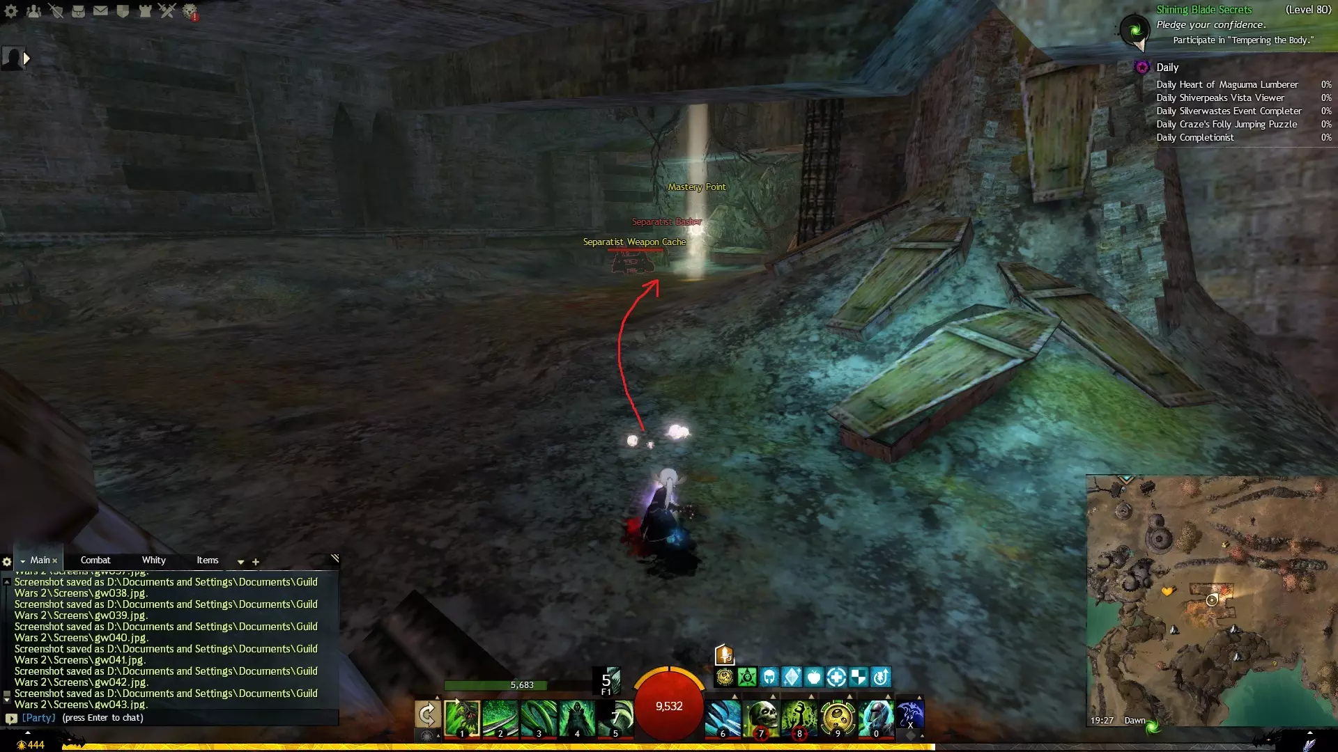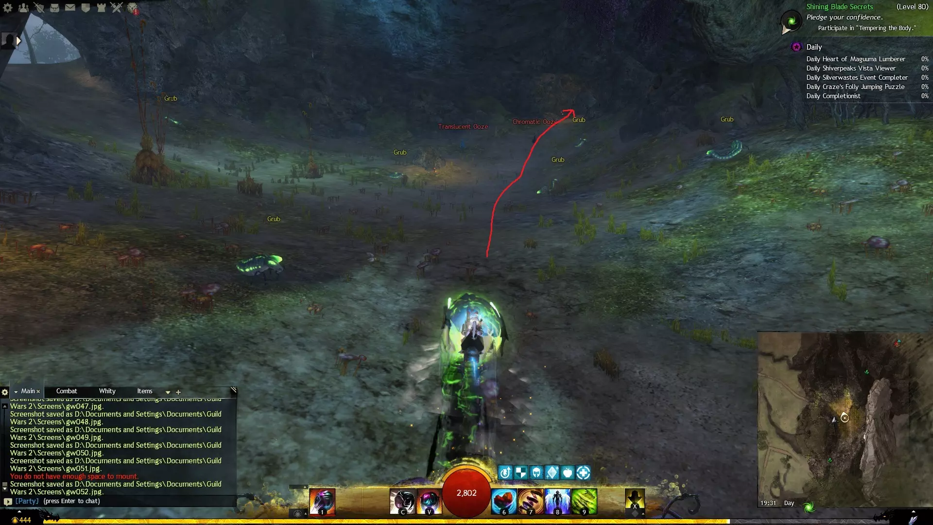 第一个技能位于血潮海岸区域的雷曼达盐沼传送点附近。当然还有大家熟悉的红线标出的小路。当我们看到技能点已经在我们下方时,就开始沿着楼梯向下走。