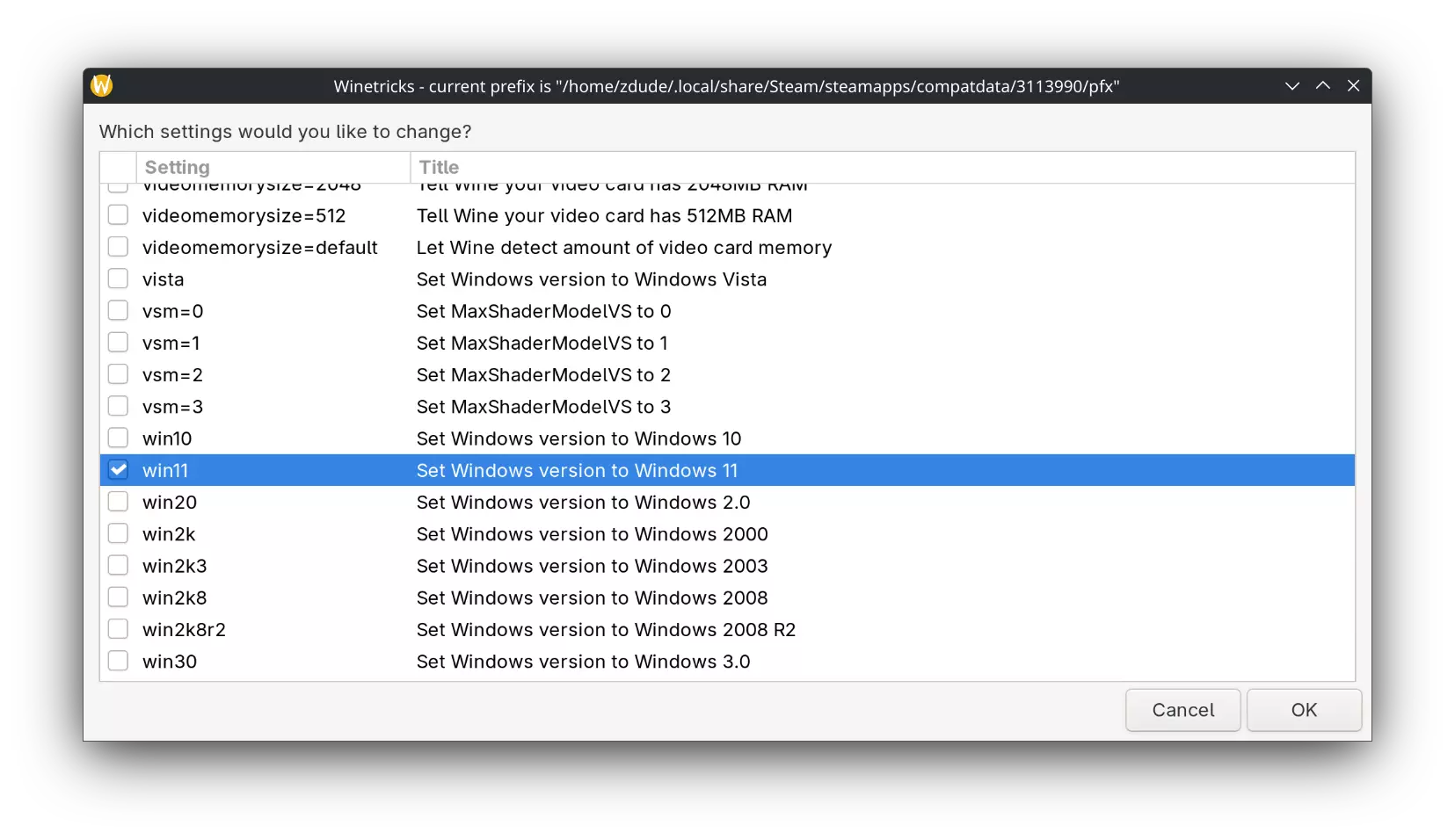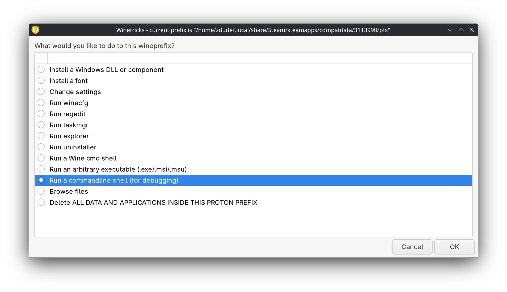 6(a) 将脚本(codec.sh)保存到以下位置: Steam Deck:/home/deck/Downloads Linux/其他系统:$HOME/Downloads $HOME 指的是你的主目录位置,与用户名无关。你可以在文件浏览器中手动输入此路径,它会带你进入 /home/用户名/Downloads。 7. 本指南要求游戏安装在内部存储中 - 预计安装时间:平均 2-6 分钟(±),具体取决于硬件配置 桌面模式相关:1(a). 你需要知道如何进入桌面模式,并且至少要会打开 Steam 和使用文件资源管理器(Dolphin) 为什么需要内部存储?2(a) - 这并非强制要求,只是为了简化教程步骤,减少说明文字。如果涉及 SD 卡,会增加额外步骤,可能会让部分读者感到困惑。后续会另作说明。步骤1:基础操作 打开Protontricks - 选择【GINKA】----> 进入下一界面 | 选择:"选择默认前缀" 选择以下选项: 更改设置 ---> "win11"