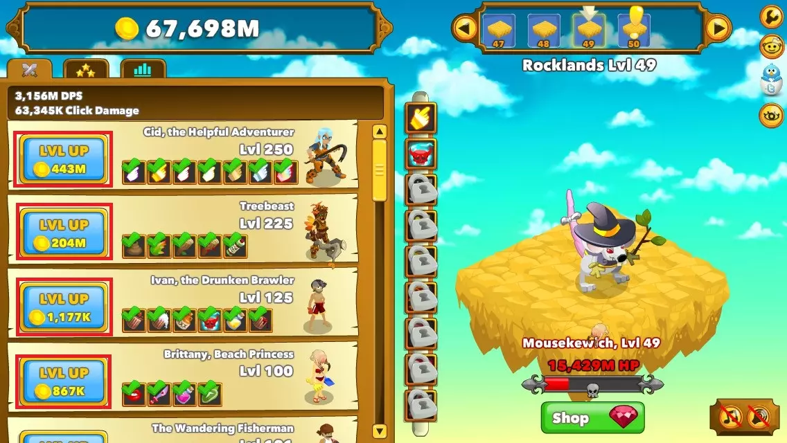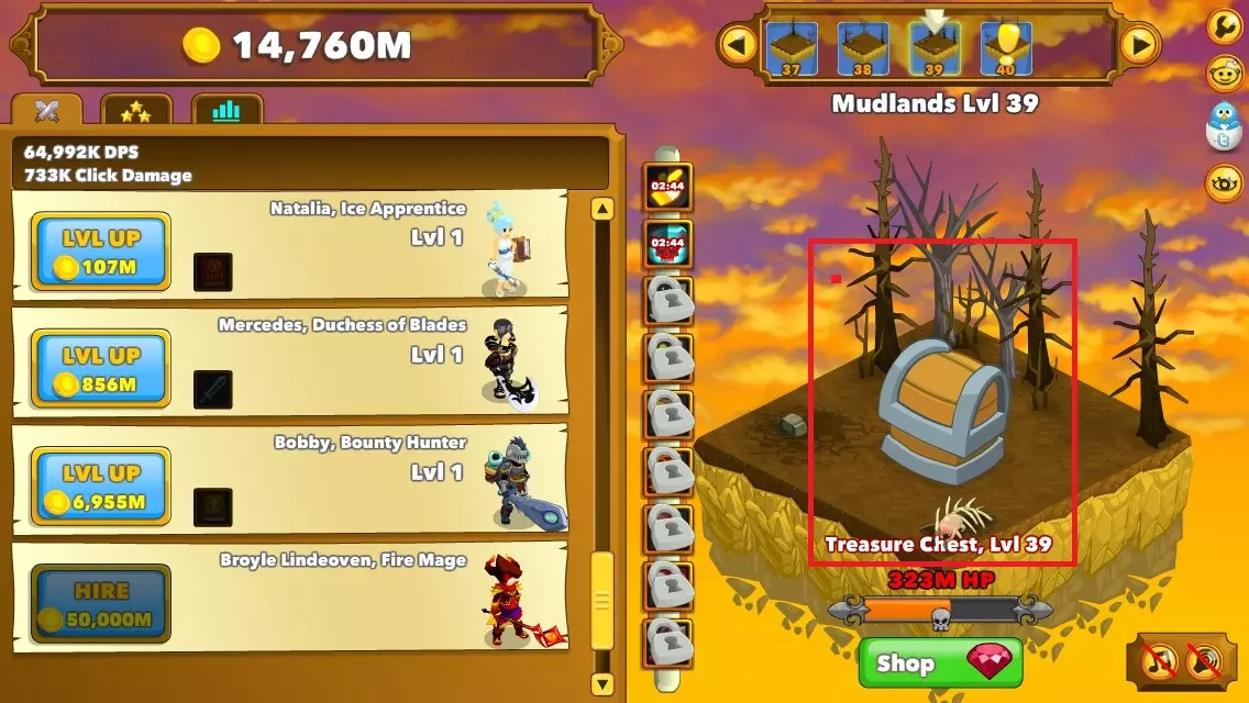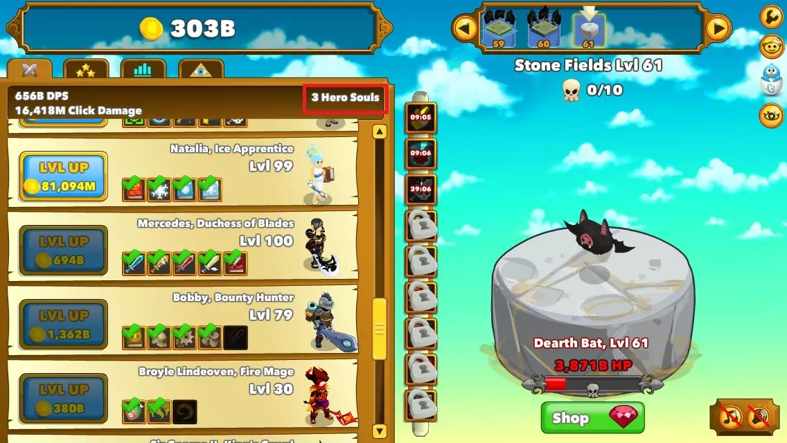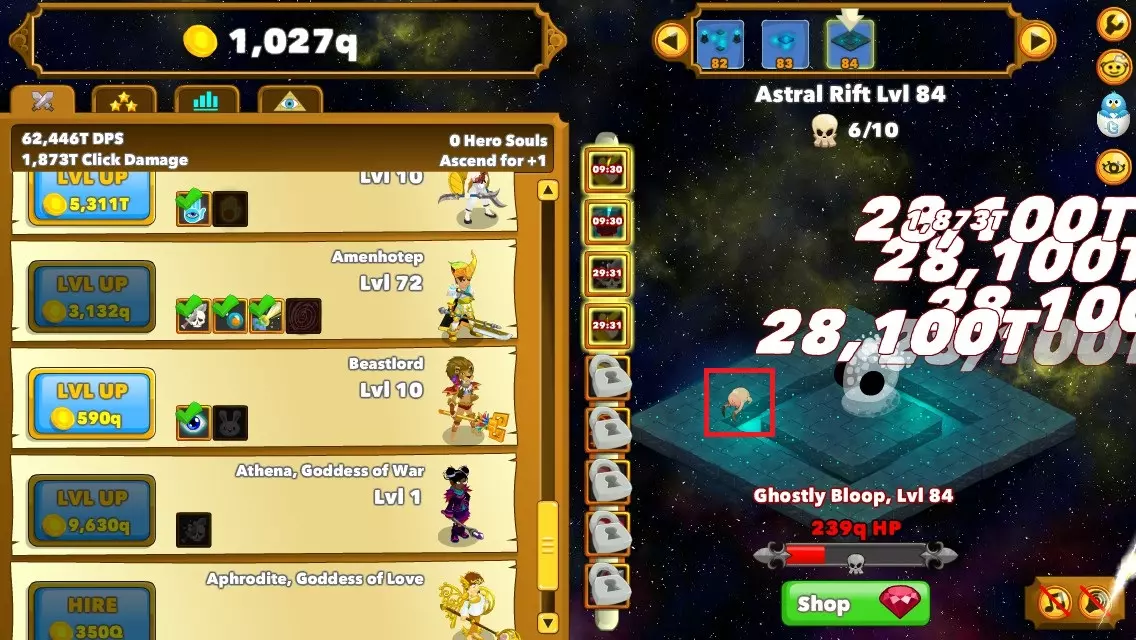 什么是英雄之魂? 英雄之魂是一种英雄的灵魂,每个单位可提供+10%的攻击力。此外,还可以用灵魂购买远古存在。 获取英雄之魂的途径: - 通过阿蒙霍特普的技能重启游戏后获得(每2000个角色等级可获得1个灵魂)。 - 在商店中花费50红宝石购买(最右侧的物品)。 - 击败特定 Boss 后获得。 图片中红色框内显示了英雄之魂的位置。