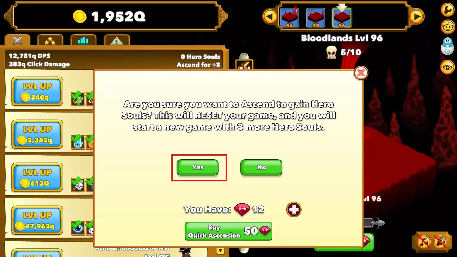 点击第四个技能后,会出现一个如下方图片所示的窗口。该窗口会显示重置后将发生的情况: 你确定要获取英雄之魂吗?游戏将进行重置,你将带着n个英雄之魂开始新游戏。 同意进行重置。
