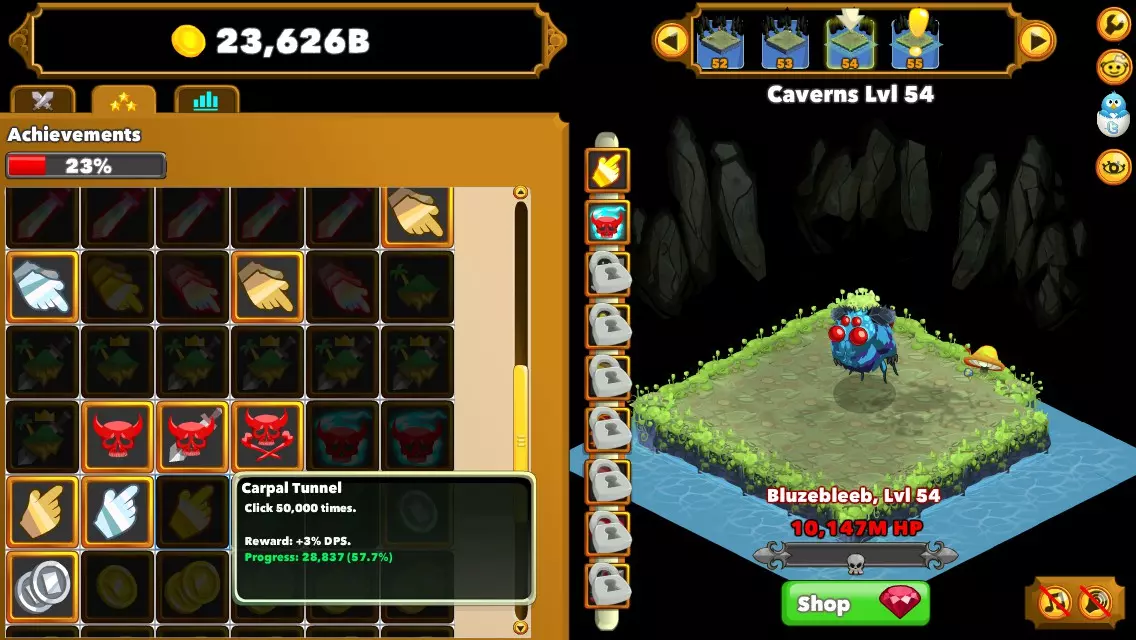Boss Genocide 击败100000个 Boss。 提示: Boss 出现在每第五个区域(5、10、15等)。可以通过让电脑整夜保持开启状态并停留在早期 Boss 区域来获取此成就,因为后期的 Boss 会更耐打,击杀所需时间更长,而早期区域的 Boss 几秒钟就能被击败。离线模式下 Boss 击杀数不会被记录。Boss也是怪物的一种,因此击杀Boss不仅会计入Boss击杀数,也会计入普通怪物击杀数。 通过特定数量的区域。 游戏中与该部分相关的成就共有17个。