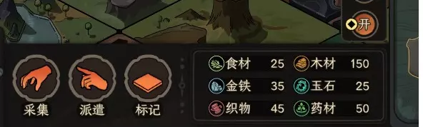 游戏开始后,当你离开初始山谷并访问第一个村庄,就将获得收集资源的能力。屏幕右下角的三个按钮用于资源收集。最左侧的按钮消耗1天时间从地格收集选定资源,第二个按钮派遣太吾村民每回合收集固定数量的资源,最后一个按钮用于标记地格。 世界地图上的大多数地格都包含一定数量的资源,可在收集按钮旁的右下角查看。山脉地格拥有更多矿石和玉石,农田地格则有更多食物等。每种资源的数量会在一年中的不同时间点逐渐恢复,而玩家每次收集会使资源减少约25点。高产量资源节点通常可以在村庄或城市附近找到,形式包括农场和花园等。我会先耗尽这些节点,然后再前往野外。 玩家采集: 每次采集行动获得的资源数量取决于土地地块上的资源量。我没有确切的公式,但似乎你可以获得地块显示数量的50%-75%左右,会有一些波动。 此外,亲自采集还有机会获得特定的 crafting material(制作材料),具体取决于资源类型。例如,采集矿石有机会获得用于物品制作的金属材料。获得机会也取决于土地地块的基础资源量,但要获得5-6级以上的材料需要非常好的运气。我通常只喜欢从资源量达到100以上的地块采集,因为任何低于这个数量的地块都不像是对我时间的良好利用。 村民采集 你也可以派遣村民前往地块采集资源,根据地块中的资源数量,一名村民每月回合大约能采集30单位的资源。虽然不算多,但作为被动收入也还不错。不过,这远不如第三种提升村民效率的方法高效。 注意:村民采集不会产出用于制作的材料,只能获得基础资源。 资源建筑 你可以在太吾村建造各种资源收集建筑,当我讲到村庄建筑部分时,会依次详细介绍每一种建筑。目前,要知道它们效率更高,并且有机会稳定产出制作材料。一旦你在太吾村进行了初始投资并拥有了相应资源,它们就会成为最佳方法。