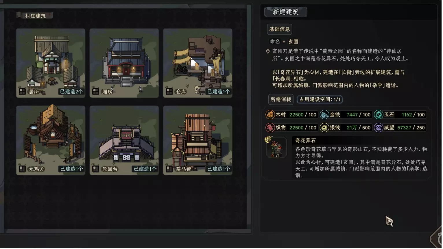 这些建筑提供住房或仓库等关键功能,以及后期商队等独特功能。它们会随着游戏进程逐步解锁,且各具特色,下面我将分别进行说明: 祠堂: - 你需要建造的第一个建筑,它会被动产生声望。你可以在该建筑中消耗声望来提升队员的属性(通过教导他们你已阅读的书籍,注意你无法教授特定技能,只能提升阅读书籍获得的修为)。你的年龄越大,能教导的内容就越多。 宿舍: - 用于安置村民,容量越大可容纳的村民越多。如果村民没有住所,他们的心情和对你的好感度将会下降。居所 - 相比宿舍,价格更高且空间利用率更低,但能提升心情,长期居住还会让村民更喜欢你。目前来看,其性价比不高,除非你确实存在严重的村民心情问题导致他们被附身,否则没什么用处。 储物间 - 用于存放物品,升级后可容纳更多物品。【注意】在任何村庄/城市/门派中,进入太吾村界面都能访问太吾村的储物间。 珍禽鸡舍 - 用于饲养你收集到的鸡。可以用蟋蟀喂养它们,如果鸡喜欢你,会为你的性格属性提供加成(通常没什么用)。我还没怎么研究这个建筑,但目前来看,不使用它也不会错过太多东西。转世平台 - 击败一定数量的剑冢后解锁,可将已结识的角色送去转世,其转世会继承部分前世属性,而你的太吾角色将获得所送角色极少量的属性。升级可以提供更多的转世选择(更好的转世路径只会让他们出生在更高等级的NPC家族或更正派的宗门,似乎不会影响属性奖励) 茶商队 击败一定数量的剑冢后解锁,可以派遣商队携带货物,这些货物将被交换为特殊的异域珍宝,它们可以作为不错的礼物,更重要的是,这是剑冢首领转世孩童唯一会接受的礼物。(注意:使用此建筑后,你需要记得让商队过一段时间回来,否则他们最终会耗尽补给而死亡) (不过多深入该机制的细节,在击败几个剑冢后,会生成限时遭遇战。在这些遭遇战中,你可以将已击败的剑冢 Boss 转世为他们的幼年形态。你可以通过赠送稀有宝物与他们成为朋友。当与他们的关系达到最大值时,你可以再次与他们的成年形态战斗,并帮助他们要么征服一切,要么陷入绝望。这会让你获得他们的一项技能,你可以在战斗中使用他们掉落的剑来激活该技能。(不过,过度这样做会导致你被附身) 资源建筑 资源建筑