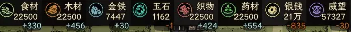 太吾绘卷的大部分经济活动都需要资源,因此我们将从这里开始介绍。在屏幕左上角,你可以看到当前拥有的所有资源。 从左到右依次为:食物、木材、矿石、玉石、布料、药材、金钱和威望。如果每月有该资源的增减,会在持有数量下方显示+或-以及具体数值。 可持有的资源数量由太吾村仓库等级决定。超出存储上限的资源将在月末损失。资源用于在太吾村制作物品以及建造/维护建筑。金钱还有额外的用途,即购买物品;而声望通常可以用来向他人换取技能书,而非购买。 由于金钱和声望的获取方式略有不同,我将先介绍基础资源。 收集资源