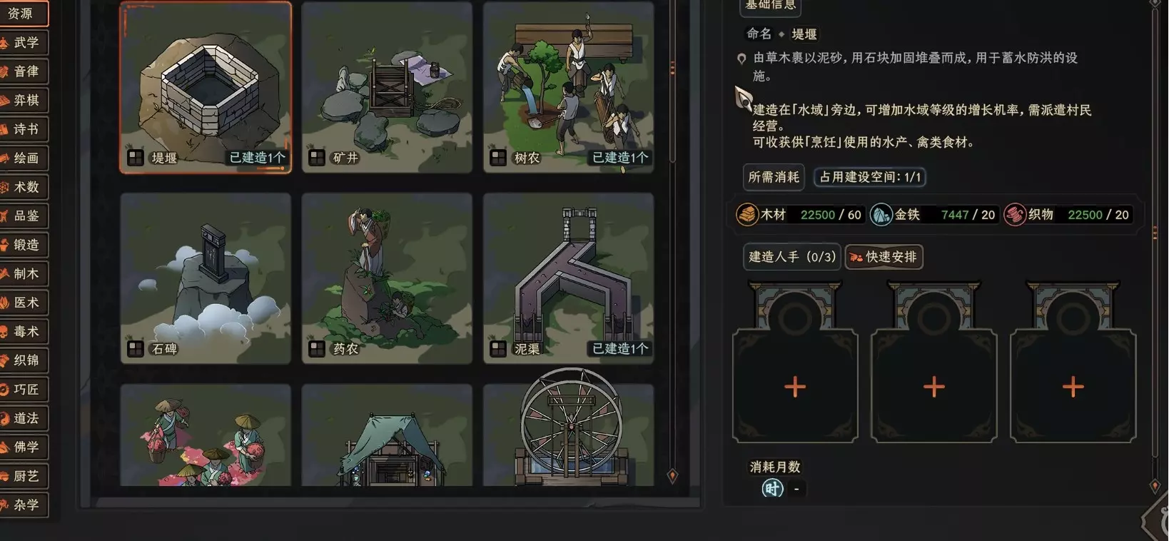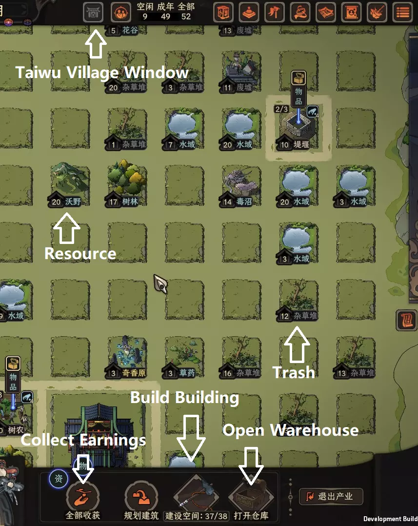 村庄资源 当你进入太吾村后,检查村庄可以查看你能获取的资源。你选择的太吾村地形类型会影响可获得的资源(内姆在“太吾绘卷新手开局指南”中已对此进行过解释,这里不再重复)。 资源大致分为三个等级:“垃圾”或灰色资源,它们的唯一用途是在被移除时提供一次性资源收益;标准资源为浅蓝色,是最有用的资源,因为可以立即建造对应的资源建筑;最后是稀有资源,为黄色,虽然一些顶级建筑需要它们,但我发现在当前阶段它们通常不是很有用,因为当你能够利用它们时,通常已经不值得投入精力了。资源依赖型建筑必须与资源相邻(斜向相邻不算)。因此你需要相应地规划建筑布局(不过在大多数情况下,多个重要建筑共享一种资源需求的情况非常罕见)。 每种资源都有一个大小,由资源名称旁的数字表示。资源越大,拆除时获得的资源就越多,且资源依赖型建筑的升级等级不能超过其依赖资源的大小。大多数自然资源会随时间增长,而矿物资源通常只有在其旁边建造了采集建筑时才会增长。村民 你初始会拥有一批太吾村民,他们将负责操作村庄内的所有建筑,其对应技艺的熟练度会影响建筑的效率。例如,木工建筑的效率取决于村民的木工技艺。更高阶或更高级别的建筑,都需要熟练度更高的村民来操作。 游戏初期,大多数村民的熟练度较低,但足以胜任初始建筑的工作。随着游戏的进行,你可以从门派或城镇招募有熟练度的NPC并将他们派往村庄。你也可以向村民赠送书籍,他们会通过阅读书籍来提升技艺,不过目前这需要花费大量精力。开发者确实表示他们正在研究一个能更好地帮助村民学习的系统,希望这个系统能尽快实装。 获取村民最简单的方法是解救被附身的村民,或者邀请与你关系良好的NPC。需要注意的是,剑冢的进度会限制可被附身或邀请到村庄的NPC,因此在一段时间内你无法获得高等级的村民。