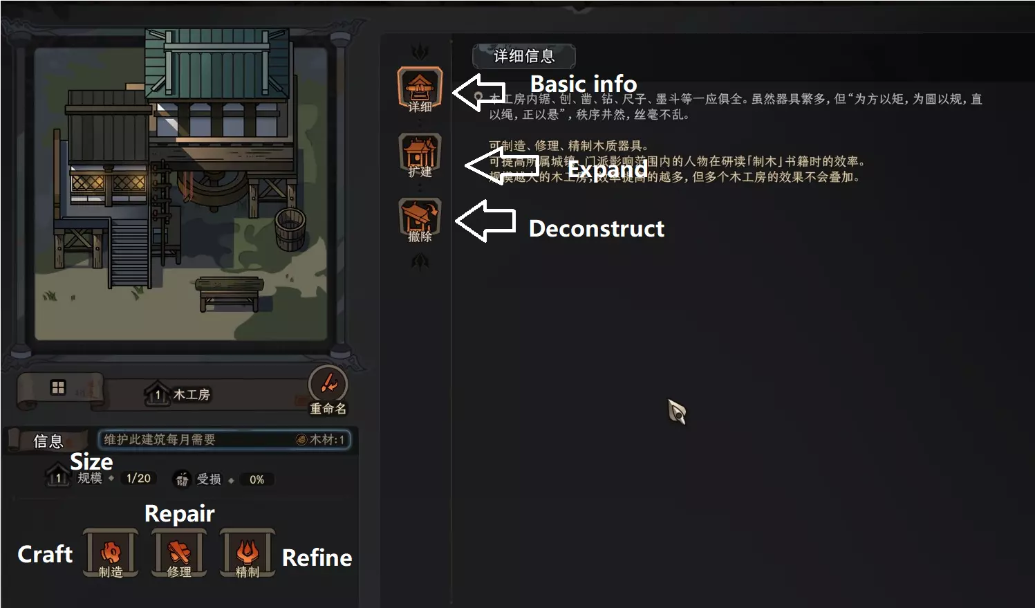 点击建筑会弹出建筑详情窗口。部分建筑可能不会显示某些选项。 大多数建筑可以扩建以增大规模,这会提升其被动效果,但也会提高操作该建筑的村民的属性要求(如果该建筑需要村民操作)。这种提升幅度较小,因此低阶资源建筑可以放心升级,而高阶建筑则应等到拥有熟练村民后再进行升级。 大多数建筑还有维护费用,如果未能支付费用,建筑会受损直至被摧毁。 村庄建筑 村庄中的建筑类型分为多个类别,下面我将依次介绍。