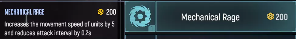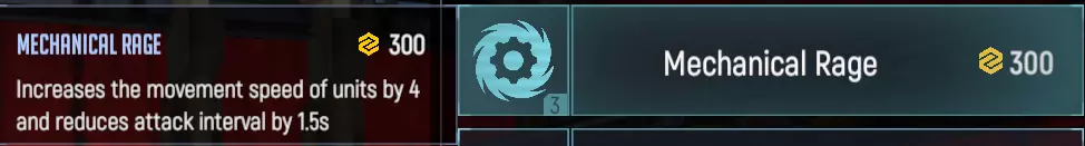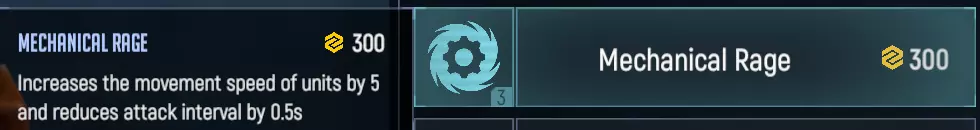将蜂炮的攻击距离增加40米。这项技术能让速度较慢的蜂炮提前向敌人开火,避免在前线受到伤害,从而显著提升蜂炮的输出能力和生存能力。不过,该技术在某些情况下也可能产生负面影响。例如,蜂姬可以远程锁定目标堡垒,并在很长一段时间内持续攻击其大量生命值,直到堡垒被摧毁。但即便如此,这项技术仍是蜂姬最受欢迎的技术之一。 机械狂怒