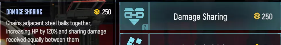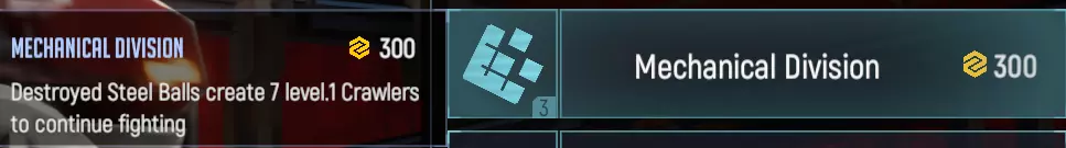 将最大生命值提升120%,并将附近的球体相互连接,使它们能够共同分担所受到的伤害。 采用与坦克相同的技术,容易被敌方的熔毁点和球体摧毁。不过,与坦克不同的是,钢铁球体拥有更高的生命值,因此整体生命值水平远高于坦克。除了钢铁球和熔毁点,没有任何东西能有效摧毁相互连接的球体。因此,与坦克上作为王牌使用的伤害分摊不同,球体上的伤害分摊可以作为一种常规技术使用。需要注意的是,如果使用这项电磁弹技术向钢球射击,会先造成伤害,之后才会使额外生命值和伤害分摊效果失效。因此,完全升级了各项技术(包括电磁射击技术)的坦克将能够摧毁同等级完全升级了技术的钢球。 机械师分部