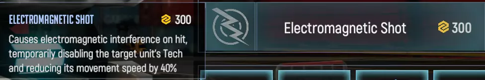 对受影响的敌人施加电磁干扰,禁用其科技数秒并使其移动速度降低40%。在对抗拥有大量科技的高价值单位时效果显著。Charged Shot