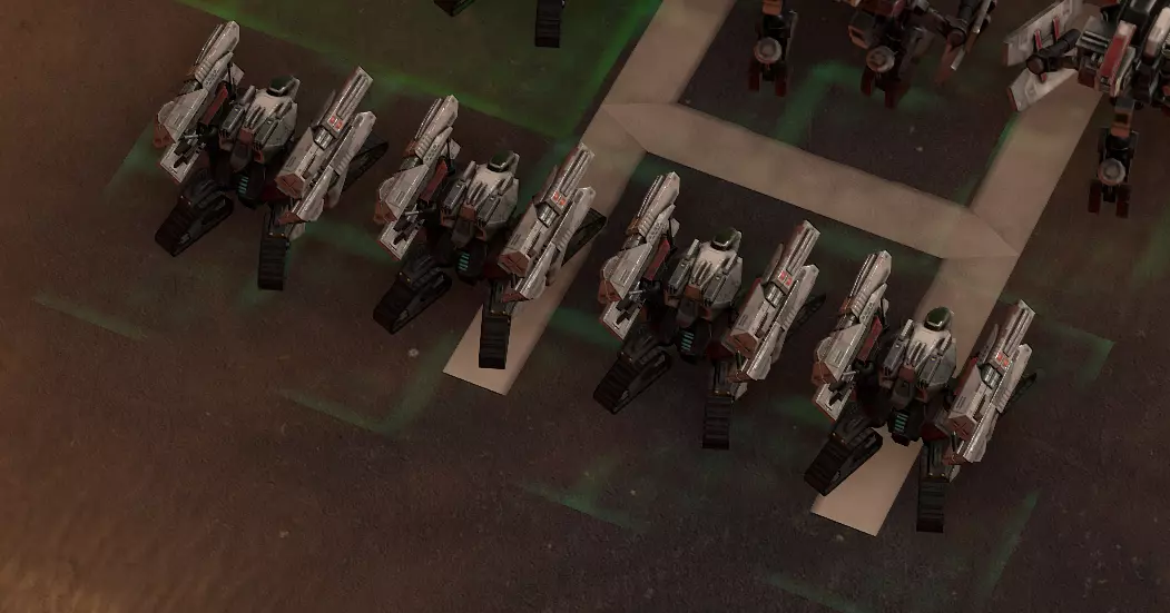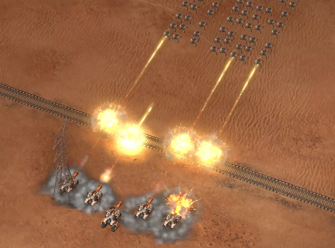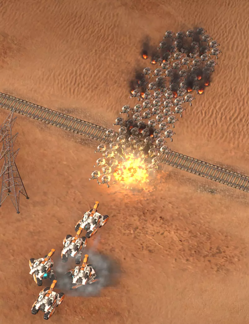 对受击目标施加电磁干扰,暂时禁用其科技数秒,并使其移动速度降低40%。 在对抗高科技含量的昂贵单位时效果显著。 存在三种坦克使用方式:1)对抗小型单位 2)支援前线 3)造成主要伤害坦克的特性相当普通。它们不像【钢铁球】那样拥有高额生命值和单体高伤害,也不像【野马】那样具备高射速和出色的模型,更别提【犀牛】的强大了。坦克看起来确实没什么冲击力,但它们真的有那么弱吗?恰恰相反,坦克在早期和中期阶段是极其强大的单位。毫不夸张地说,坦克是游戏前五个回合中最具压制力的单位。 坦克的优势在于其通用性。它们最出色的一点是几乎适用于你大多数的战术。无论你采用何种玩法,坦克都始终是不错的选择。 作为范围伤害单位,坦克最大的优势在于其模块数量——一包有5个,这是其他任何范围伤害单位都无法比拟的。因此,面对大量分散的敌方小型单位,坦克的多模块特性使其能够同时锁定多个位置的敌方小型单位,从而能够比敌方更快地消灭这些杂兵。此外,坦克体型较小,因此可以随意部署,且不会影响其他单位的移动(因为其他中型和大型单位可能会阻挡坦克,而坦克不会阻挡它们)。 7:坦克(2) 横向部署的坦克由于单位模型尺寸原因,将保持其阵型形状。这样可以对敌方横向排列在坦克周围的小型单位造成大量伤害。如果将坦克纵向排列,那么前方的坦克会首先开火,而后面的坦克会向它靠拢,最终形成同样的横向阵型。不过此时坦克将进行持续的轮流射击。需要注意的是,在这种情况下,大多数敌方单位会聚焦于你的前排坦克,因此它会很快被摧毁。不过,这也有其优势,因为有时很多敌人会对着已经被摧毁的坦克额外射击(例如,【凤凰】)。