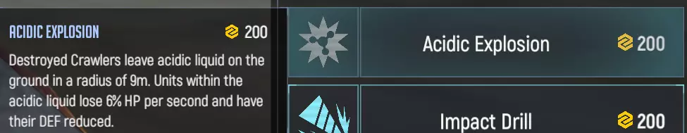 这项技术能让爬行者死亡后在九米范围内泼洒酸液。酸液会在整轮游戏中持续存在,直到回合结束后消失。站在酸液上的单位每秒会损失6%的最大生命值,但酸液对友军同样造成伤害。这项技术取代了爬行者的燃烧机制(是的,爬行者以前会燃烧),使其能够对抗生命值较高的单位。冲击钻