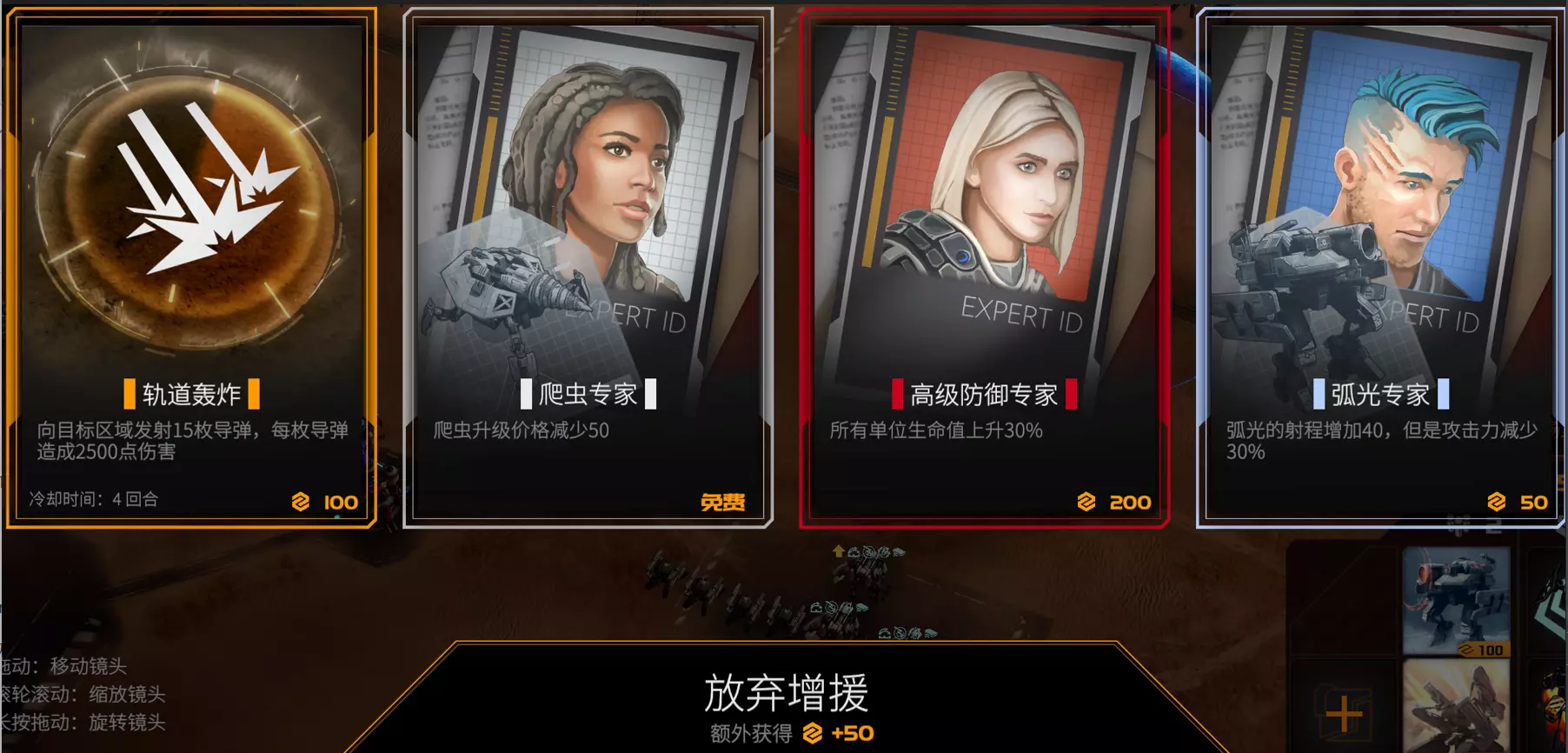 此外,如果你的初始专家给你3级狙击手,且初始单位组合中其他单位类型不是狙击手,那么在游戏开始时,你将解锁可招募的单位类型包括组合中的2种单位以及狙击手。犀牛属于T1.5单位,解锁成本为0。黑客属于T2.5单位,解锁成本为100。犀牛、黄蜂和黑客不在初始单位组合中。6:单位的购买、解锁与部署