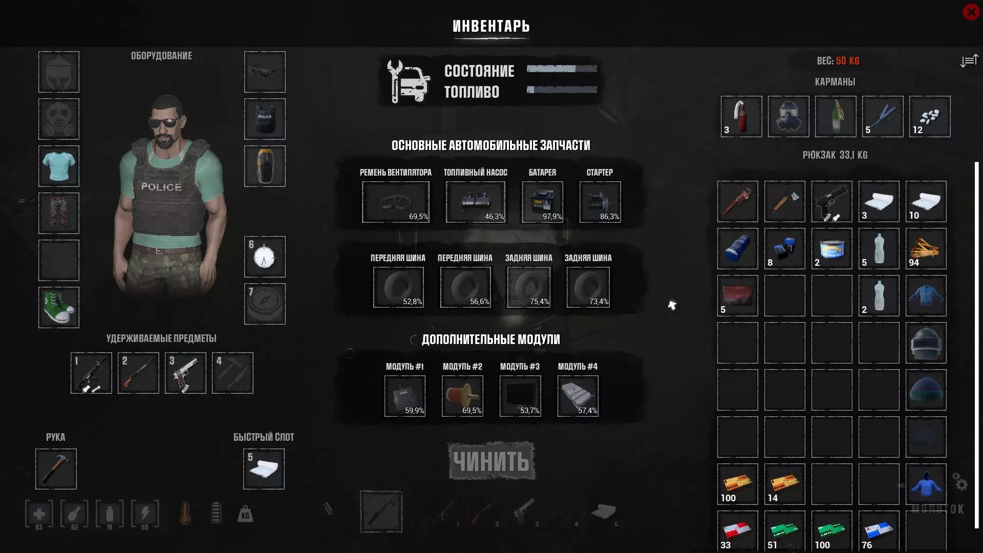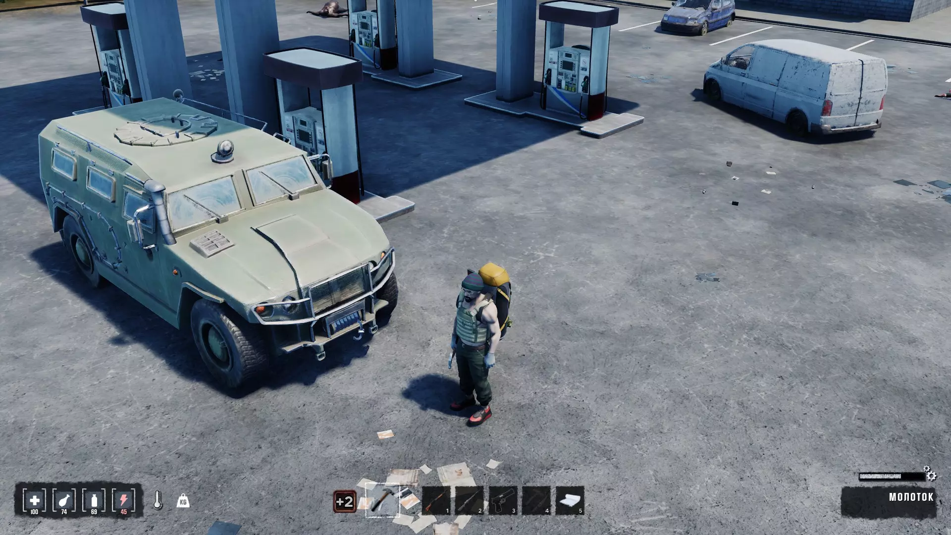 交通工具首先能帮助你更快地在世界中移动,并且轻松携带沉重的货物。 要使用汽车,首先点击引擎盖,需要找到并放入4个主要零件、4个车轮以及汽油。像蓄电池这类零件可以在汽车的后备箱、部分其他车辆的引擎盖下,或者在特殊货架上找到。几乎每家每户附近都有商店和车库,而且拆解汽车(比如“六缸车”)获取金属时,你也可能得到例如蓄电池之类的物品。轮胎也可以从其他一些汽车上拆下来(那些能打开引擎盖的车,通常看起来更好一些),或者在汽车修理店找到,也可以从商人那里购买等等。我们可以在加油站将汽油倒入汽油桶,或者用软管从其他车辆抽取汽油,然后从侧面加注到汽车油箱中。 此外,还可以用那些机油和烈酒来制作汽油。为此,需要种植土豆(我们会吃掉一部分土豆来获取种子,以便再次种植)。最初可以在很多地方找到土豆种子,但在温室里,它们可能会更多地散落在地上,没有包装。技术油是在脂肪转化器上用脂肪制成的,所以应该去猎熊(不要射杀它们),每只熊会掉落15个脂肪。制作烈酒的水不一定必须是100%纯度,瓶子里有1%的水就足够了,所以下雨时收集所有空瓶子,从雨水收集器获取水,无需消耗水。 修理车辆需要修理工具包。可以通过按Tab键打开菜单制作,或者在开放世界中寻找。初期最稀有的是齿轮。齿轮可以通过在熔炉上熔化铁矿石获得铁锭后,在工作台上制作。此后,无法制作的螺丝刀变得稀有。