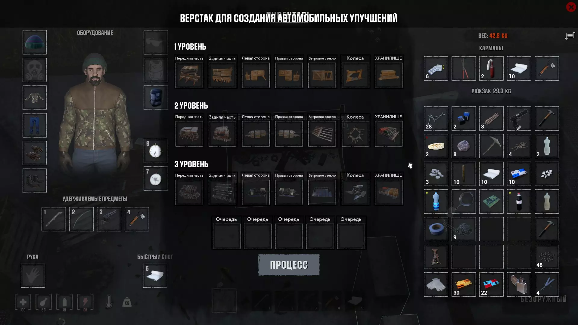 如果你的座驾不是名为APC的顶级装甲军用卡车(我建议你找这种车,因为它不需要也不能加装装甲),那么你就得在专用工作台上给你的车加装2级装甲进行大幅升级,因为即使是一小群僵尸也可能对它造成严重损坏。顺便说一下,装甲越野车很难被打坏,但用维修包修理它的效果非常非常差(完全修好大约需要10-15个维修包)。顺便说一下,所有车辆的列表可以在本指南中找到。
