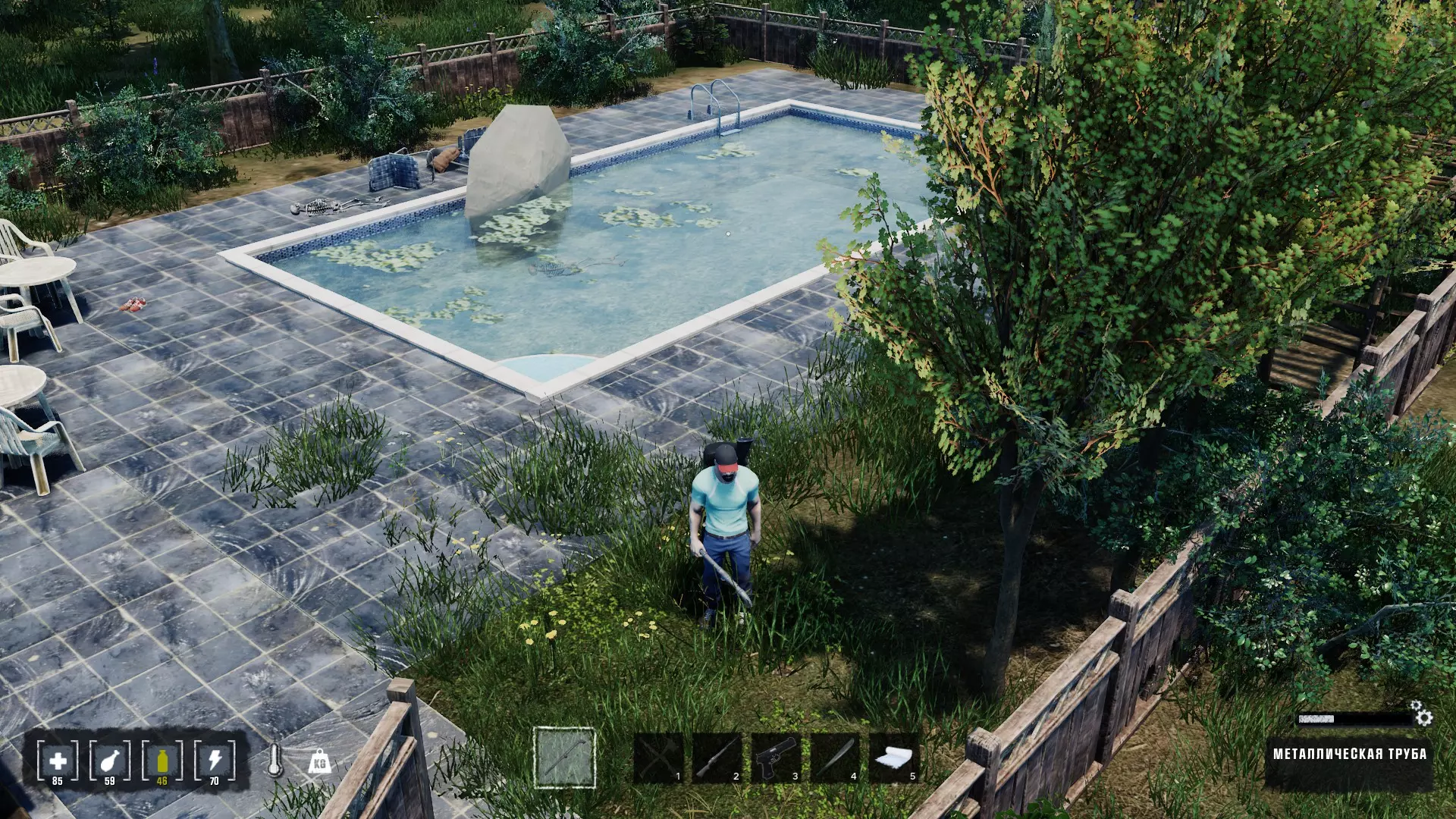 食物方面通常一开始都没问题,在任何房子的厨房等地方都能大量搜刮到。但水的短缺问题一开始会严重得多。某些食物(带有水【瓶子】图标)也能补充口渴值。最有效的水源之一是用鱼竿钓到的鱼(可恢复+19口渴值)。我们可以从能用任何切割工具砍倒的灌木丛中收集蠕虫(作为鱼饵)。鱼竿可以在游戏中找到,或者在Tab菜单中自行制作。此外,水也可以通过浆果(+10)、番茄汤或罐装金枪鱼等物品获得。最后,喝下浑浊的啤酒后,要安装雨水收集器(注意不要放在屋顶下)。如果在开放世界中找到储水桶,就可以用它来储存水。 顺便一提,开宝箱时一定要扔掉所有不需要的战利品,并将宝箱完全清空。过一段时间后,这里的战利品会刷新,届时可以回到这个地方。 脏水可以装在瓶子里,在任何火源上免费煮沸,也可以使用净化药片。许多房子里都有壁炉和 stove,在野外环境下可以用来煮沸水。 到了后期,当你不再随意搜刮所有东西时,就会产生对食物的需求。最好用在工作台上制作的铲子来开垦菜园。种子要么在开放世界中获取,要么在你食用蔬菜时掉落。使用肥料确实能加快生长速度,但不使用肥料也完全可以,产量本身就足够了。 只能在特定季节种植,冬天肯定什么都长不出来。最好将收获的作物直接存放在田垄上,因为它们不会自动堆叠,而且还会腐烂,占用很多空间。如果想收获一部分作物(不是全部),只需在背包中留出几个空格。可以根据需要用蔬菜和肉类制作罐头。另一种不错的食物是烤肉或腊肉(在专用架子上腌制)。获取肉类需要任何一把刀。背包的负重会极大影响耐力,战斗开始前或使用工具工作前,最好将耐力保持在100点。使用能量饮料可以在一段时间内提高耐力。 武器与战斗