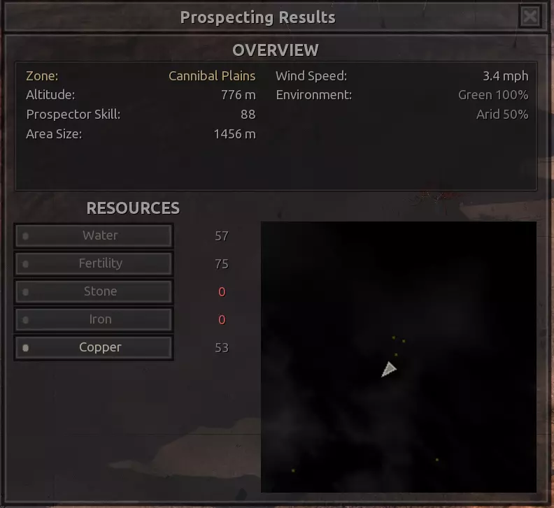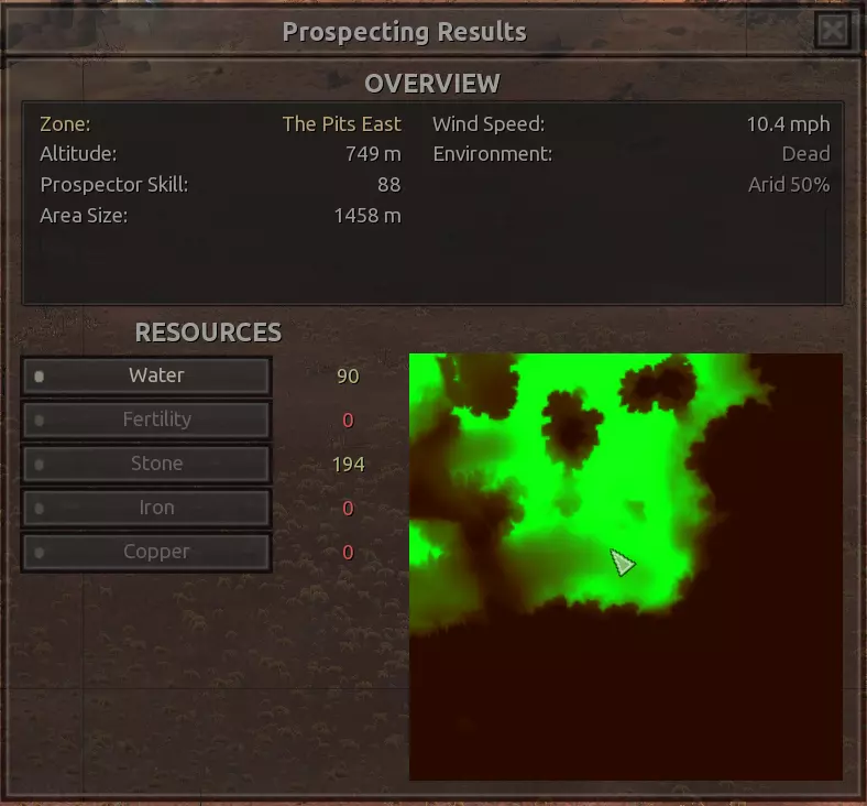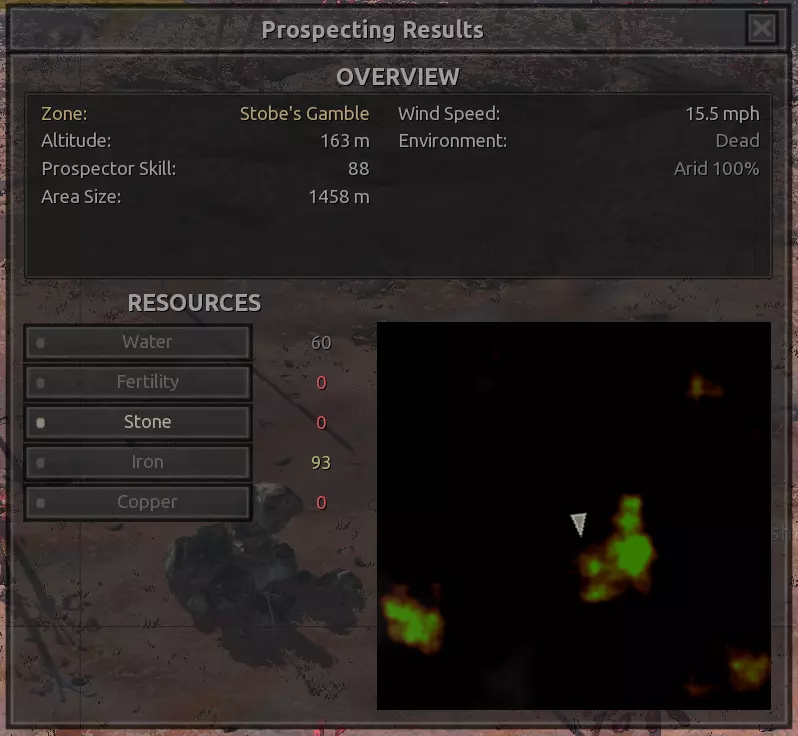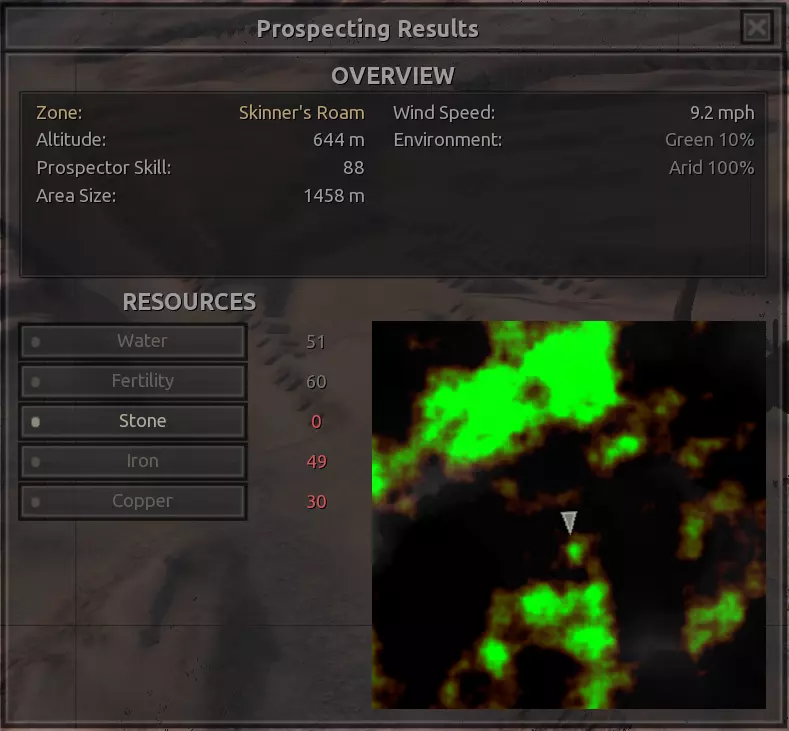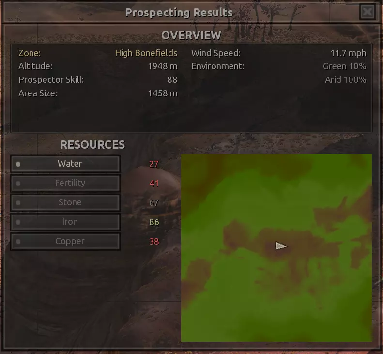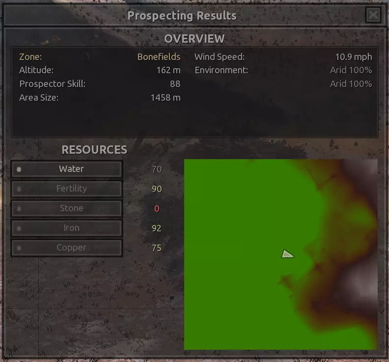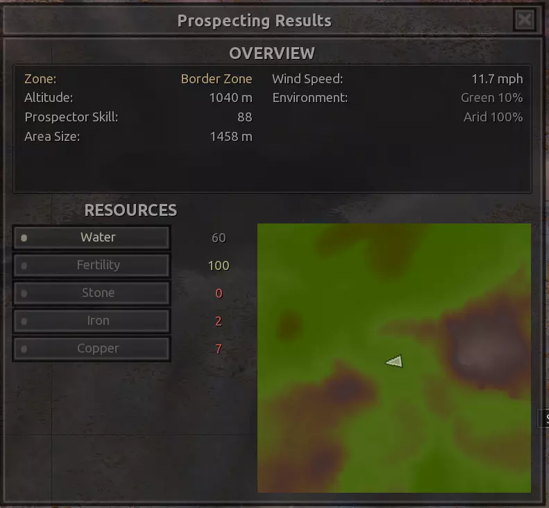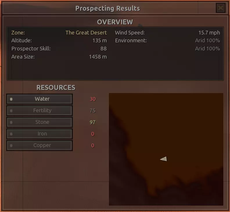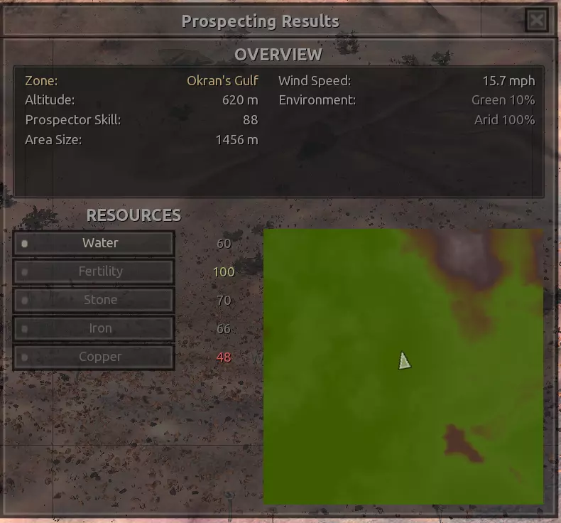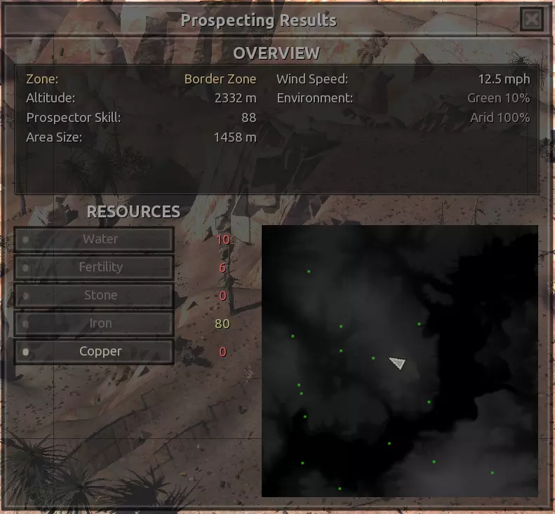 我对这个地方有些看法。这确实是个不错的小绿洲,有什么理由不喜欢呢?不过,资源开采起来很麻烦。你也看到了,铁矿在山坡上,而石头则藏在铁矿旁边那些杂乱的岩石堆下面。我最多只能让两台钻机达到40%的采石效率。同样地,如果你能把钻机放得离铁矿源更近一些,或许能获得更多铁矿,但我最多只能让钻机达到75%的效率。 资源情况:75%铁矿,50-60%铜矿,约30-40%石头,60%水源,90%肥沃度 危险:沙尘土匪袭击、祈祷日、饥饿的土匪群