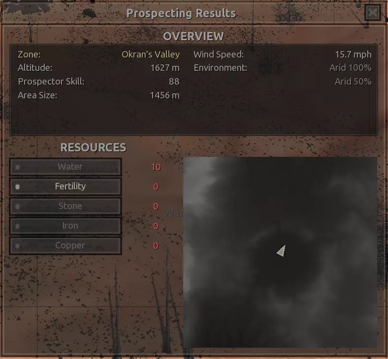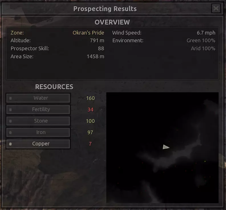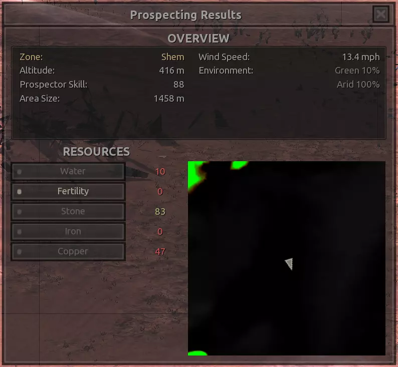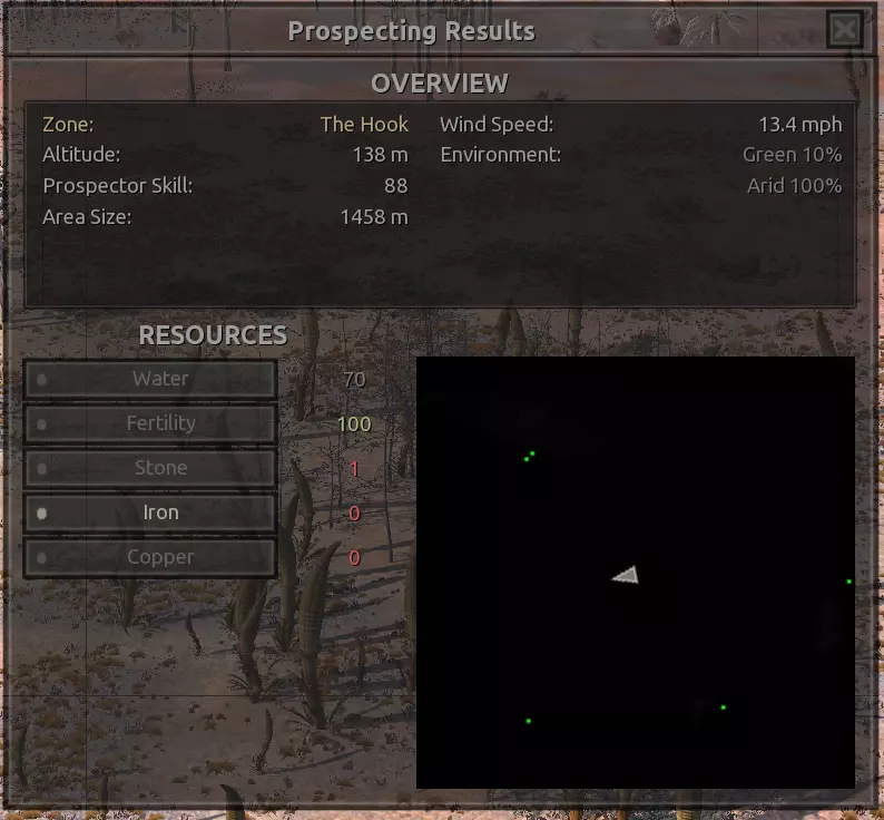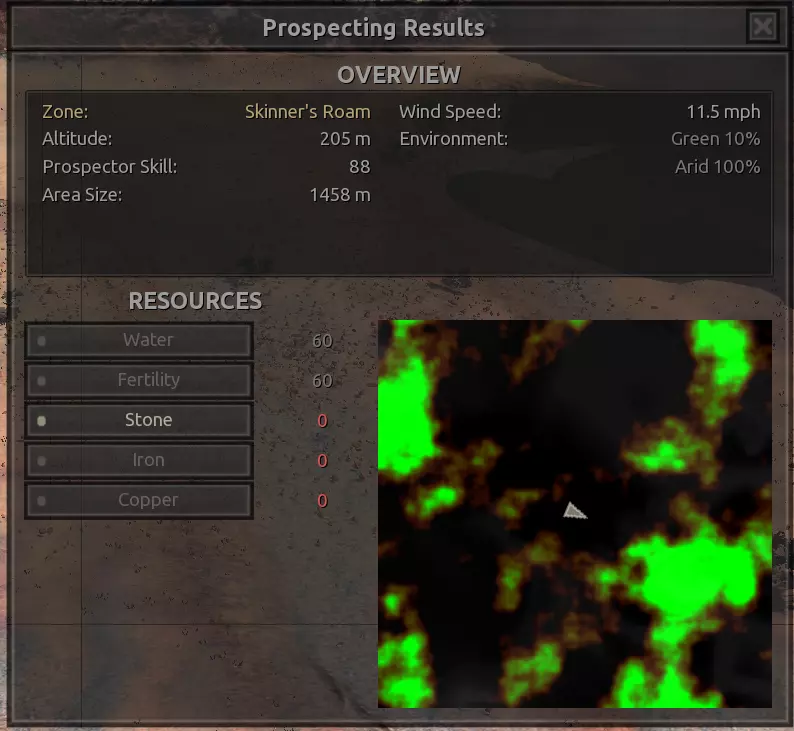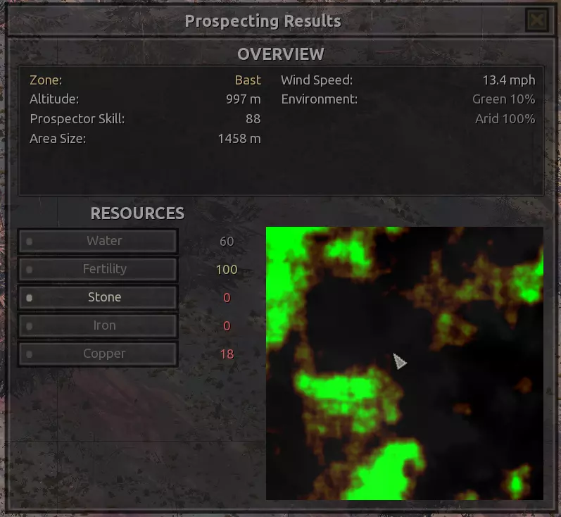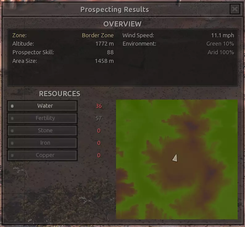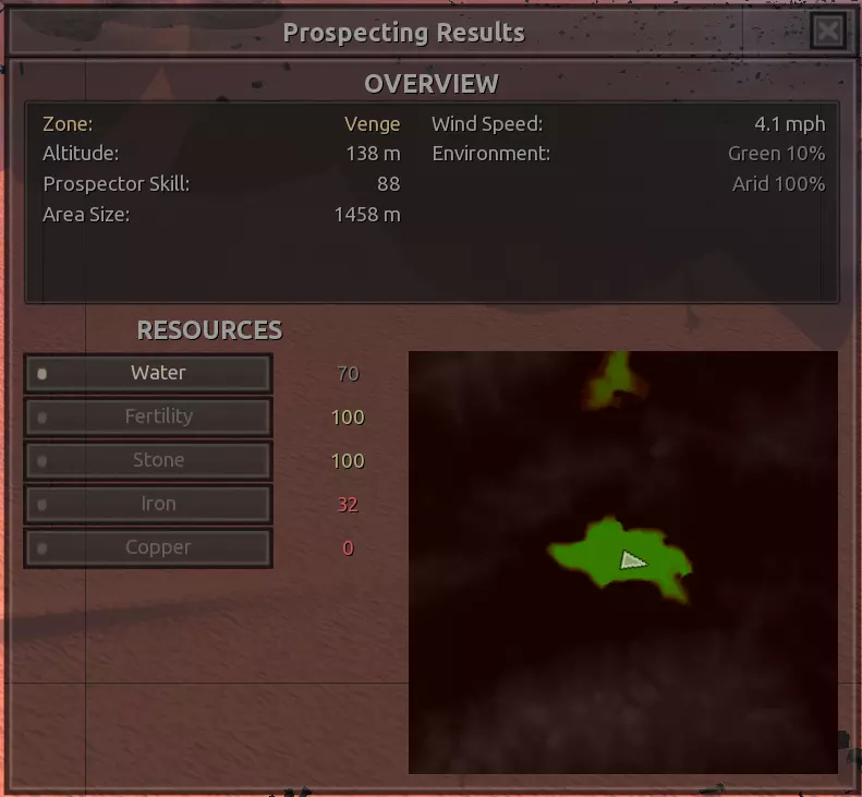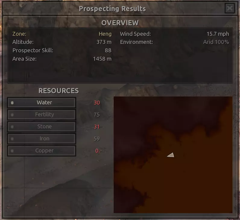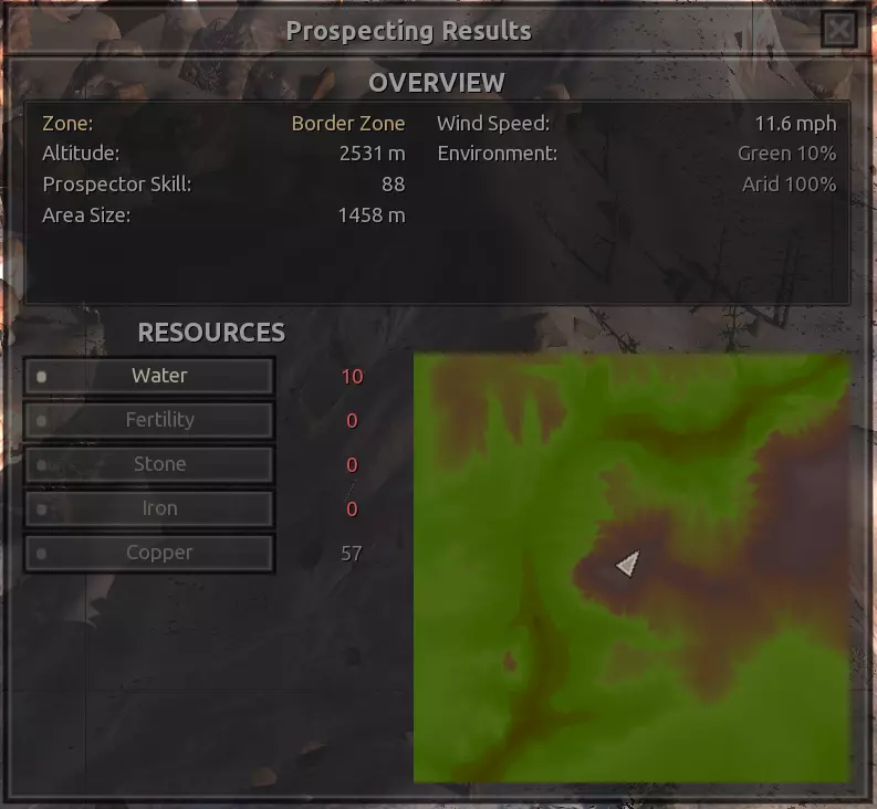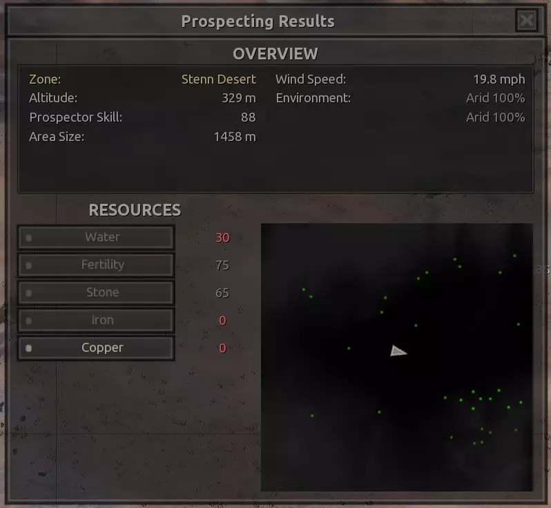 我对这个地方有些看法。这确实是个不错的小绿洲,有什么理由不喜欢呢?不过,资源开采起来很麻烦。你也看到了,铁矿在山坡上,而石头则藏在铁矿旁边那些杂乱的岩石堆下面。我最多只能让两台钻机达到40%的采石效率。同样地,如果你能把钻机放得离铁矿源更近一些,或许能获得更多铁矿,但我最多只能让钻机达到75%的效率。 资源情况:75%铁矿,50-60%铜矿,约30-40%石头,60%水源,90%肥沃度 危险:沙尘土匪袭击、祈祷日、饥饿的土匪群
