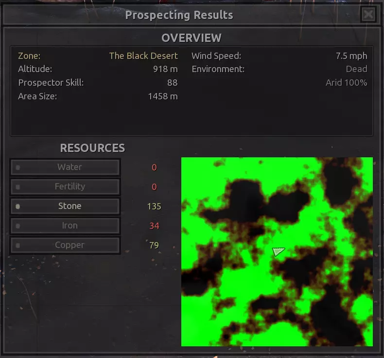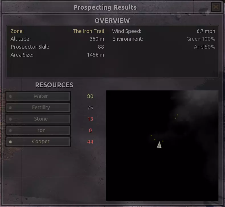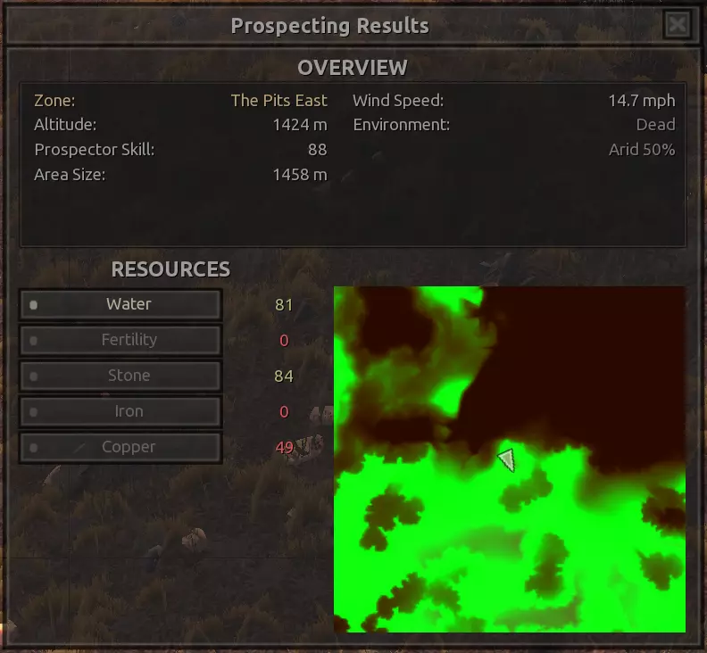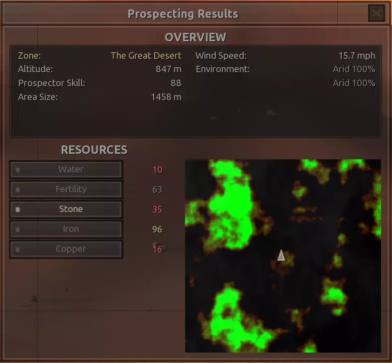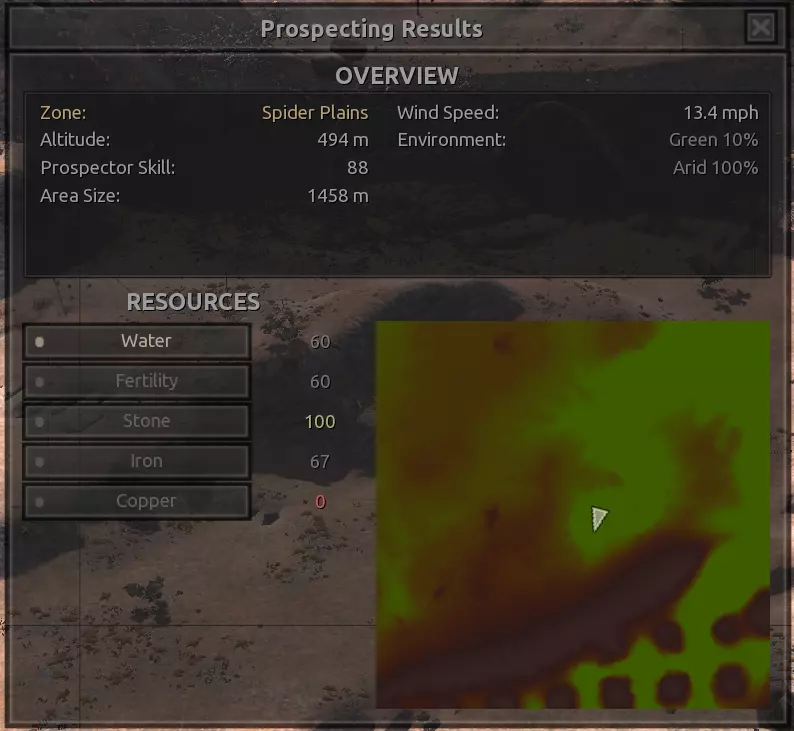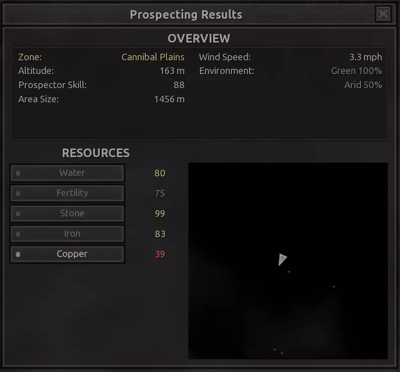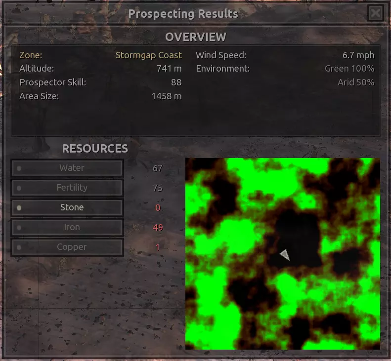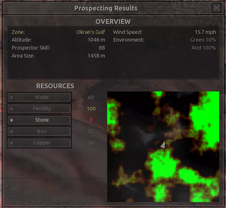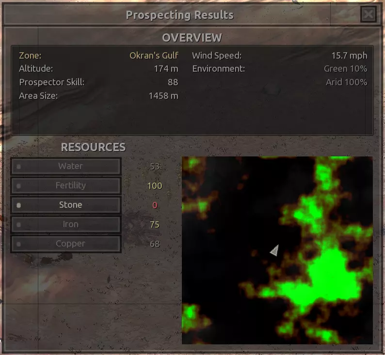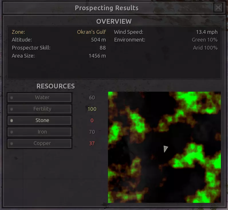 我对这个地方有些看法。这确实是个不错的小绿洲,有什么理由不喜欢呢?不过,资源开采起来很麻烦。你也看到了,铁矿在山坡上,而石头则藏在铁矿旁边那些杂乱的岩石堆下面。我最多只能让两台钻机达到40%的采石效率。同样地,如果你能把钻机放得离铁矿源更近一些,或许能获得更多铁矿,但我最多只能让钻机达到75%的效率。 资源情况:75%铁矿,50-60%铜矿,约30-40%石头,60%水源,90%肥沃度 危险:沙尘土匪袭击、祈祷日、饥饿的土匪群