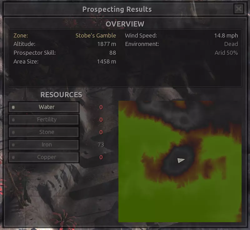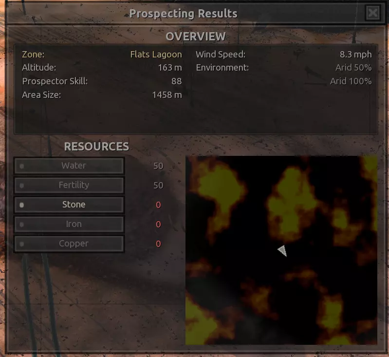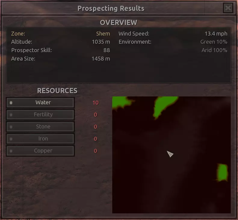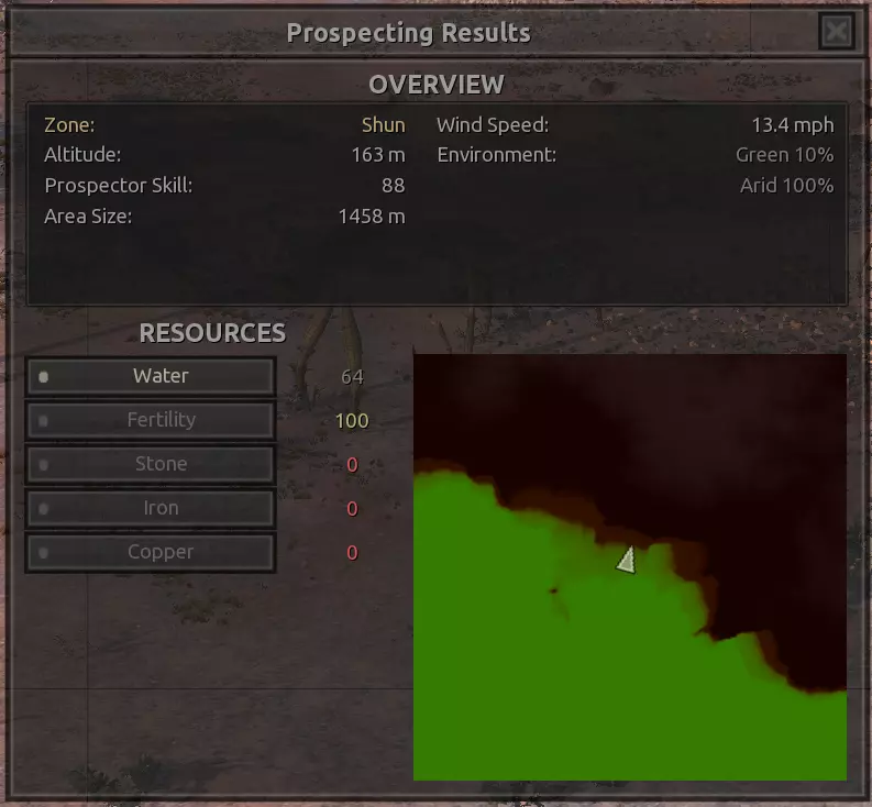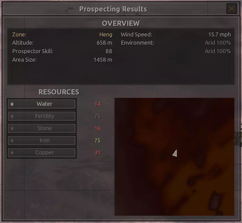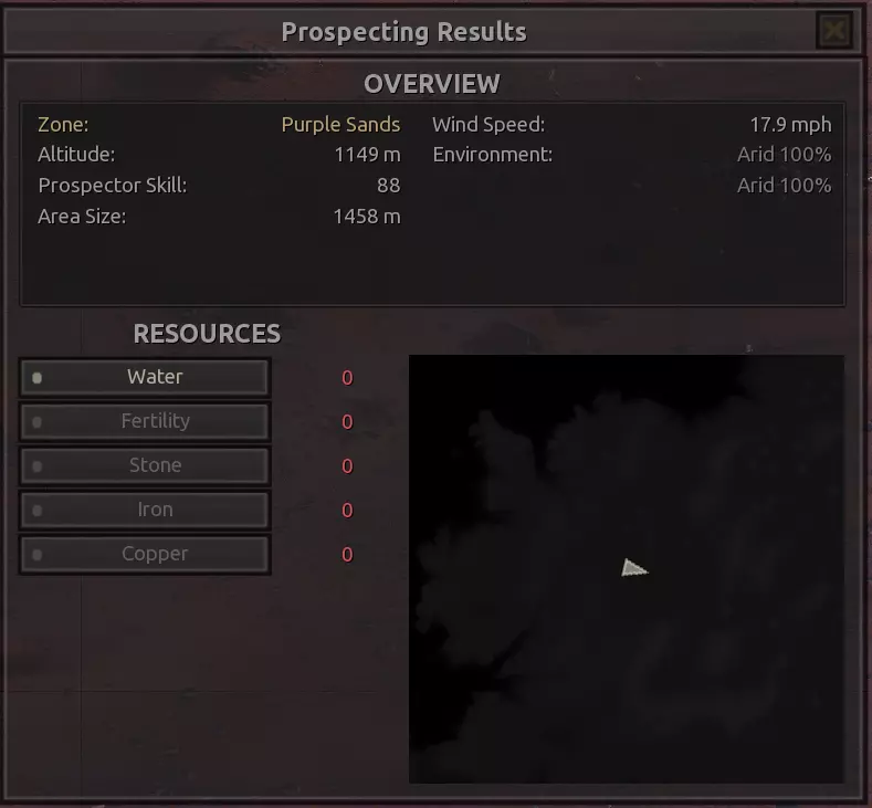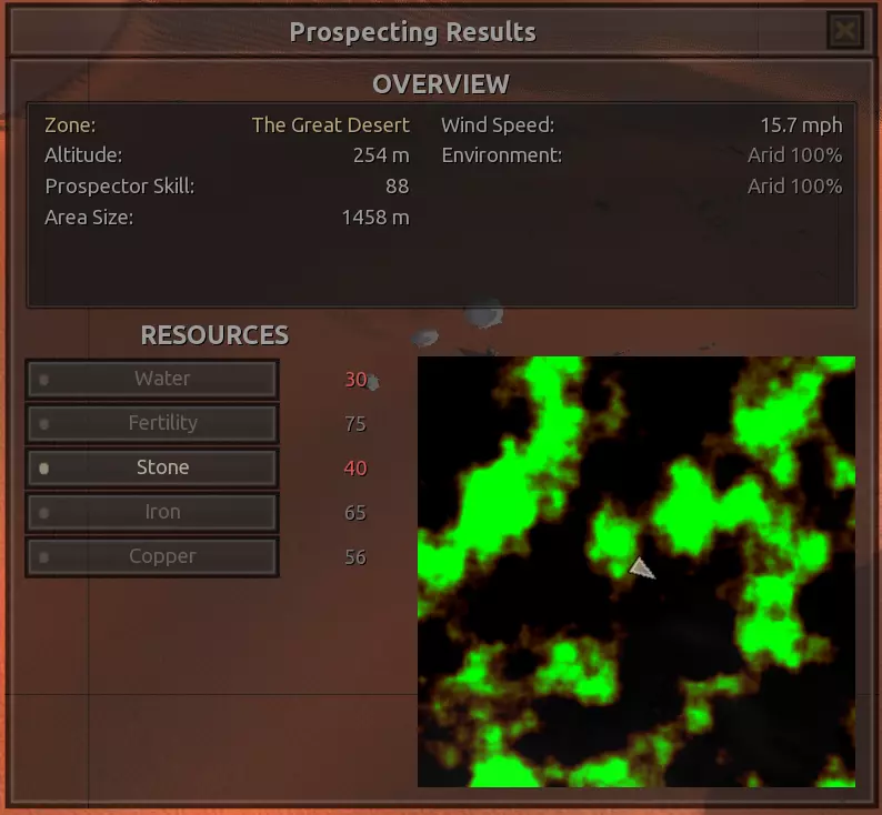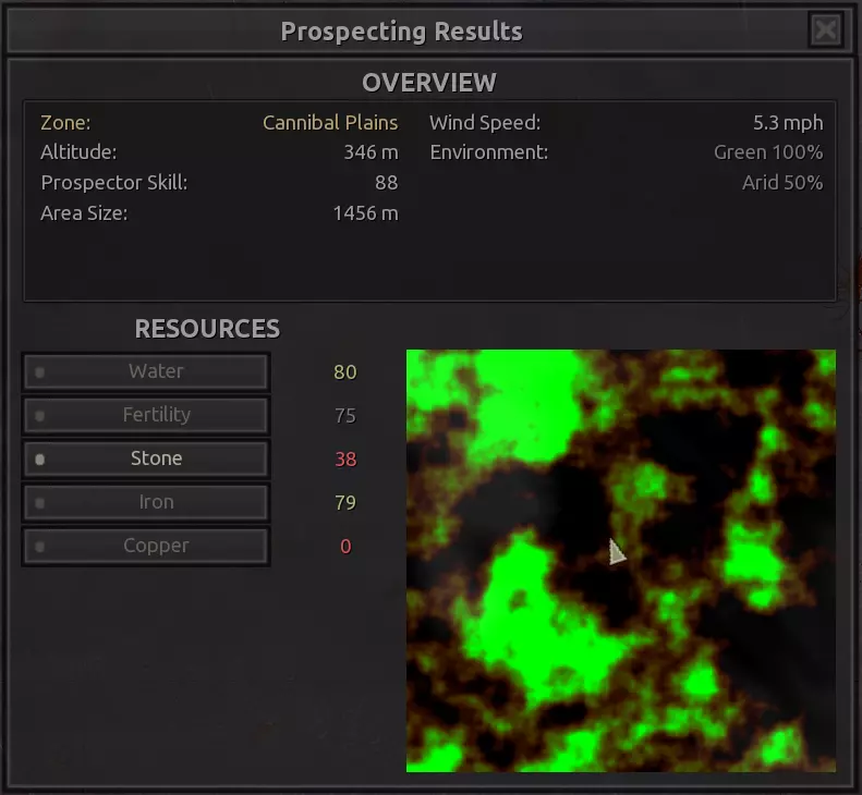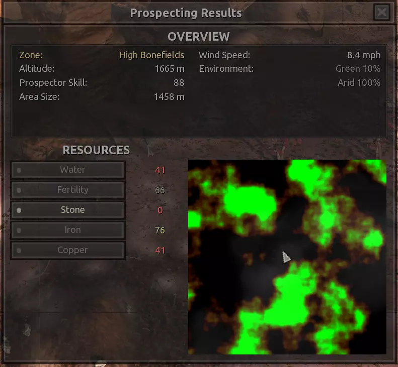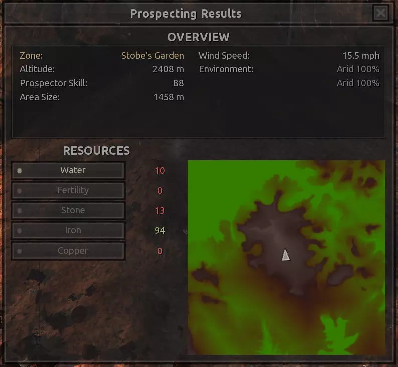 我对这个地方有些看法。这确实是个不错的小绿洲,有什么理由不喜欢呢?不过,资源开采起来很麻烦。你也看到了,铁矿在山坡上,而石头则藏在铁矿旁边那些杂乱的岩石堆下面。我最多只能让两台钻机达到40%的采石效率。同样地,如果你能把钻机放得离铁矿源更近一些,或许能获得更多铁矿,但我最多只能让钻机达到75%的效率。 资源情况:75%铁矿,50-60%铜矿,约30-40%石头,60%水源,90%肥沃度 危险:沙尘土匪袭击、祈祷日、饥饿的土匪群