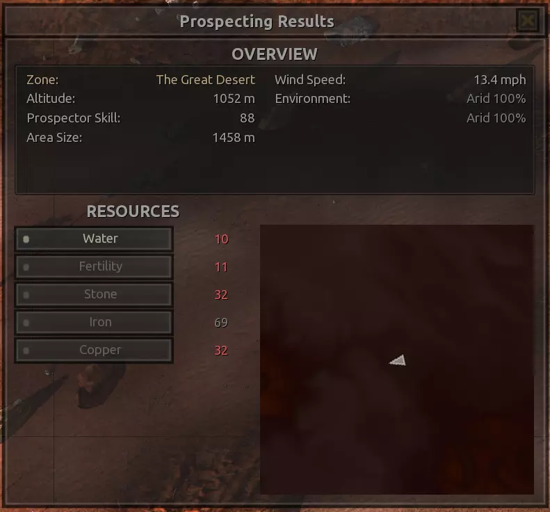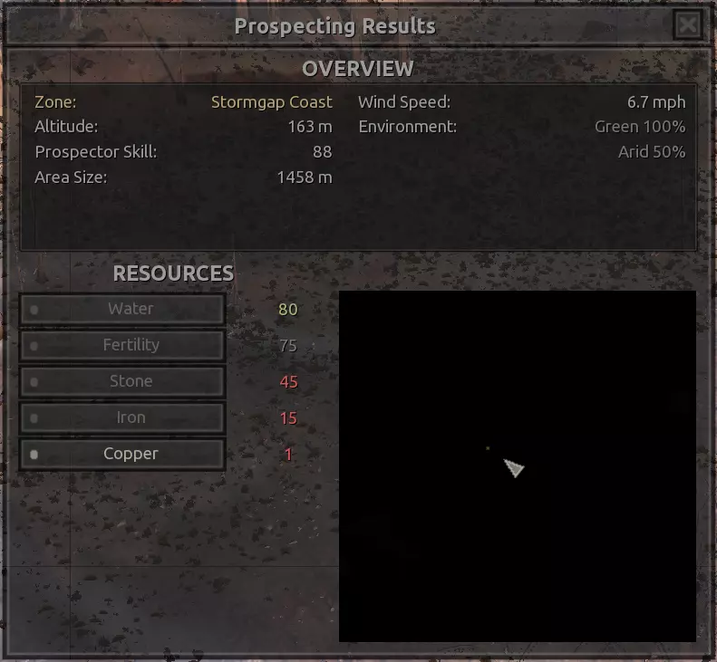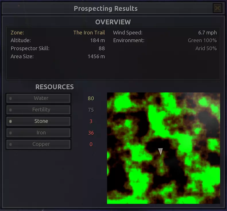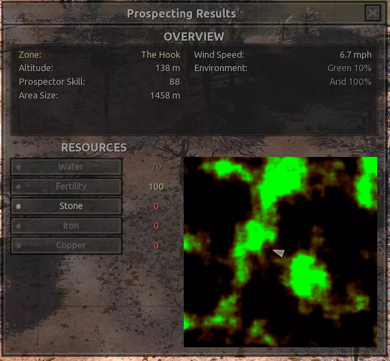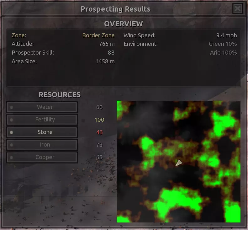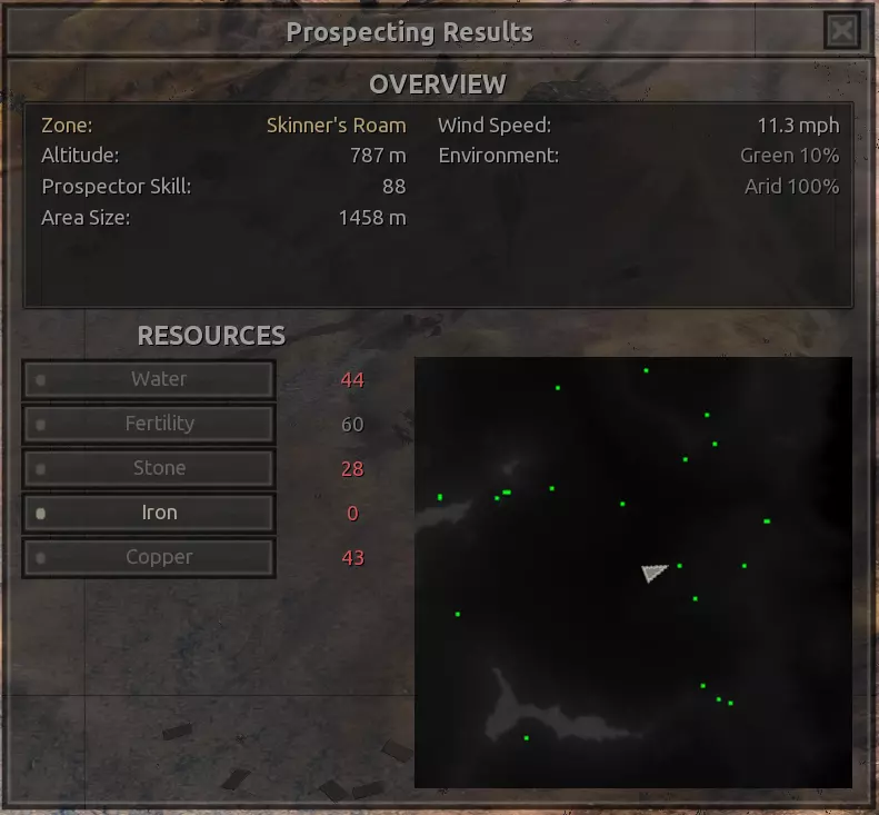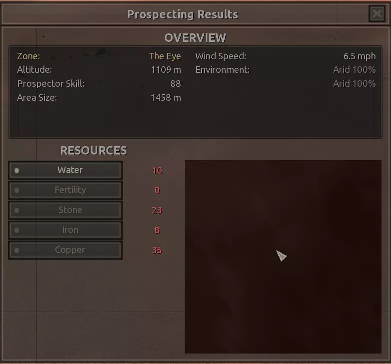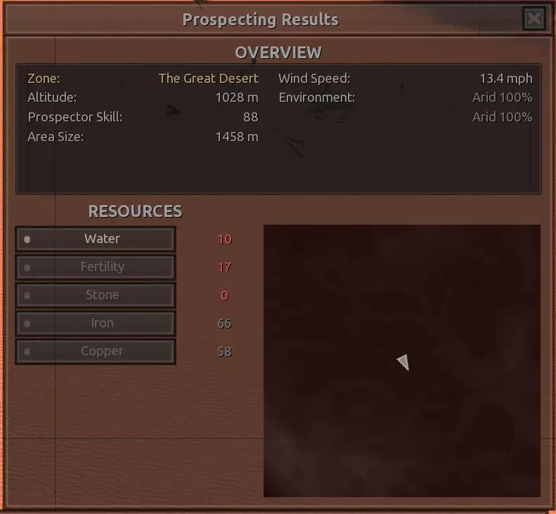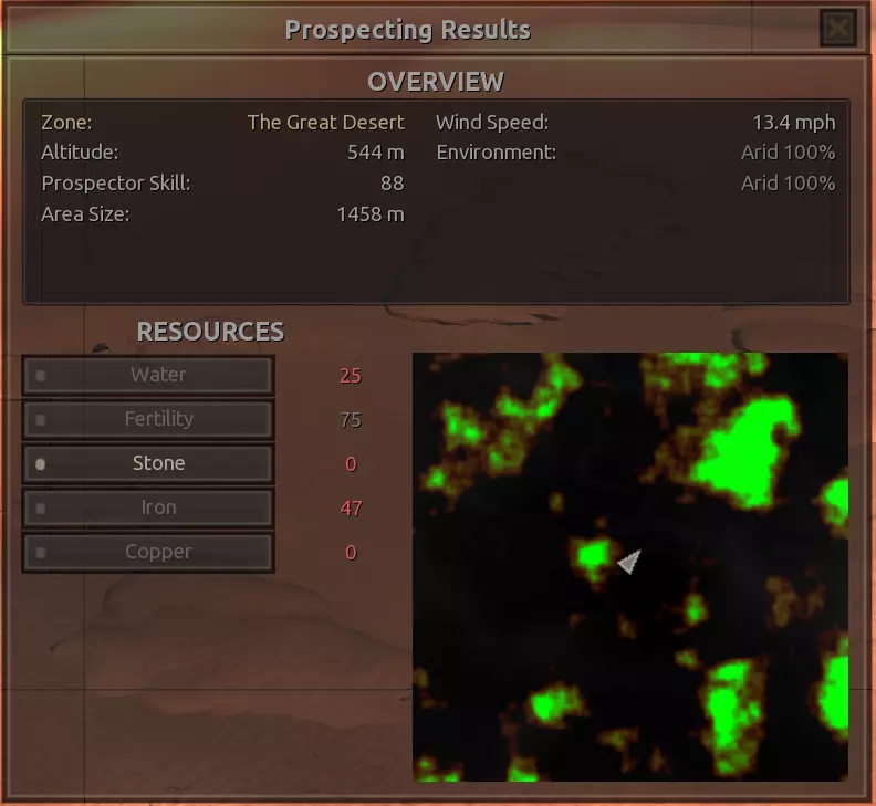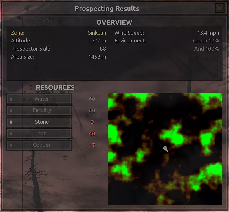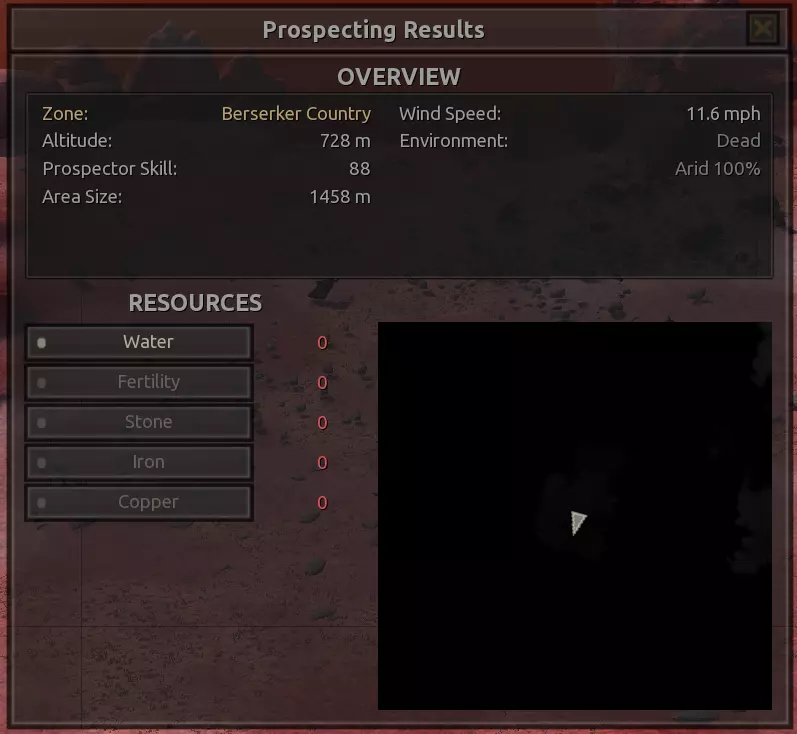 我对这个地方有些看法。这确实是个不错的小绿洲,有什么理由不喜欢呢?不过,资源开采起来很麻烦。你也看到了,铁矿在山坡上,而石头则藏在铁矿旁边那些杂乱的岩石堆下面。我最多只能让两台钻机达到40%的采石效率。同样地,如果你能把钻机放得离铁矿源更近一些,或许能获得更多铁矿,但我最多只能让钻机达到75%的效率。 资源情况:75%铁矿,50-60%铜矿,约30-40%石头,60%水源,90%肥沃度 危险:沙尘土匪袭击、祈祷日、饥饿的土匪群