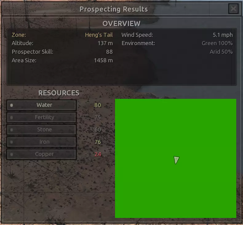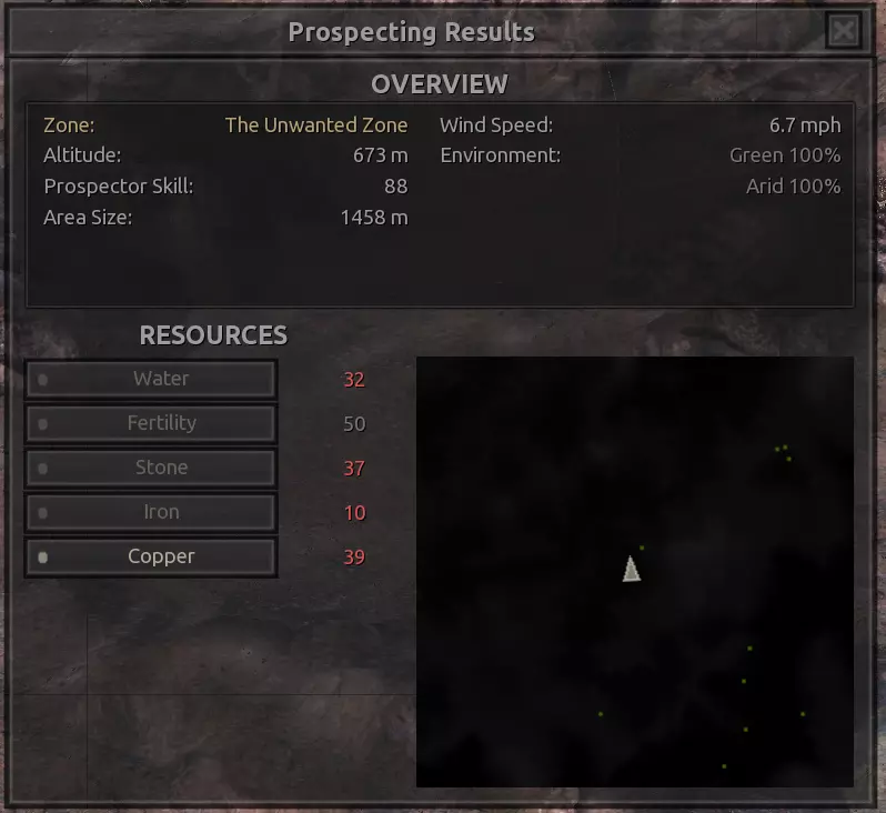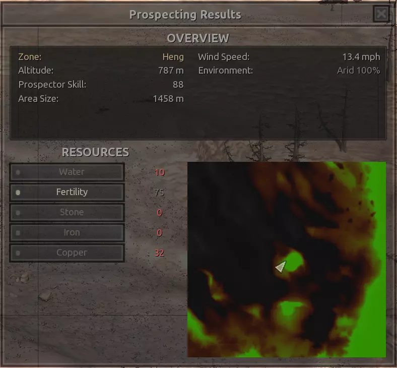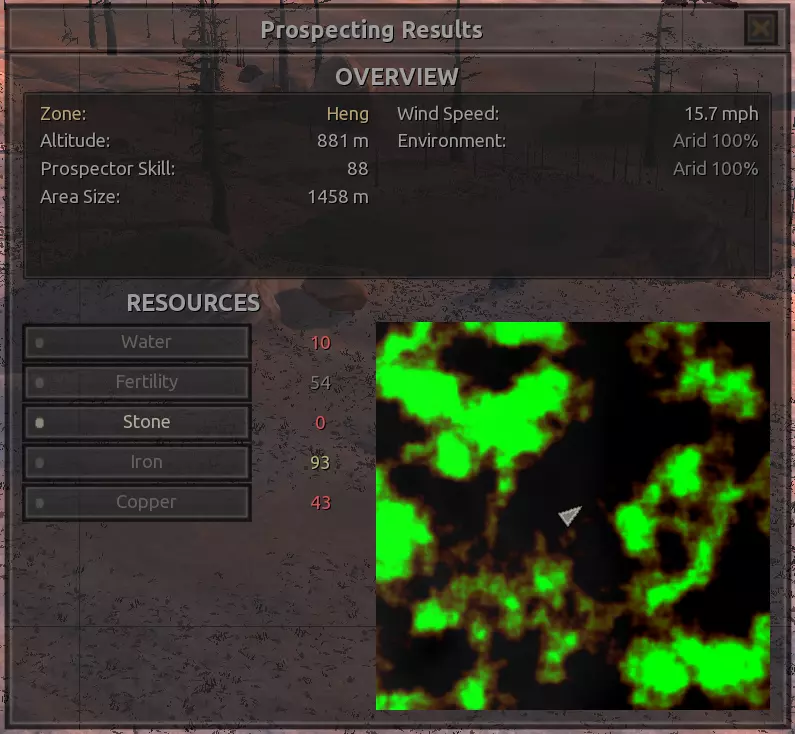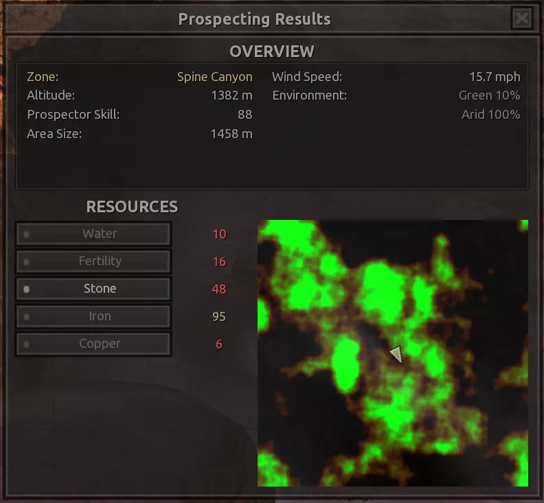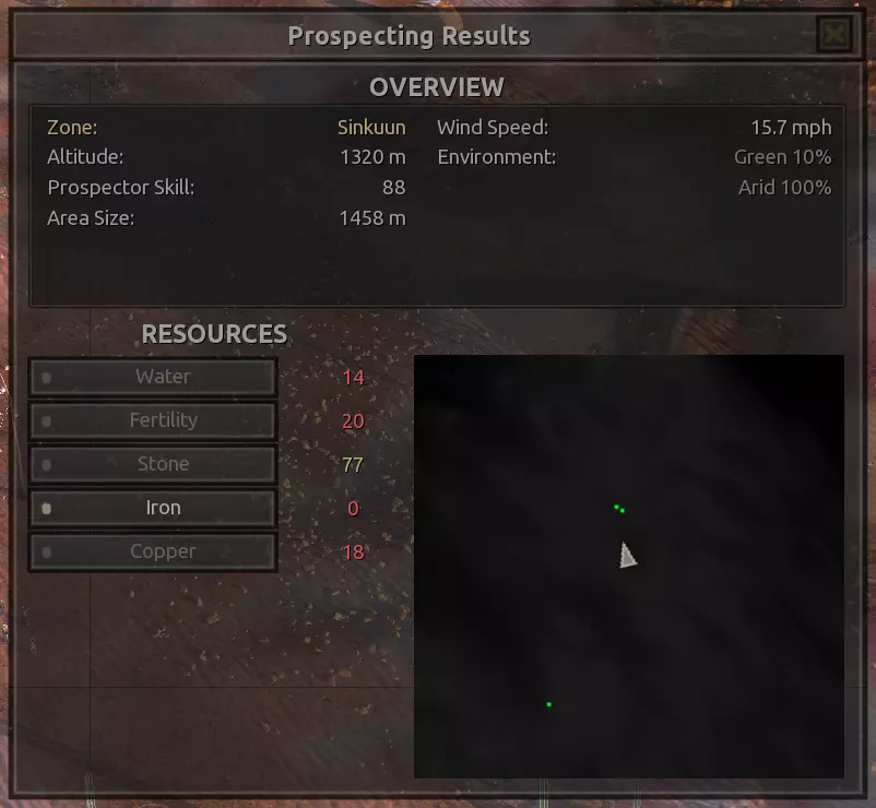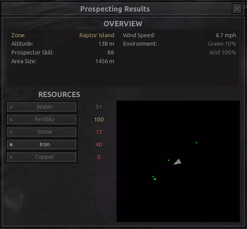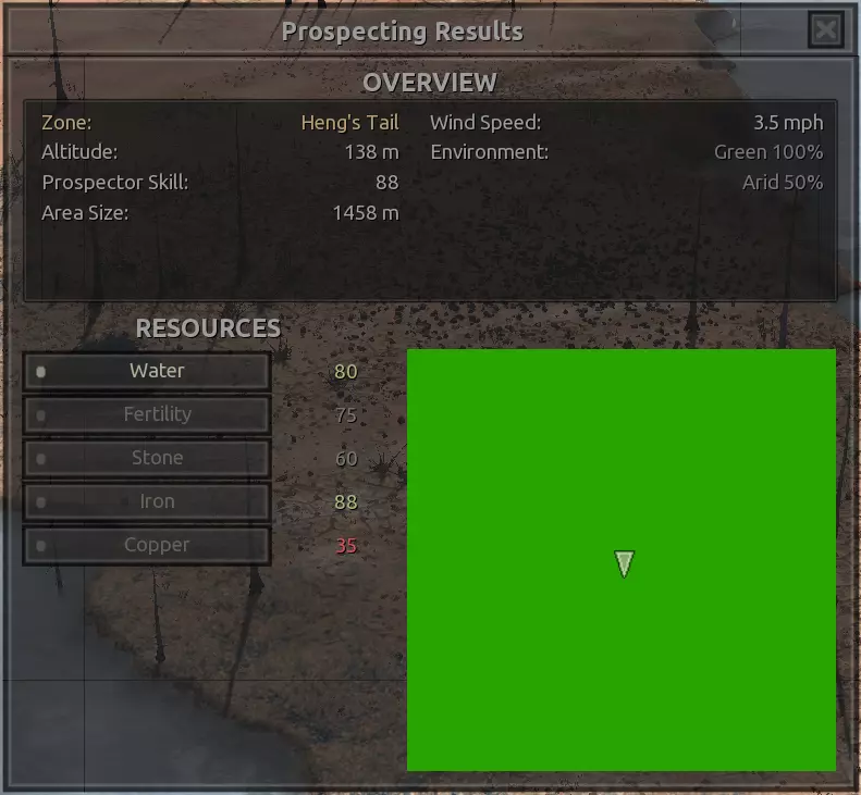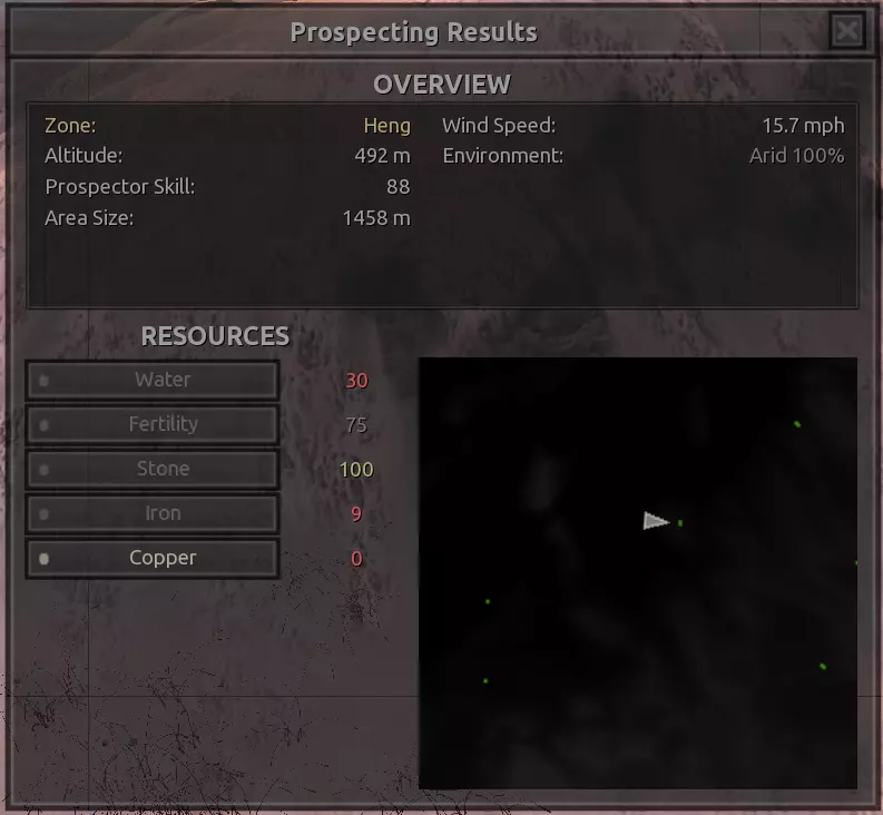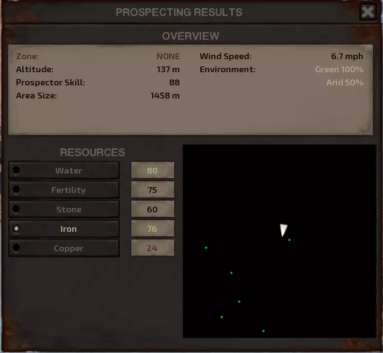 我对这个地方有些看法。这确实是个不错的小绿洲,有什么理由不喜欢呢?不过,资源开采起来很麻烦。你也看到了,铁矿在山坡上,而石头则藏在铁矿旁边那些杂乱的岩石堆下面。我最多只能让两台钻机达到40%的采石效率。同样地,如果你能把钻机放得离铁矿源更近一些,或许能获得更多铁矿,但我最多只能让钻机达到75%的效率。 资源情况:75%铁矿,50-60%铜矿,约30-40%石头,60%水源,90%肥沃度 危险:沙尘土匪袭击、祈祷日、饥饿的土匪群