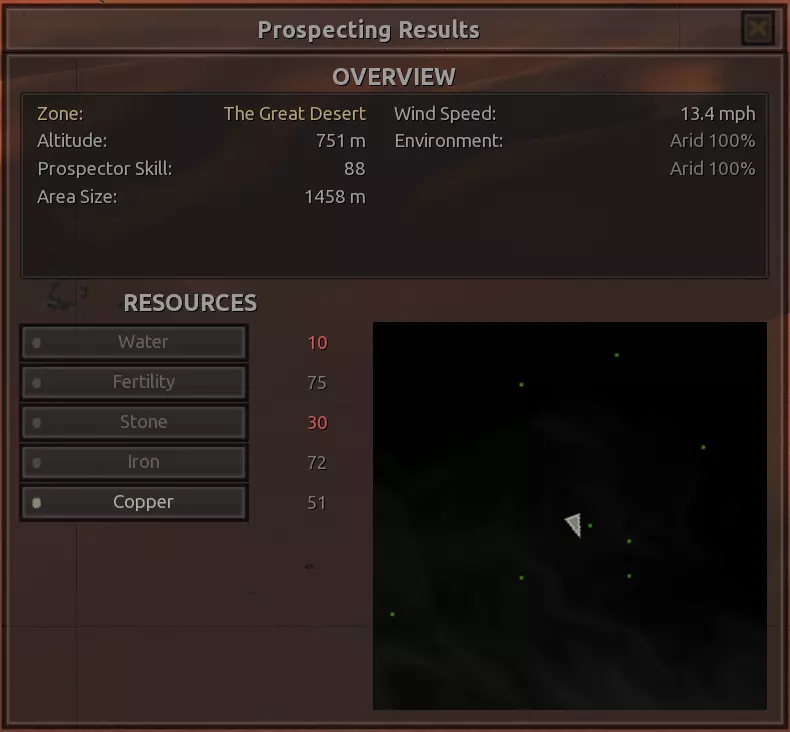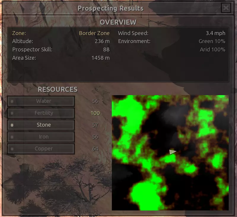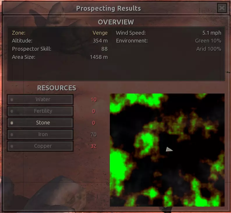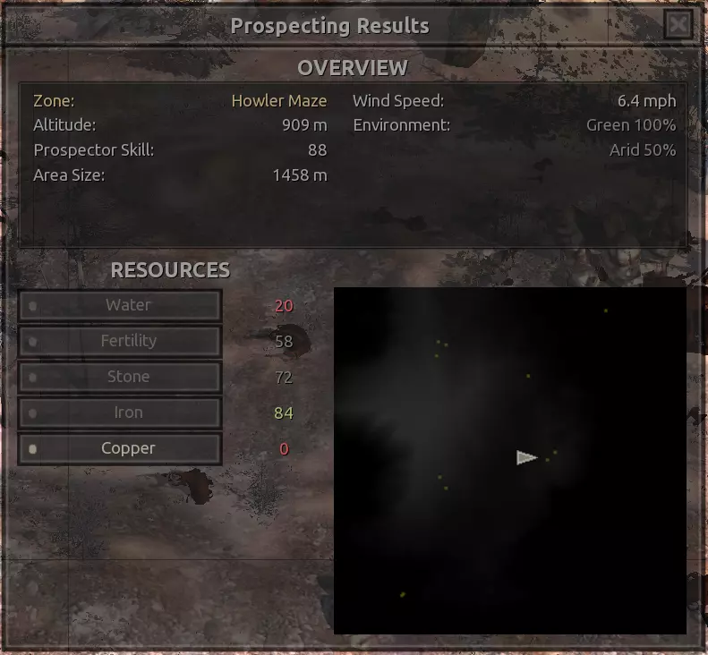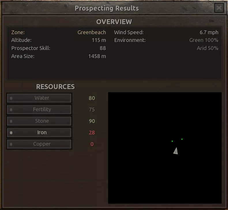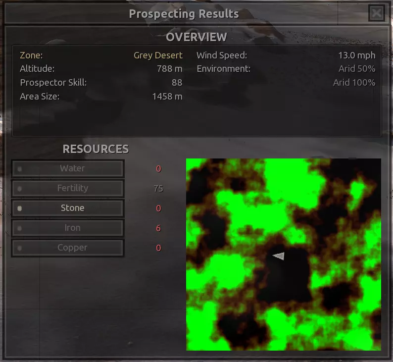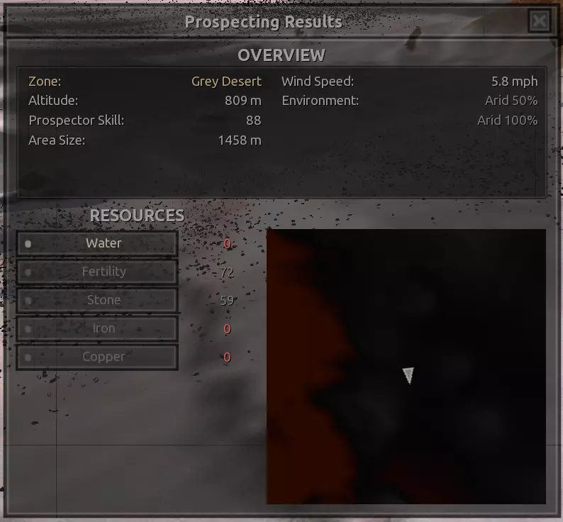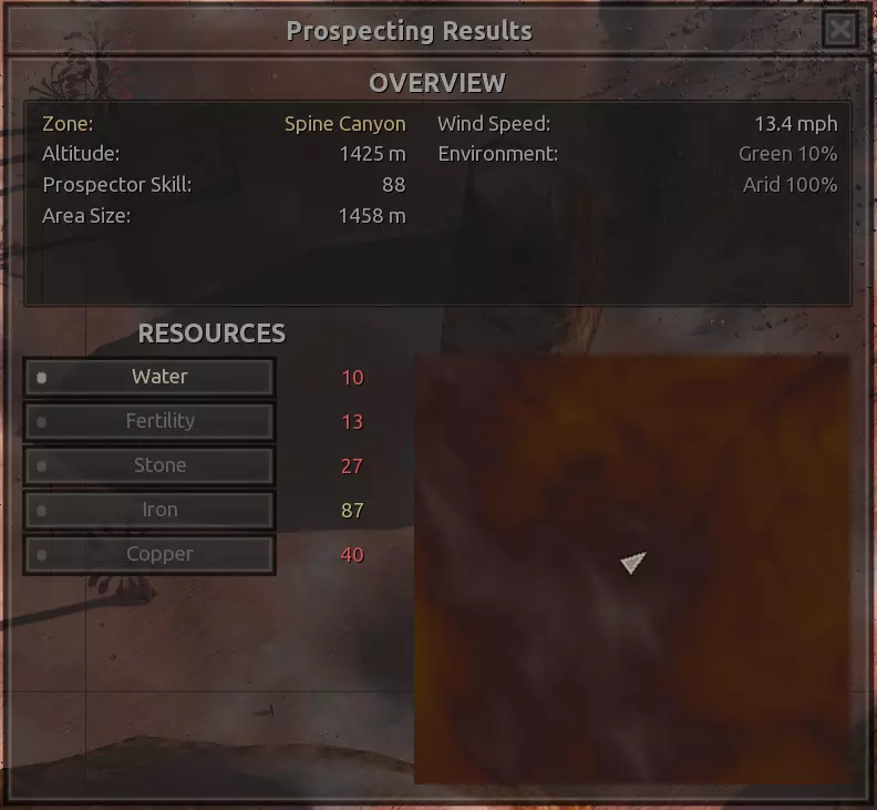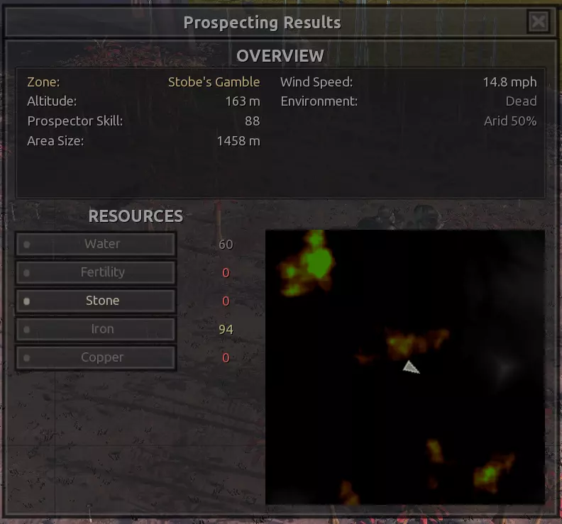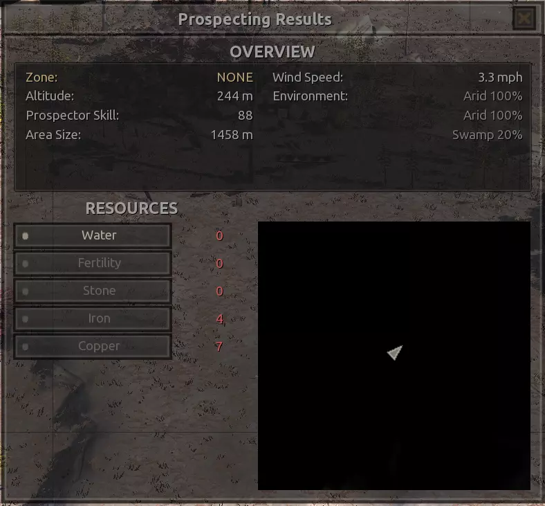 我对这个地方有些看法。这确实是个不错的小绿洲,有什么理由不喜欢呢?不过,资源开采起来很麻烦。你也看到了,铁矿在山坡上,而石头则藏在铁矿旁边那些杂乱的岩石堆下面。我最多只能让两台钻机达到40%的采石效率。同样地,如果你能把钻机放得离铁矿源更近一些,或许能获得更多铁矿,但我最多只能让钻机达到75%的效率。 资源情况:75%铁矿,50-60%铜矿,约30-40%石头,60%水源,90%肥沃度 危险:沙尘土匪袭击、祈祷日、饥饿的土匪群