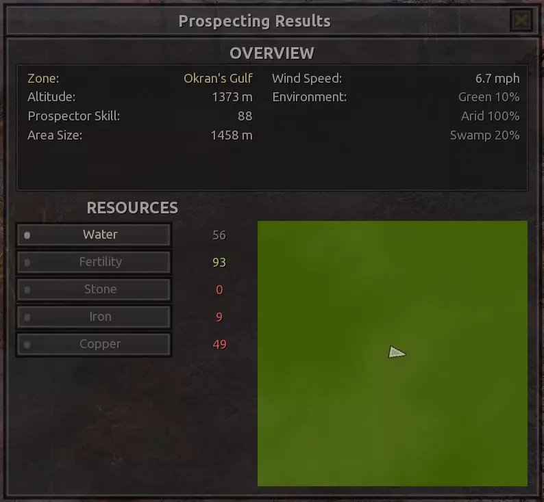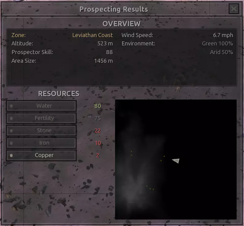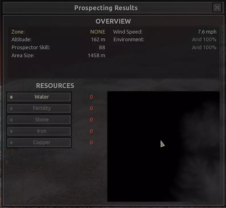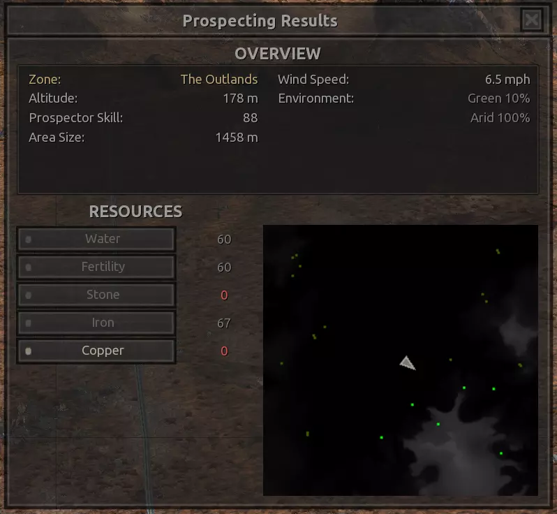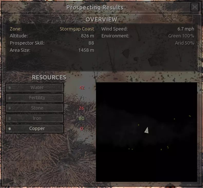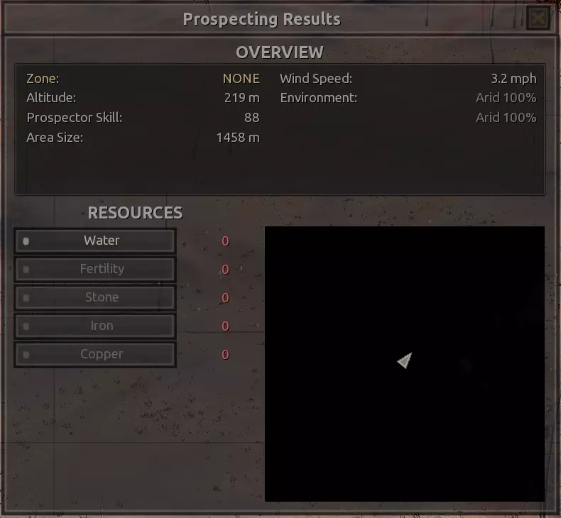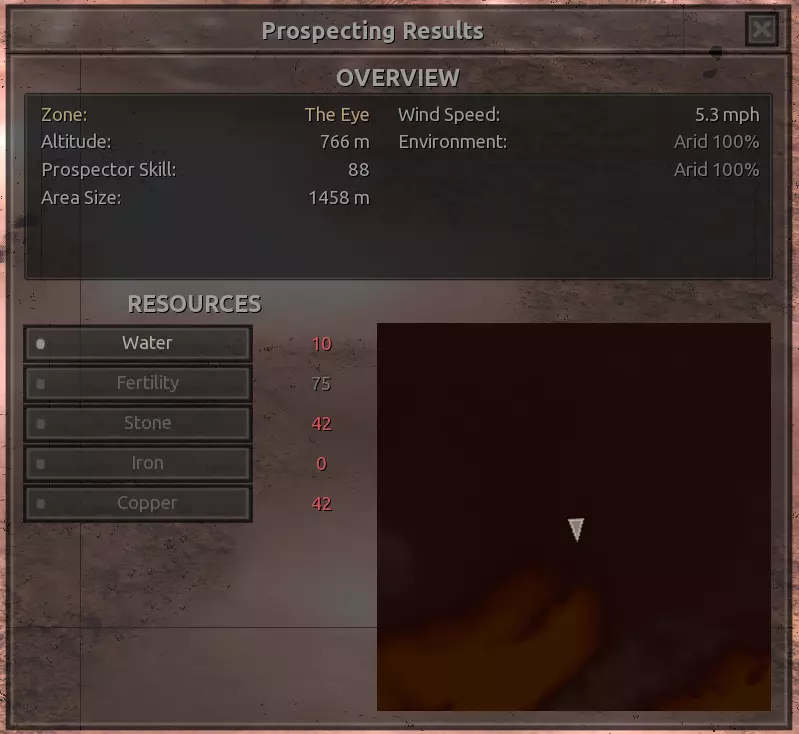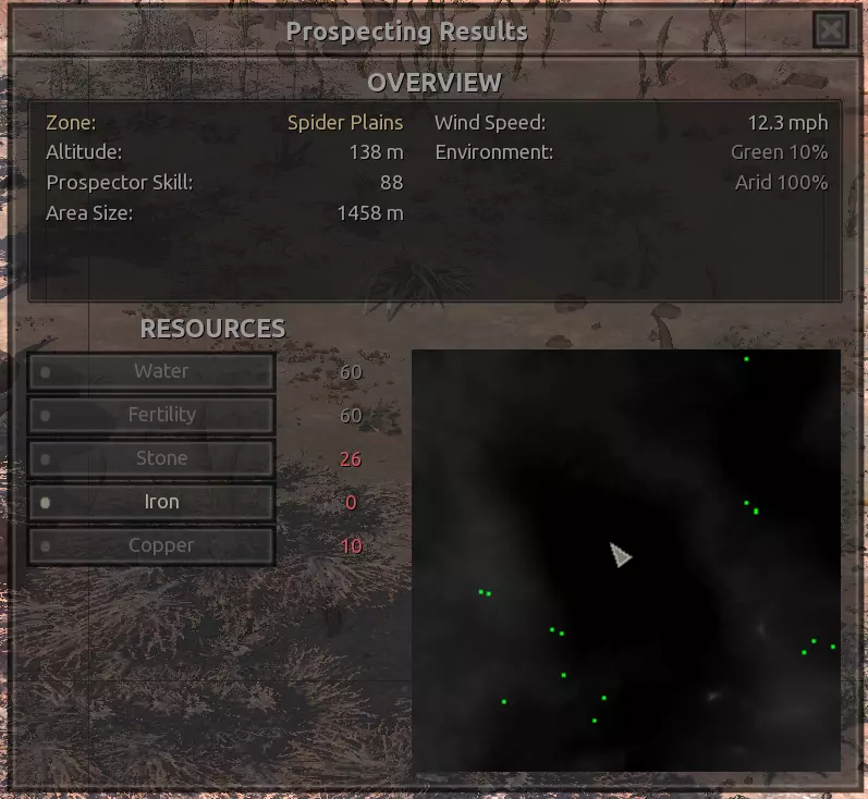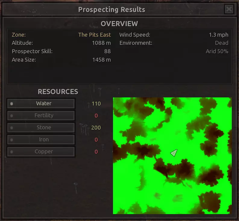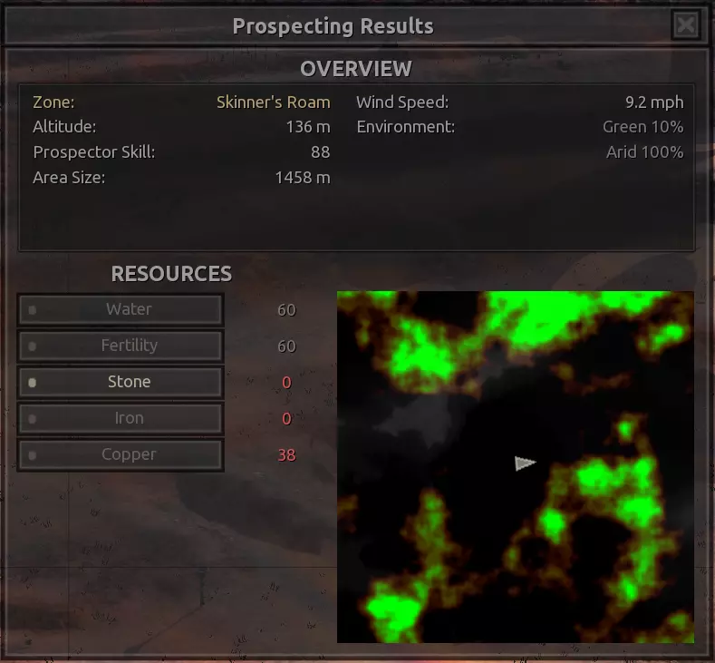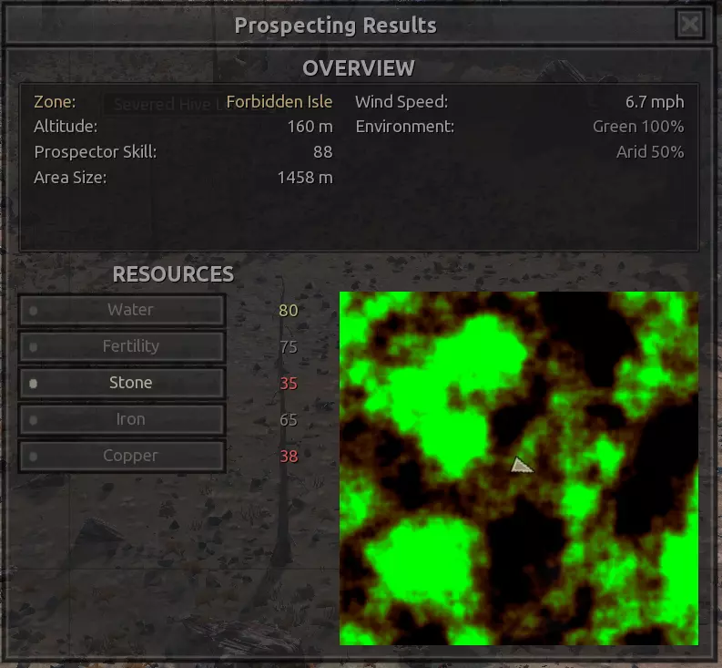 我对这个地方有些看法。这确实是个不错的小绿洲,有什么理由不喜欢呢?不过,资源开采起来很麻烦。你也看到了,铁矿在山坡上,而石头则藏在铁矿旁边那些杂乱的岩石堆下面。我最多只能让两台钻机达到40%的采石效率。同样地,如果你能把钻机放得离铁矿源更近一些,或许能获得更多铁矿,但我最多只能让钻机达到75%的效率。 资源情况:75%铁矿,50-60%铜矿,约30-40%石头,60%水源,90%肥沃度 危险:沙尘土匪袭击、祈祷日、饥饿的土匪群