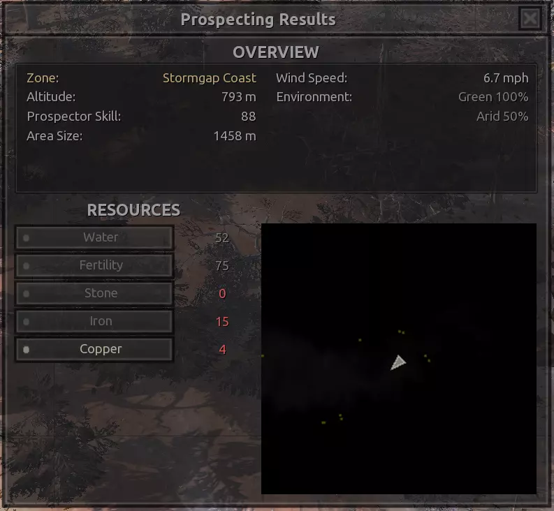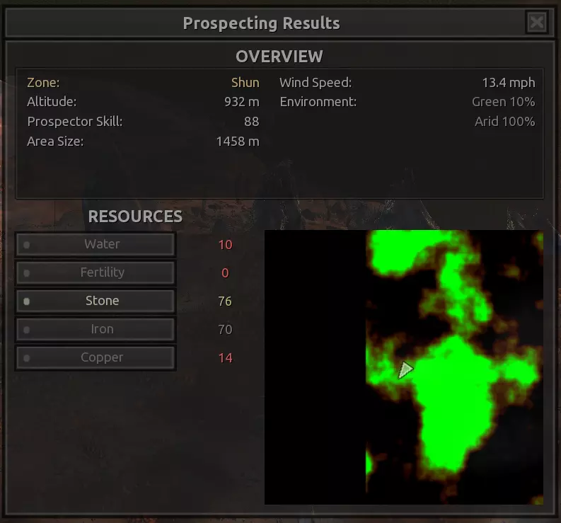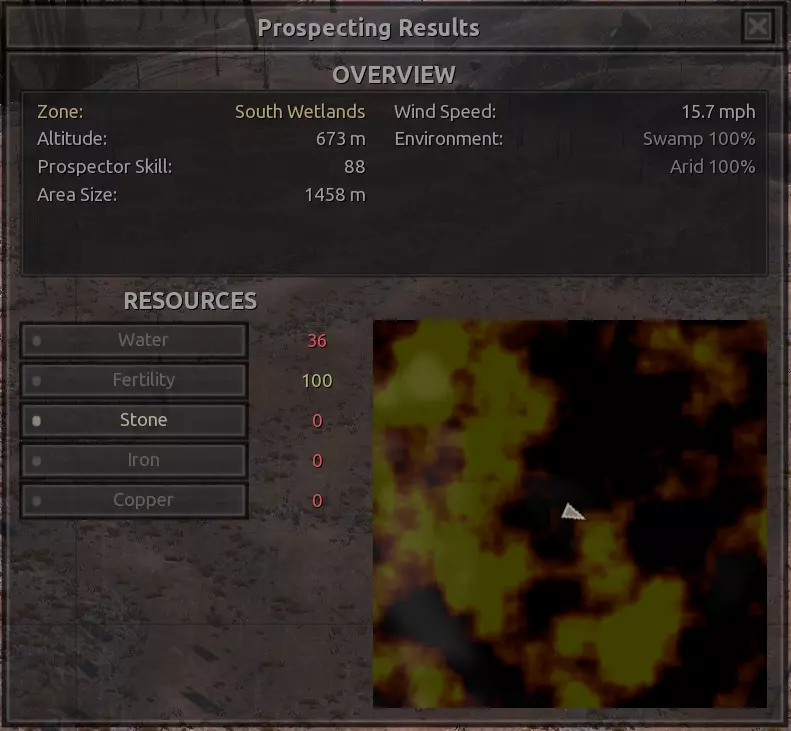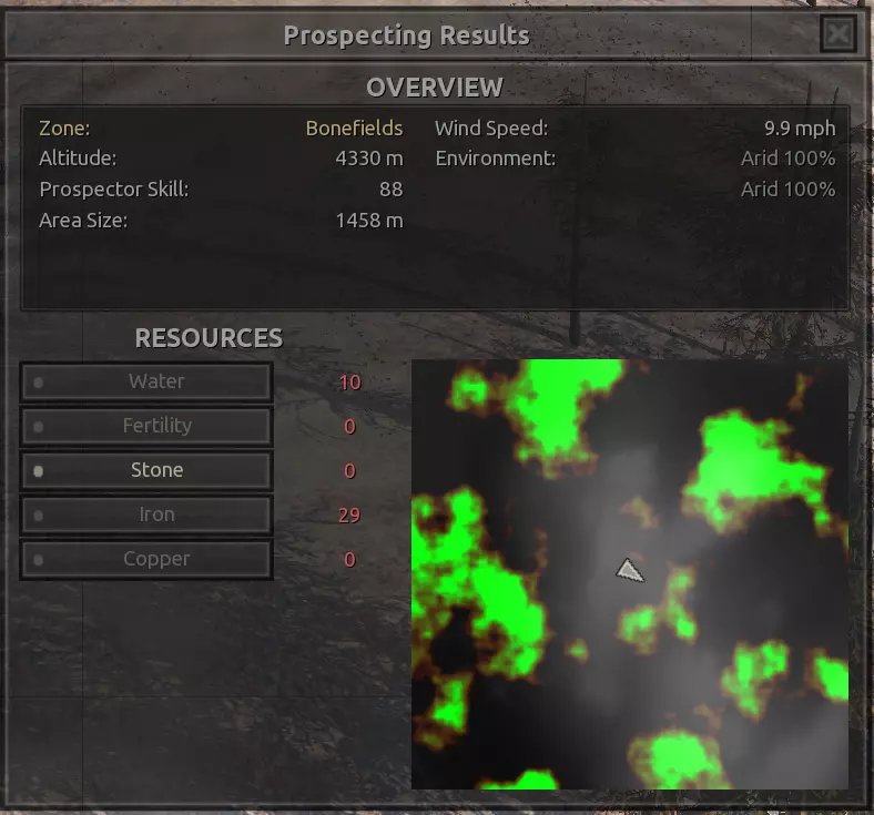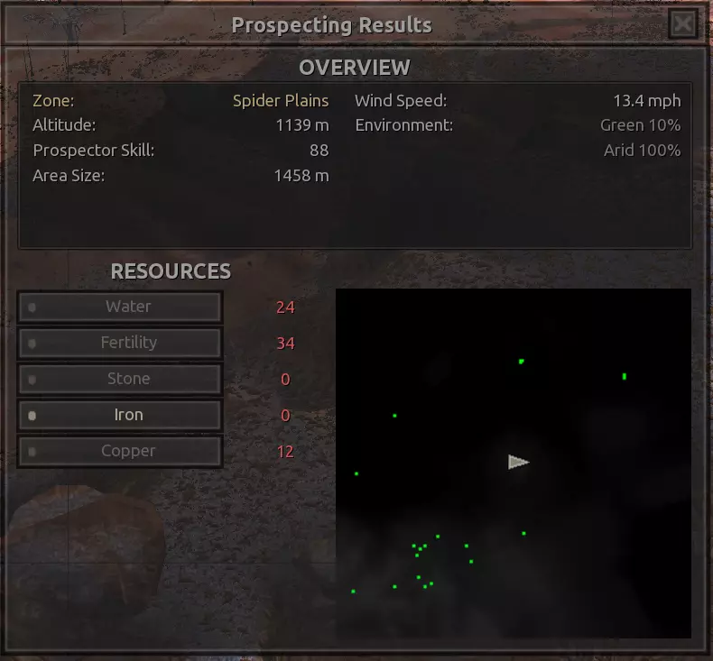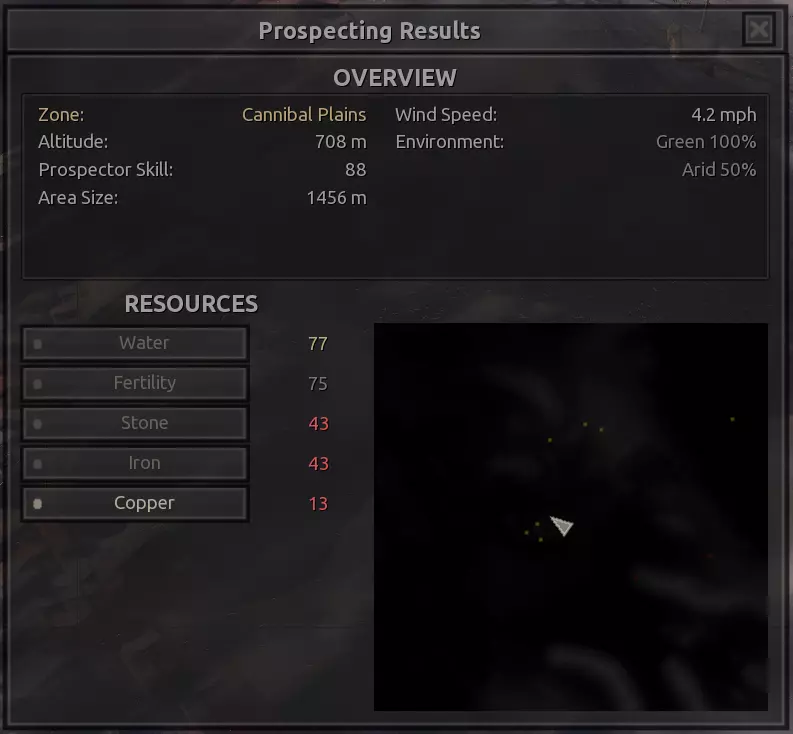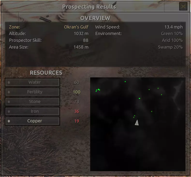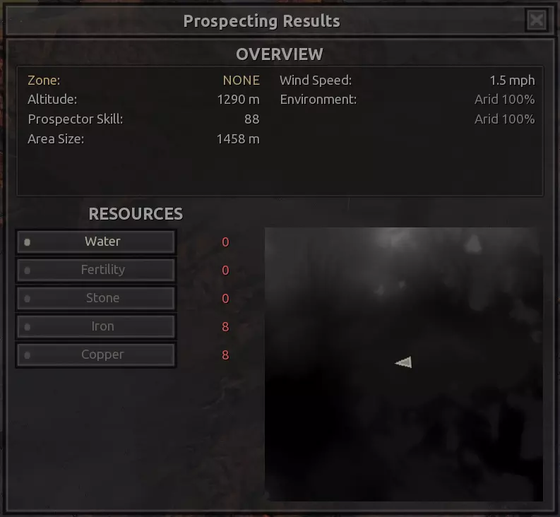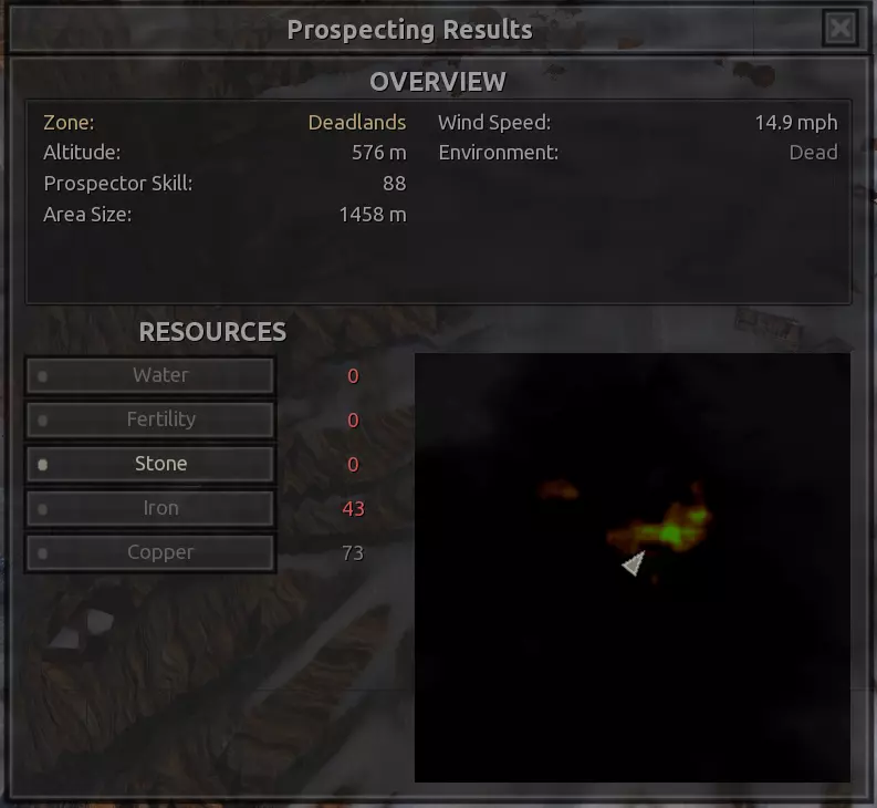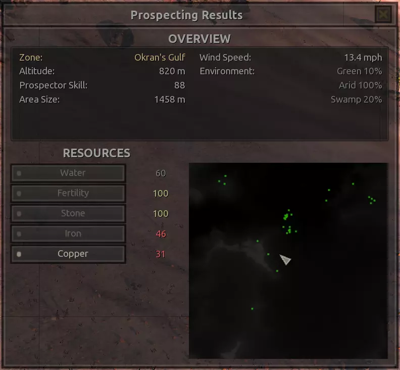 我对这个地方有些看法。这确实是个不错的小绿洲,有什么理由不喜欢呢?不过,资源开采起来很麻烦。你也看到了,铁矿在山坡上,而石头则藏在铁矿旁边那些杂乱的岩石堆下面。我最多只能让两台钻机达到40%的采石效率。同样地,如果你能把钻机放得离铁矿源更近一些,或许能获得更多铁矿,但我最多只能让钻机达到75%的效率。 资源情况:75%铁矿,50-60%铜矿,约30-40%石头,60%水源,90%肥沃度 危险:沙尘土匪袭击、祈祷日、饥饿的土匪群