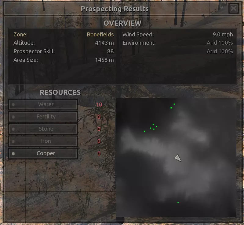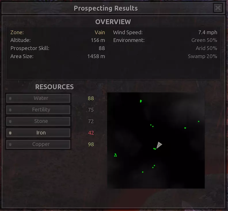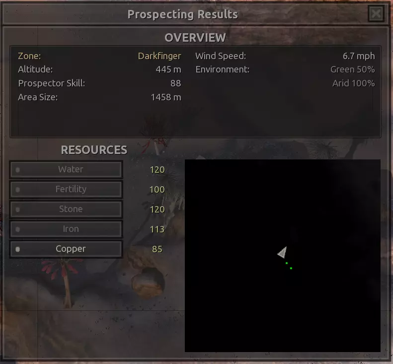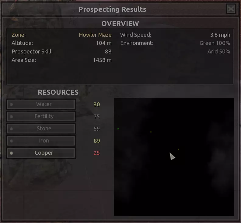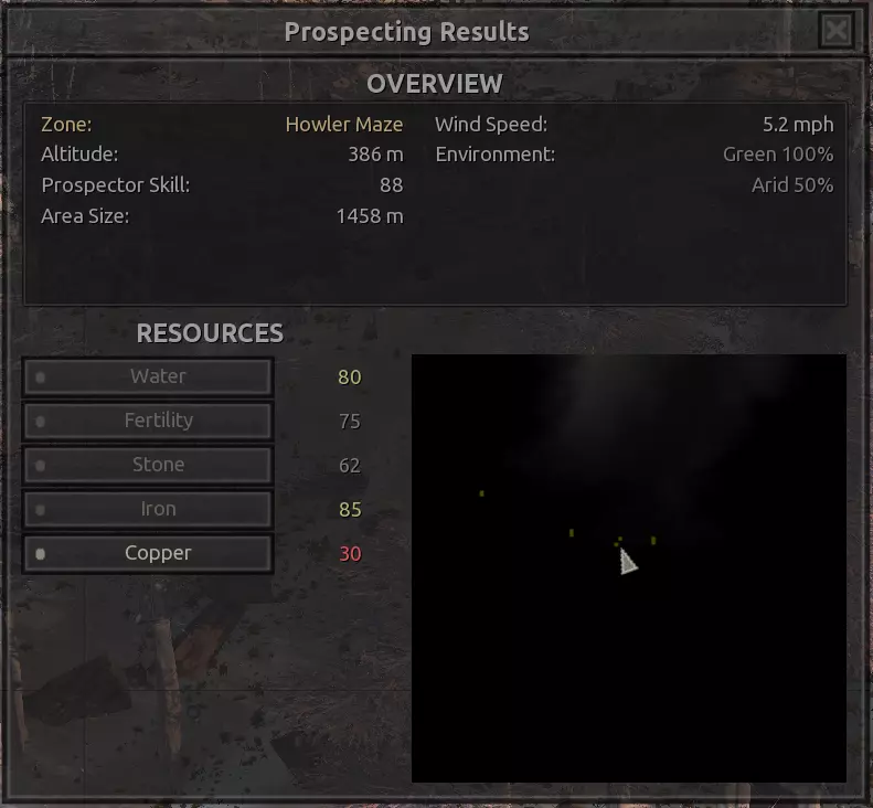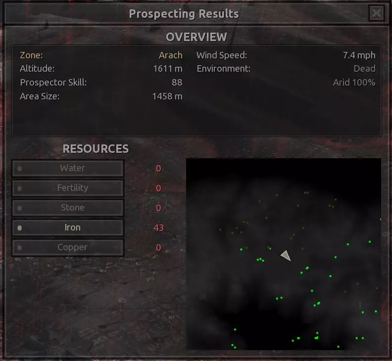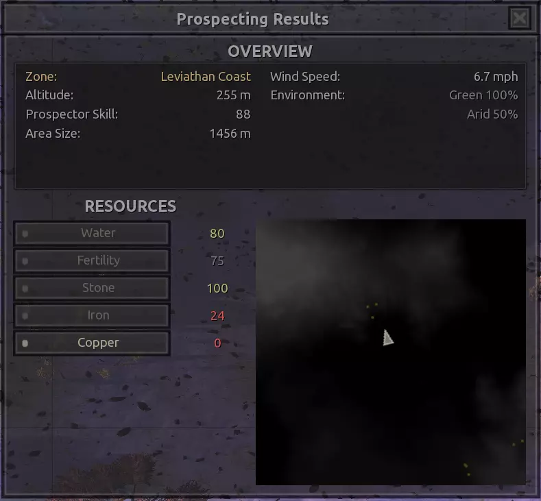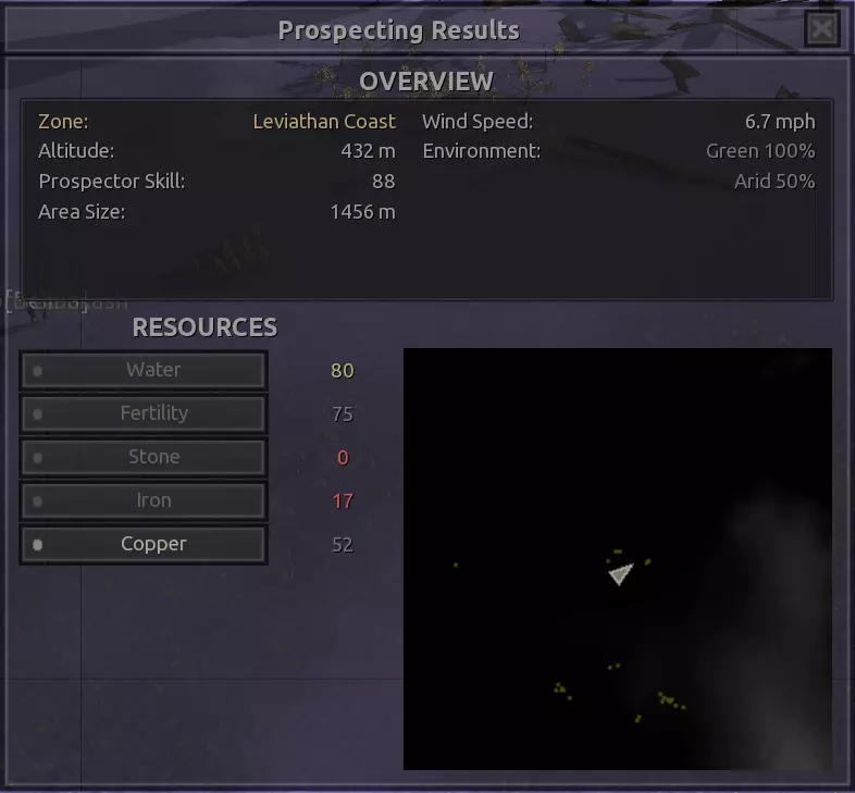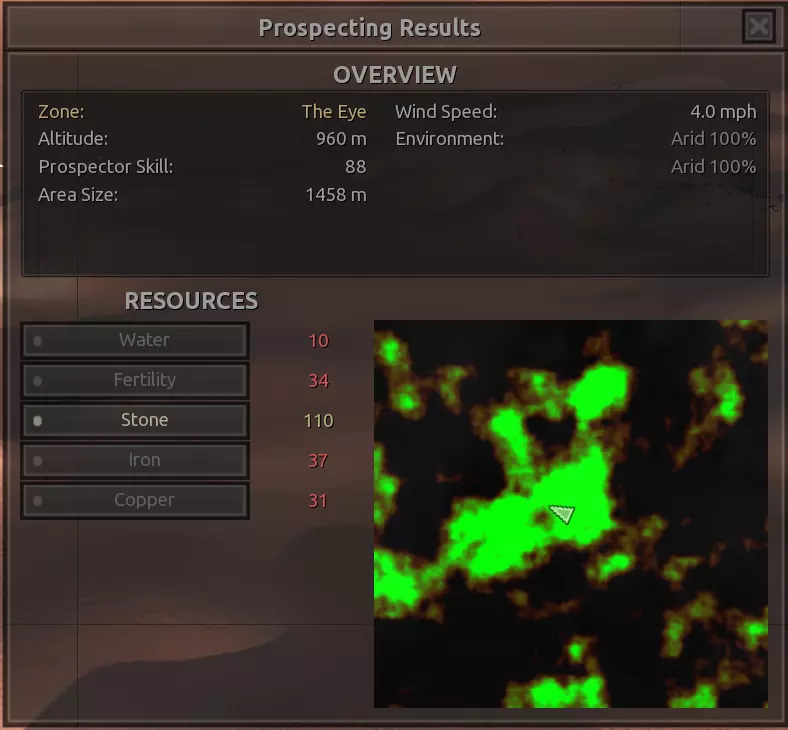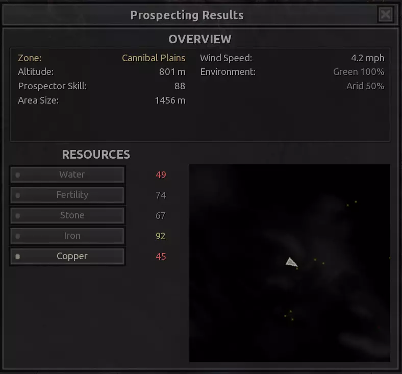 我对这个地方有些看法。这确实是个不错的小绿洲,有什么理由不喜欢呢?不过,资源开采起来很麻烦。你也看到了,铁矿在山坡上,而石头则藏在铁矿旁边那些杂乱的岩石堆下面。我最多只能让两台钻机达到40%的采石效率。同样地,如果你能把钻机放得离铁矿源更近一些,或许能获得更多铁矿,但我最多只能让钻机达到75%的效率。 资源情况:75%铁矿,50-60%铜矿,约30-40%石头,60%水源,90%肥沃度 危险:沙尘土匪袭击、祈祷日、饥饿的土匪群