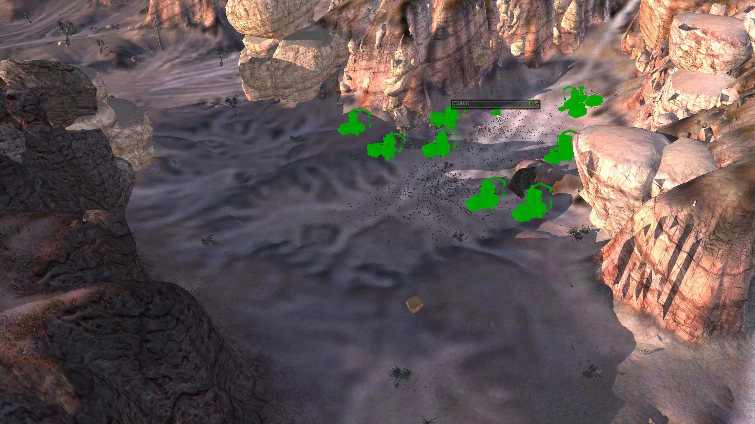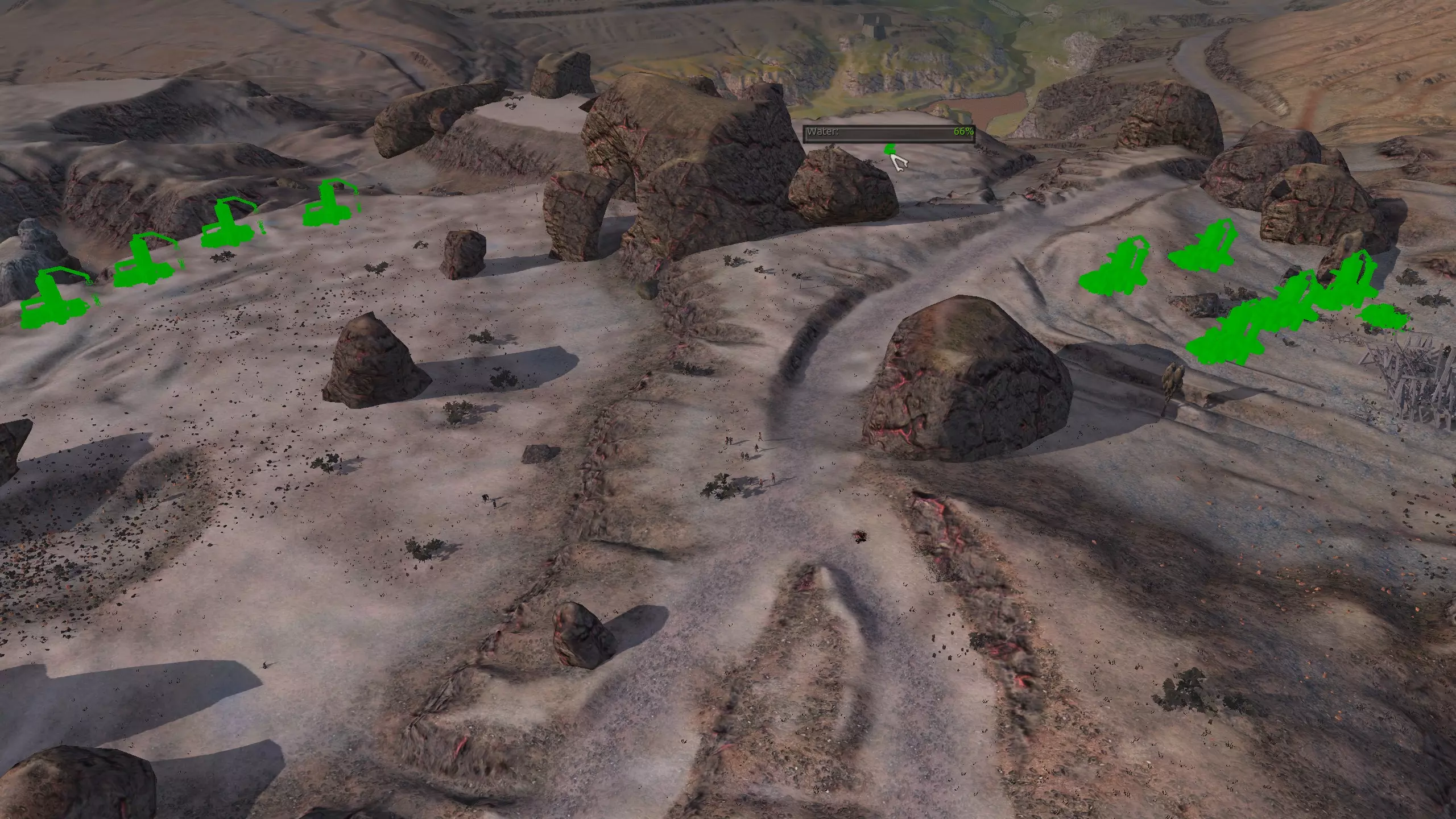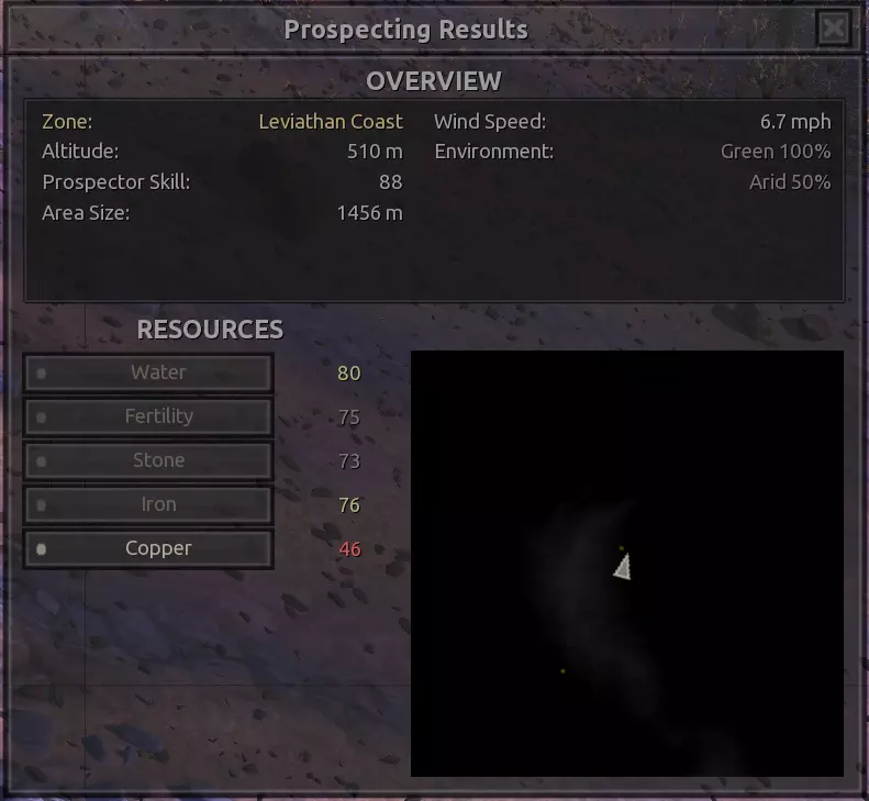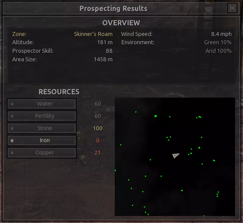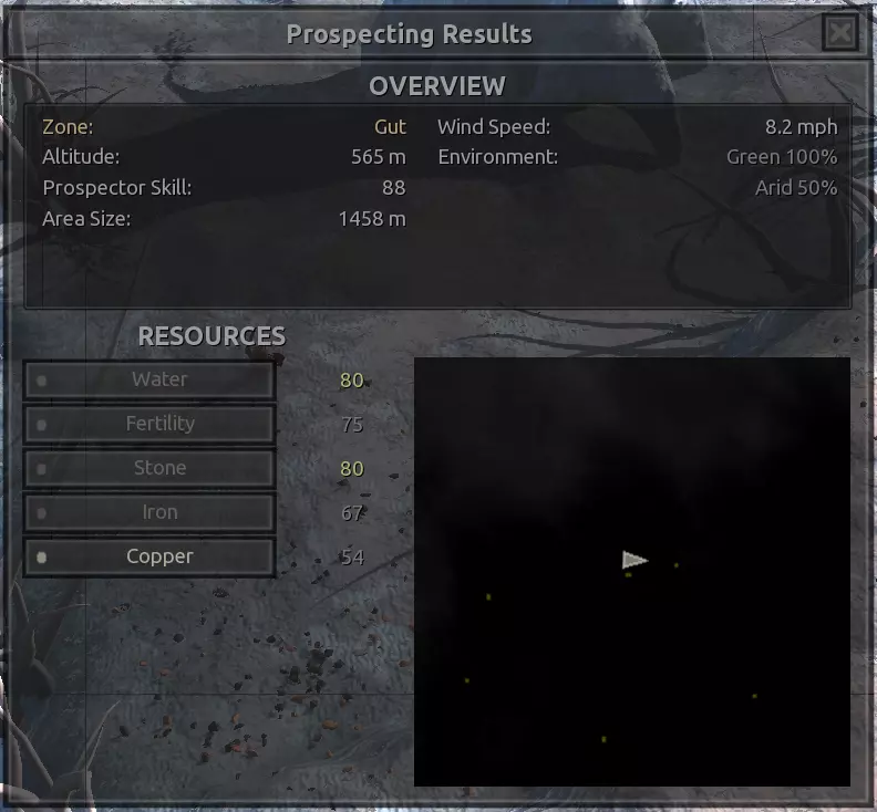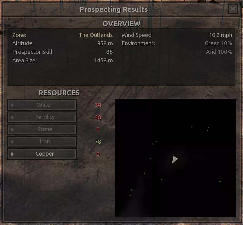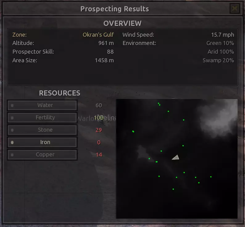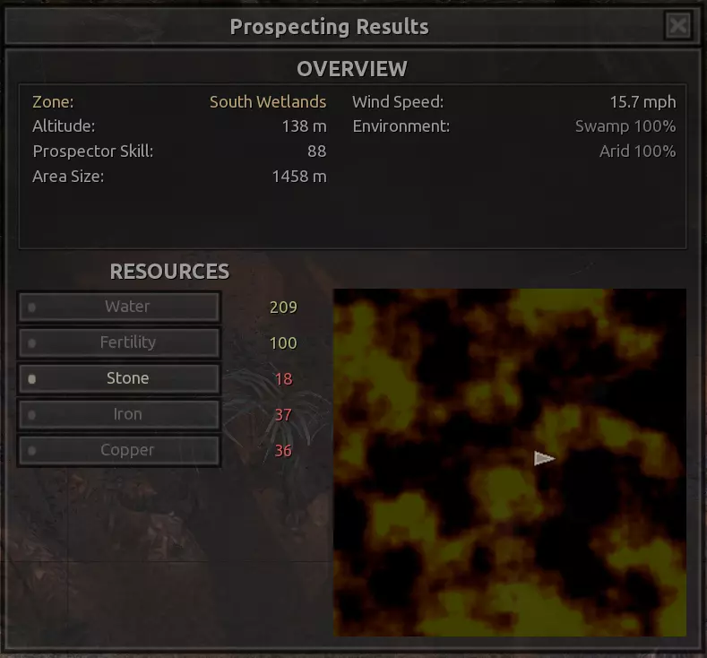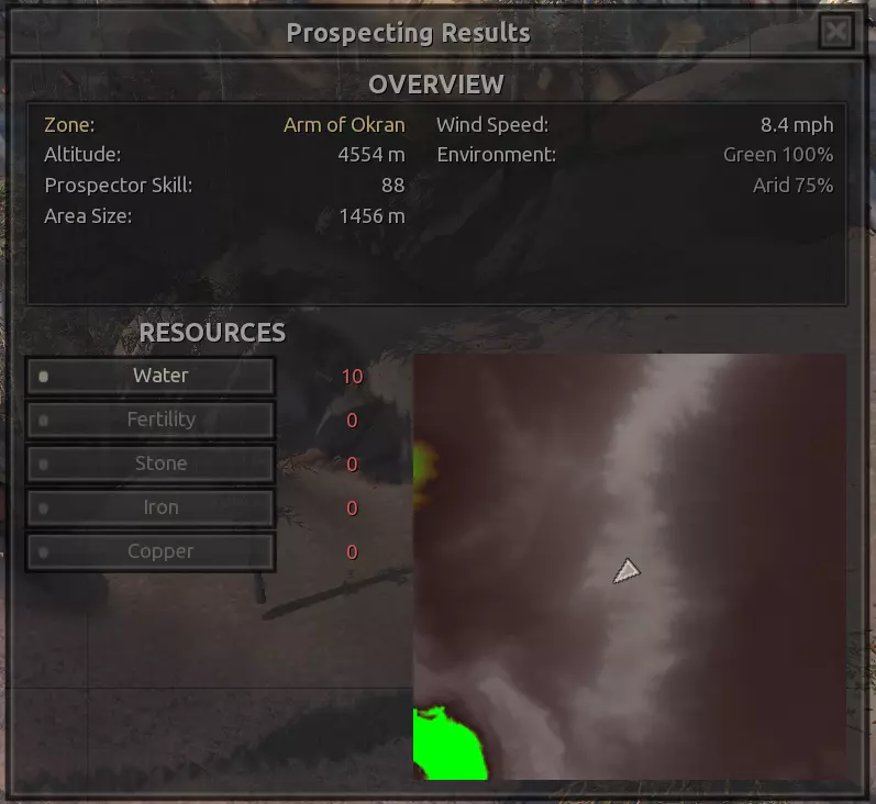 我对这个地方有些看法。这确实是个不错的小绿洲,有什么理由不喜欢呢?不过,资源开采起来很麻烦。你也看到了,铁矿在山坡上,而石头则藏在铁矿旁边那些杂乱的岩石堆下面。我最多只能让两台钻机达到40%的采石效率。同样地,如果你能把钻机放得离铁矿源更近一些,或许能获得更多铁矿,但我最多只能让钻机达到75%的效率。 资源情况:75%铁矿,50-60%铜矿,约30-40%石头,60%水源,90%肥沃度 危险:沙尘土匪袭击、祈祷日、饥饿的土匪群
