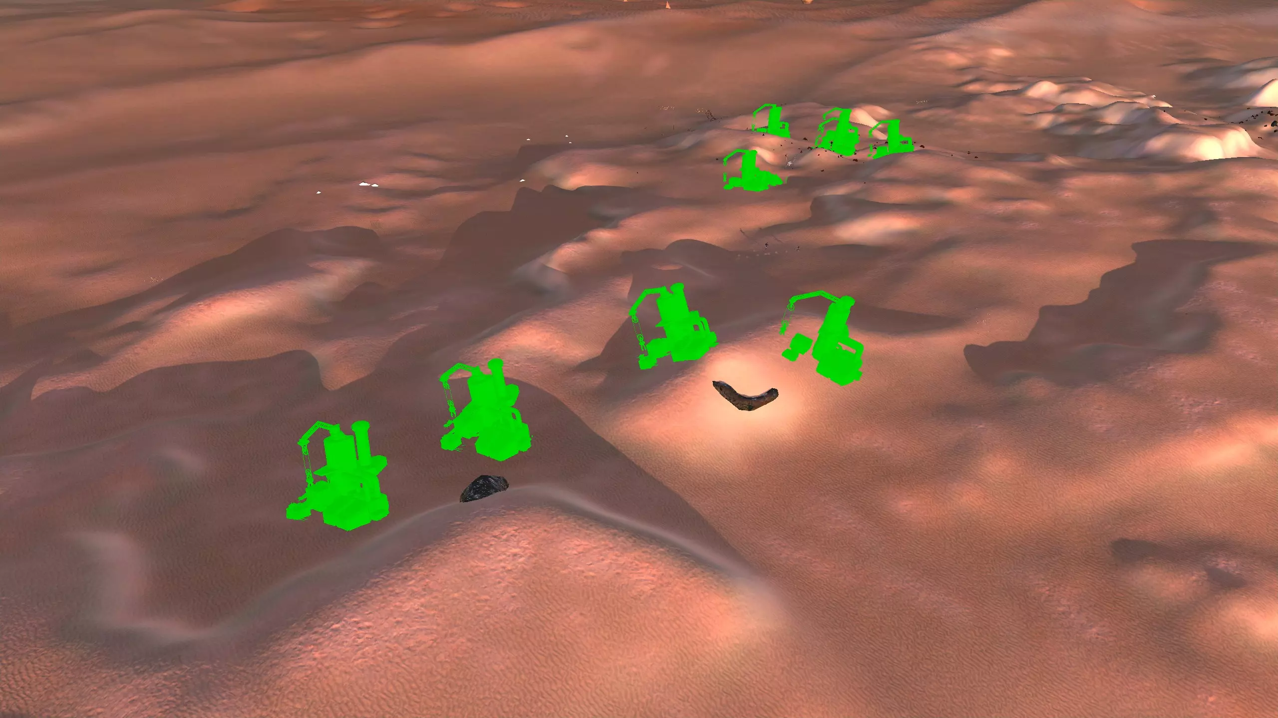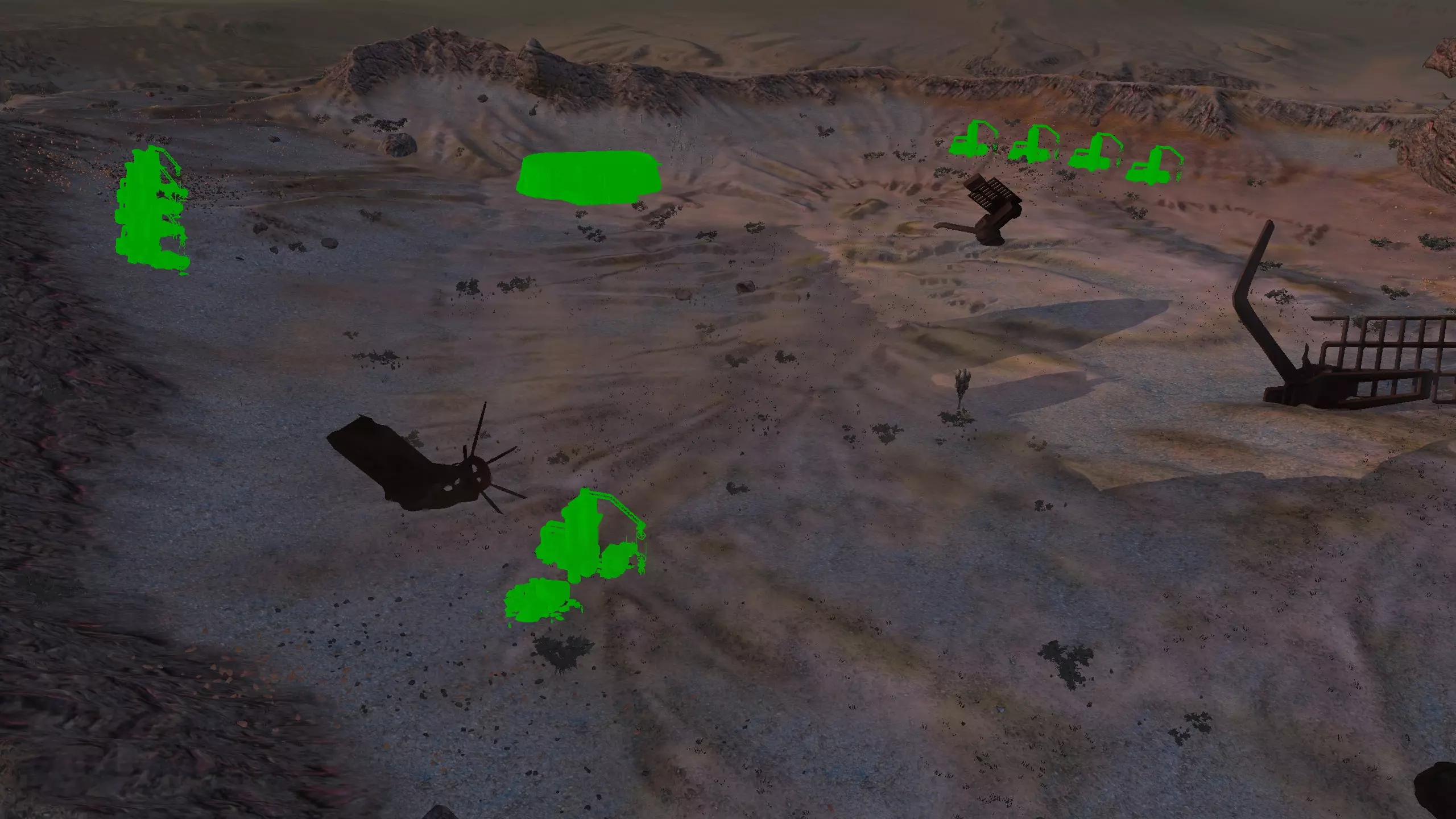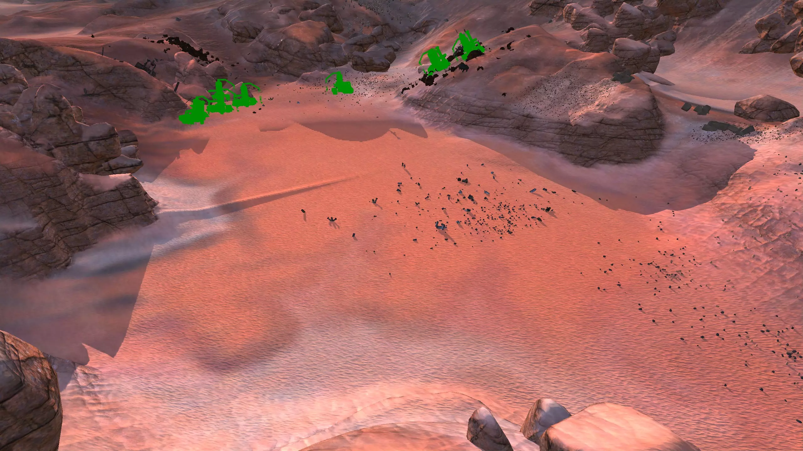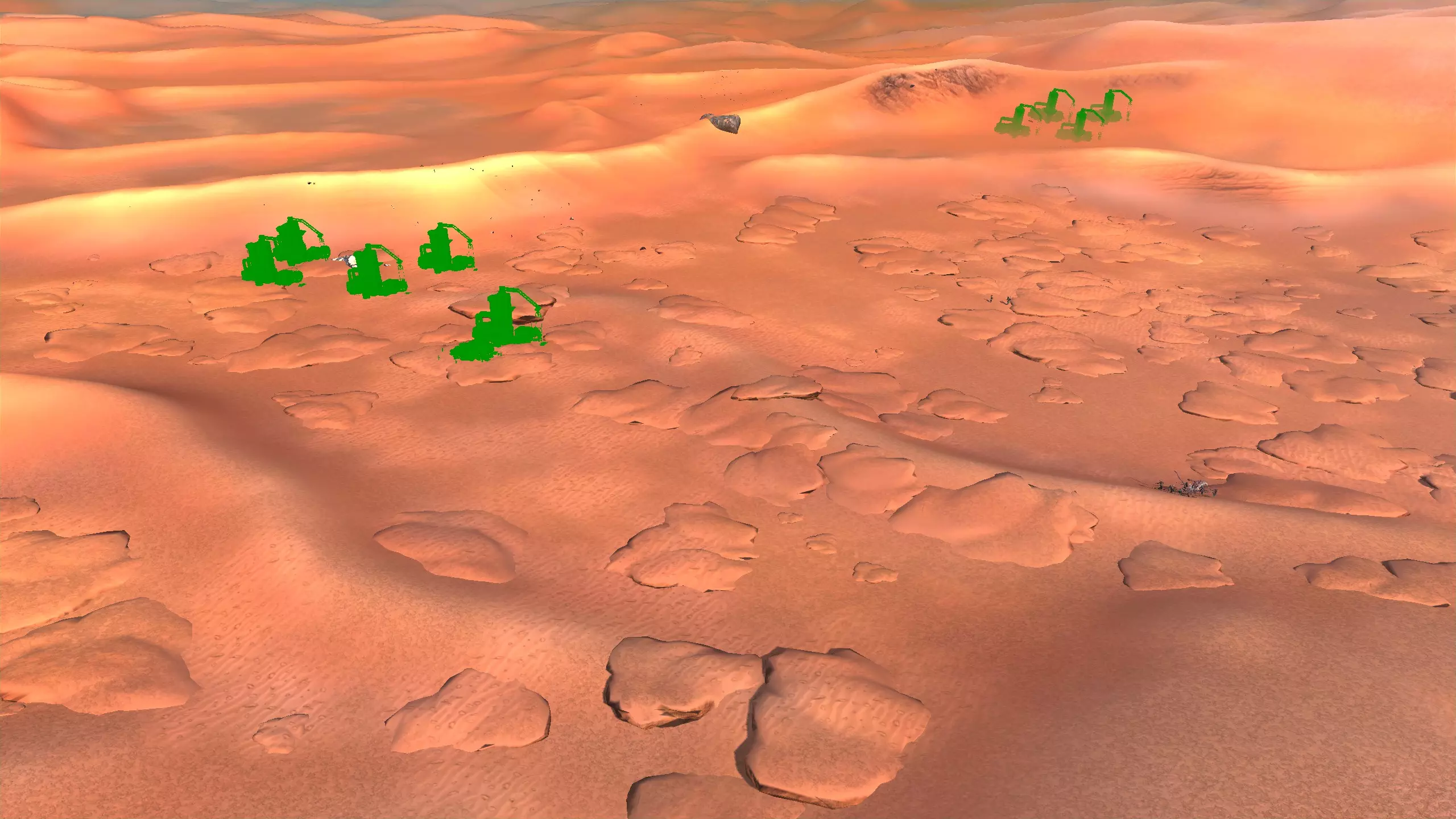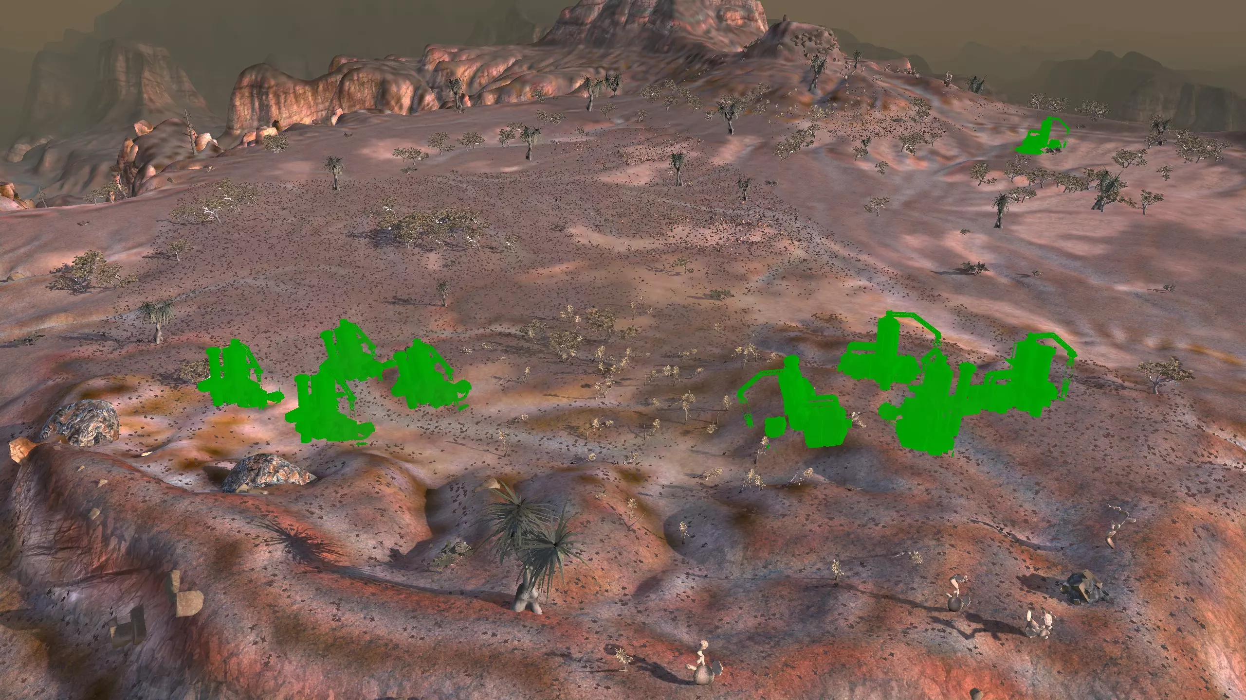 我对这个地方有些看法。这确实是个不错的小绿洲,有什么理由不喜欢呢?不过,资源开采起来很麻烦。你也看到了,铁矿在山坡上,而石头则藏在铁矿旁边那些杂乱的岩石堆下面。我最多只能让两台钻机达到40%的采石效率。同样地,如果你能把钻机放得离铁矿源更近一些,或许能获得更多铁矿,但我最多只能让钻机达到75%的效率。 资源情况:75%铁矿,50-60%铜矿,约30-40%石头,60%水源,90%肥沃度 危险:沙尘土匪袭击、祈祷日、饥饿的土匪群