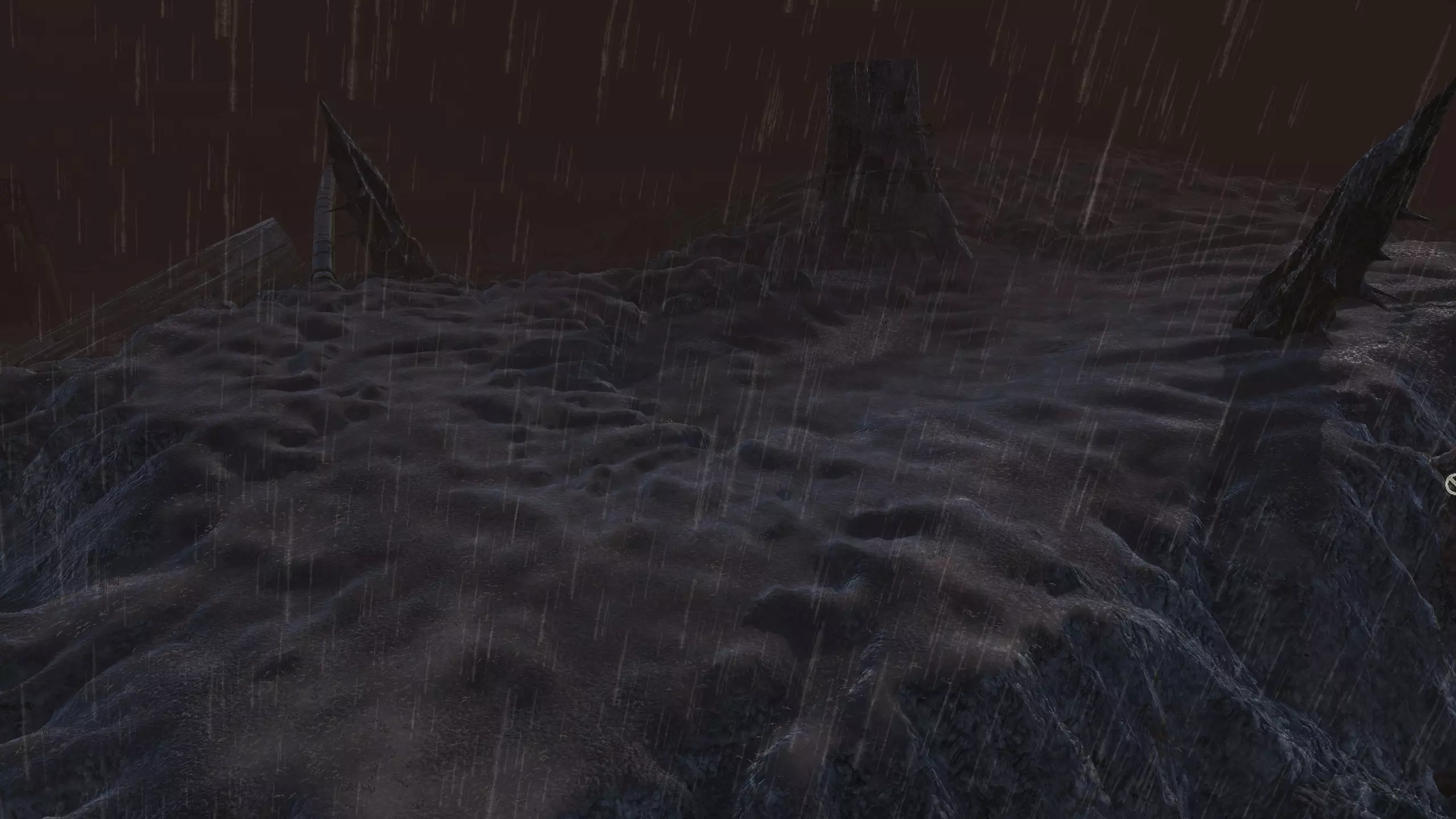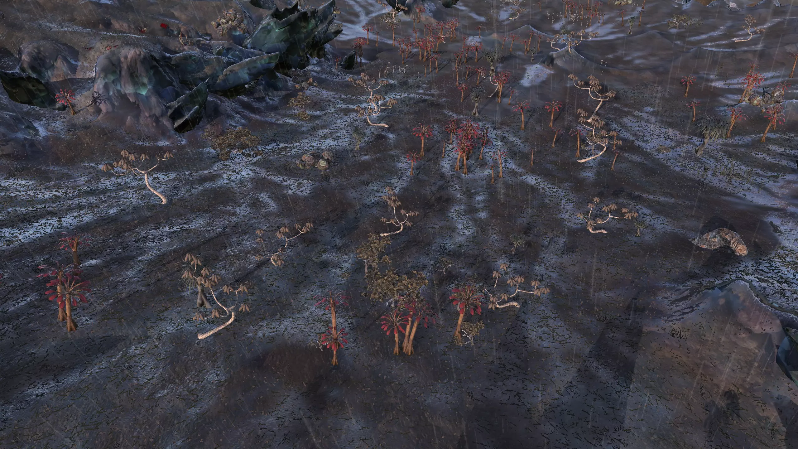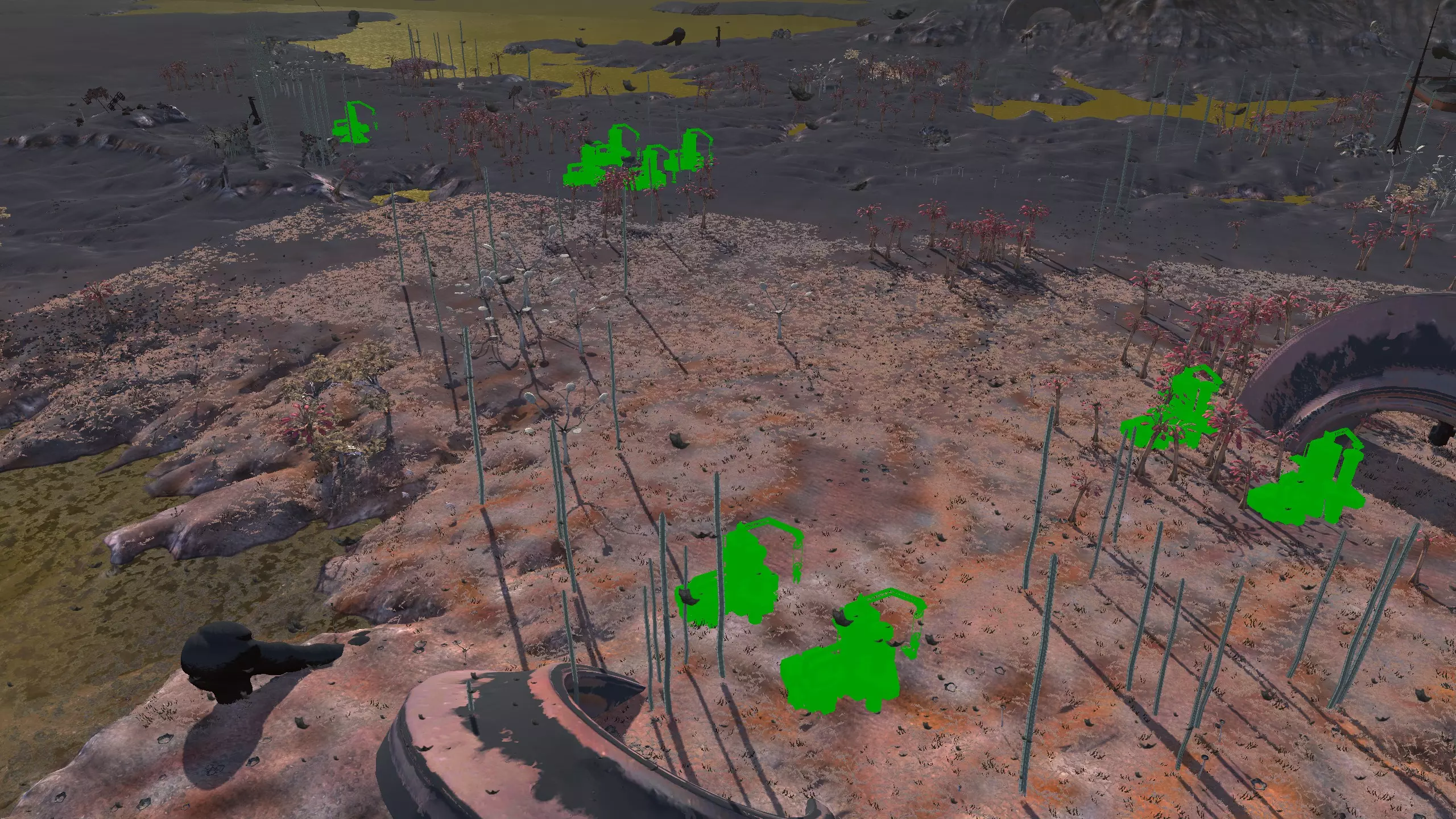 这地方还不错,既有死土地区的独特风格,又有从灰色沙漠飘来的、看起来像雪的粉末状物质。这里有足够的空间供你建造基地,从截图中显示的矿石分布来看,你可以选择向东北方向或南方扩展。甚至可以双向发展,打造一个非常长的基地,怎么合适怎么来。不过,南部区域有一个斜坡直接通向酸液,这或许很有用,因为你可以在那里设置一个单一的大门入口,迫使袭击你基地的敌人试图通过游泳穿过酸液来进入,这会大大削弱他们的实力。 这里矿石资源齐全,这点很好,但没有水源和肥沃的土地,所以只能使用水培种植!记得把水培设施放在建筑物的屋顶上,这样它们才能接触到酸雨。雨水收集器在这里是无法使用的。资源:100% 铁矿,100% 铜矿,70% 石料,0% 水源,0% 肥力 危险:可能有钢铁蜘蛛?说实话这地方相当安静。 特别说明:对于纯原版玩家,这也是我在死亡之地找到的唯一不需要任何模组的地点。你只需要水培设施!