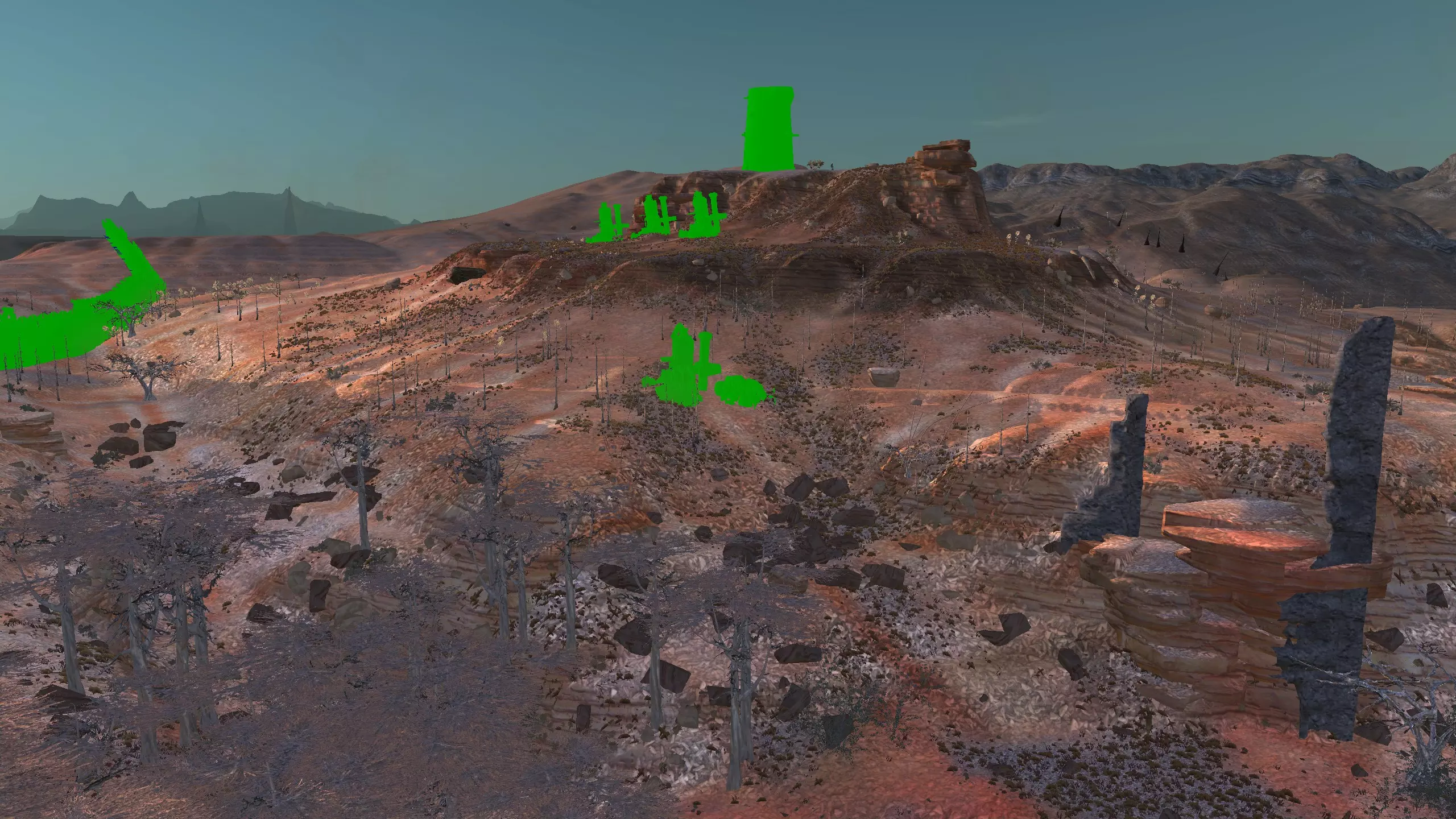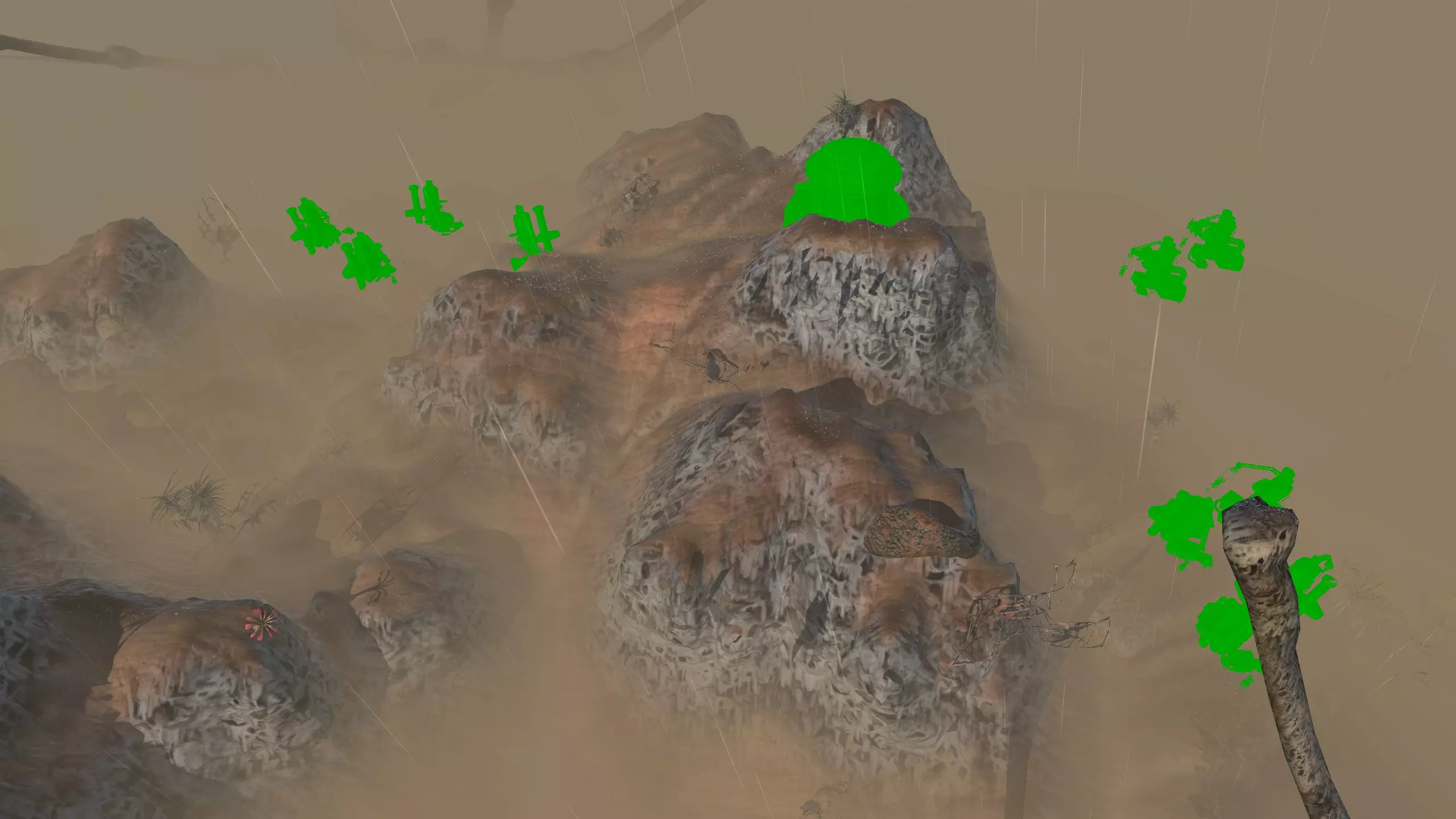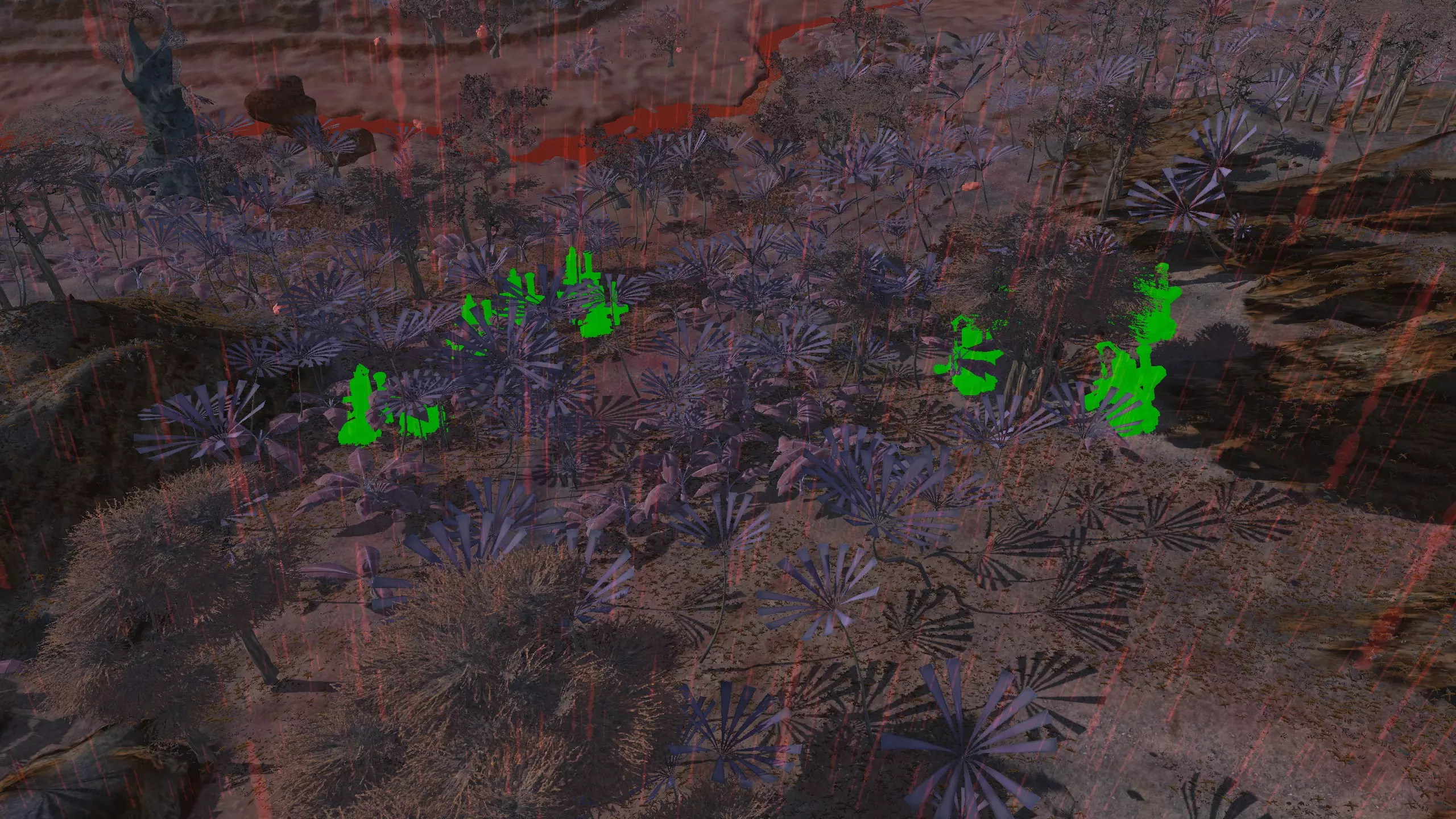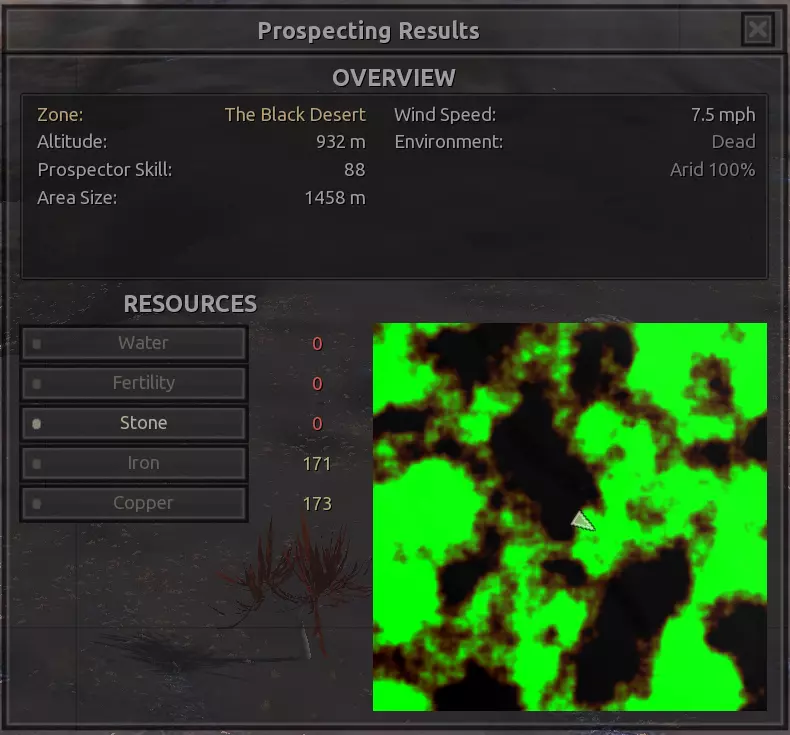 描述:小心酸雨!幸运的是,这是个相对轻微的问题。总之,这里是燃烧森林。酸雨!血蜘蛛。血蜘蛛可能相当可怕,而且被它们击败的后果相当严重,所以要小心。 如果把钻井机放得太靠山下,在山下的铁矿周围筑墙会有点麻烦。此外,你需要把水井建在更靠山下的位置。 资源:90-100%铁矿,100%铜矿,50%石头,10-100%水,100%肥沃度 危险:血蜘蛛!沼泽迅猛龙会吃你的庄稼。 黑色沙漠 警告:如果你的人类、谢克族和蜂巢族角色没有100%的防毒保护(雾面面具、III型面具或沼泽忍者面具),切勿进入此区域!特此警告!此外,不建议将【黑色沙漠】作为你的第一个基地,除非你玩的是纯骷髅派系。