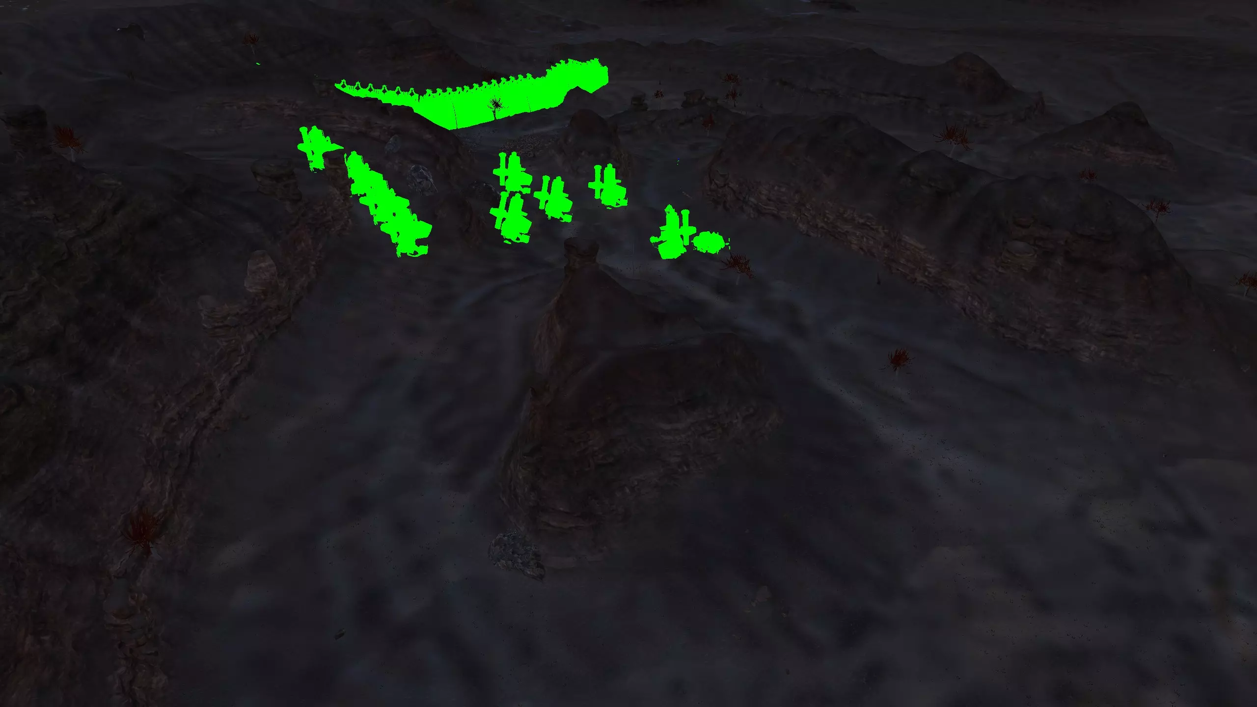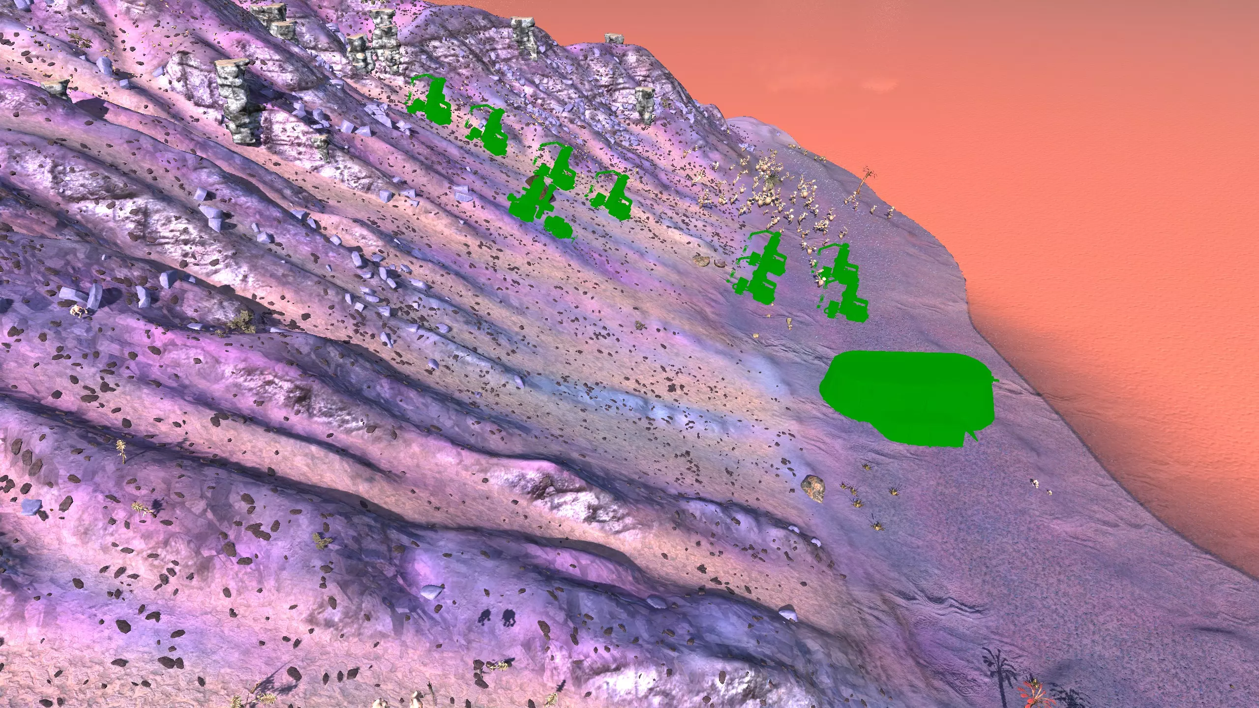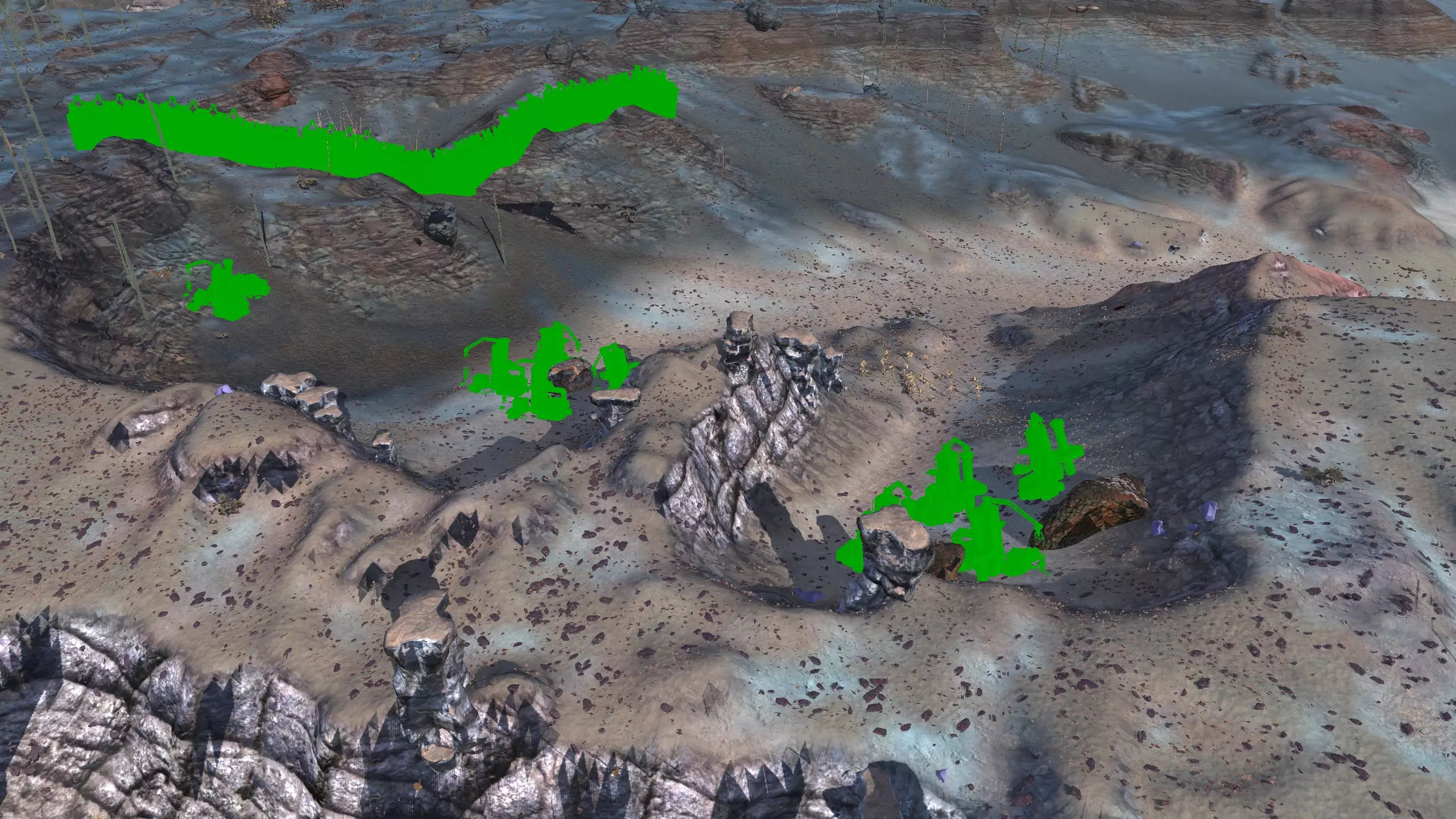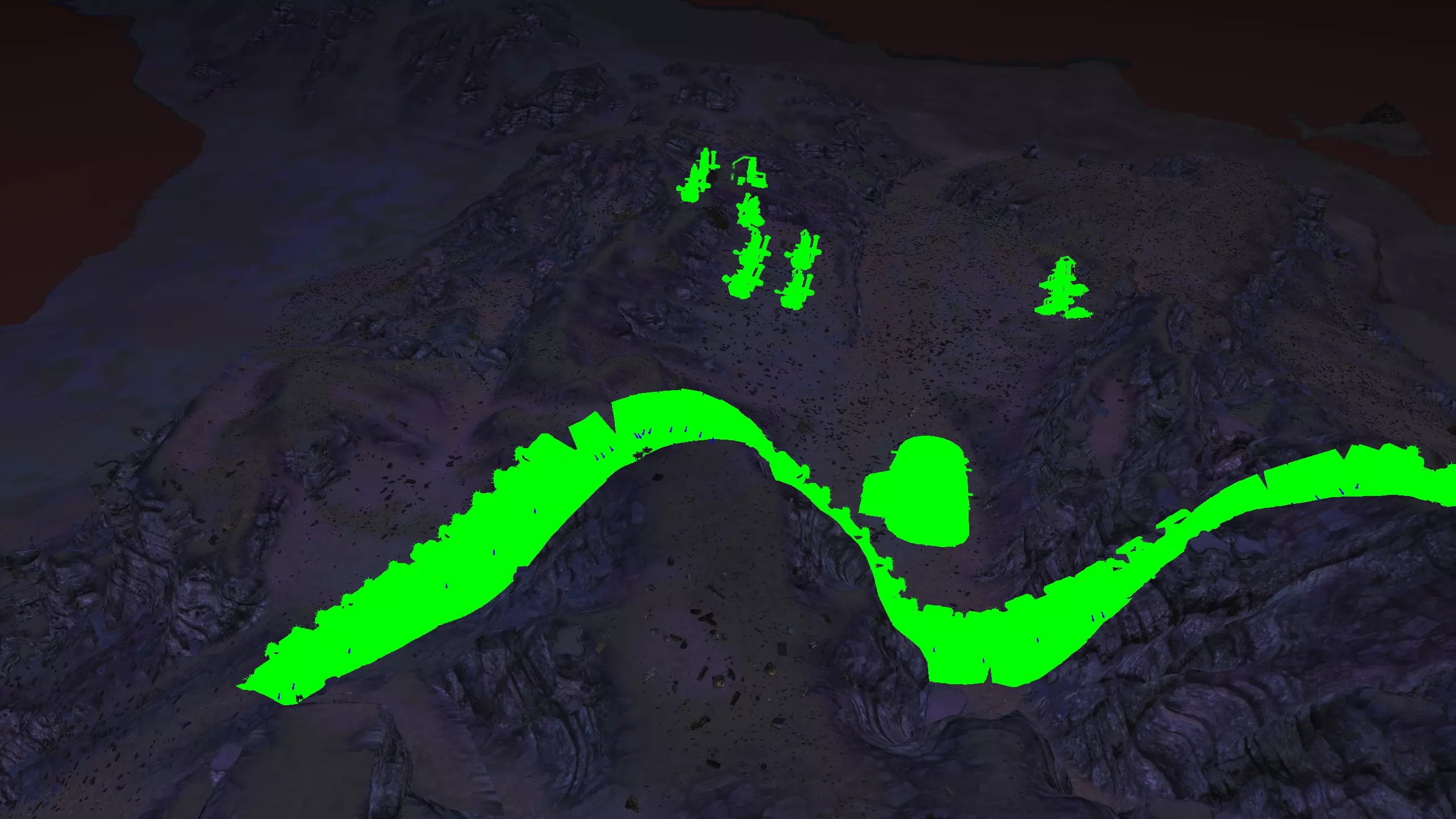 我决定将这里命名为蜘蛛平原而非舜,因为首先只有这片山谷的南端才算舜的范围,其次这个山谷在地图上看起来就像一颗恶心的绿色蜘蛛卵。 不过话说回来,我把这个地点放在这里主要是因为,很难拍到一张好的截图,但这个地方有种独特的风貌,它正好位于一个被极高山脉环绕的山谷盆地中,而且地势平坦。虽然确实需要模组才能充分利用这个地点,但它还是挺有意思的,值得一看。 资源:0% 铁矿,约60% 铜矿,100% 石料,60% 水源,90% 肥沃度 危险:皮肤蜘蛛、 kral's chosen、狂战士、骨犬、骸骨乐队。这里还会触发沙克族事件,比如征税等。