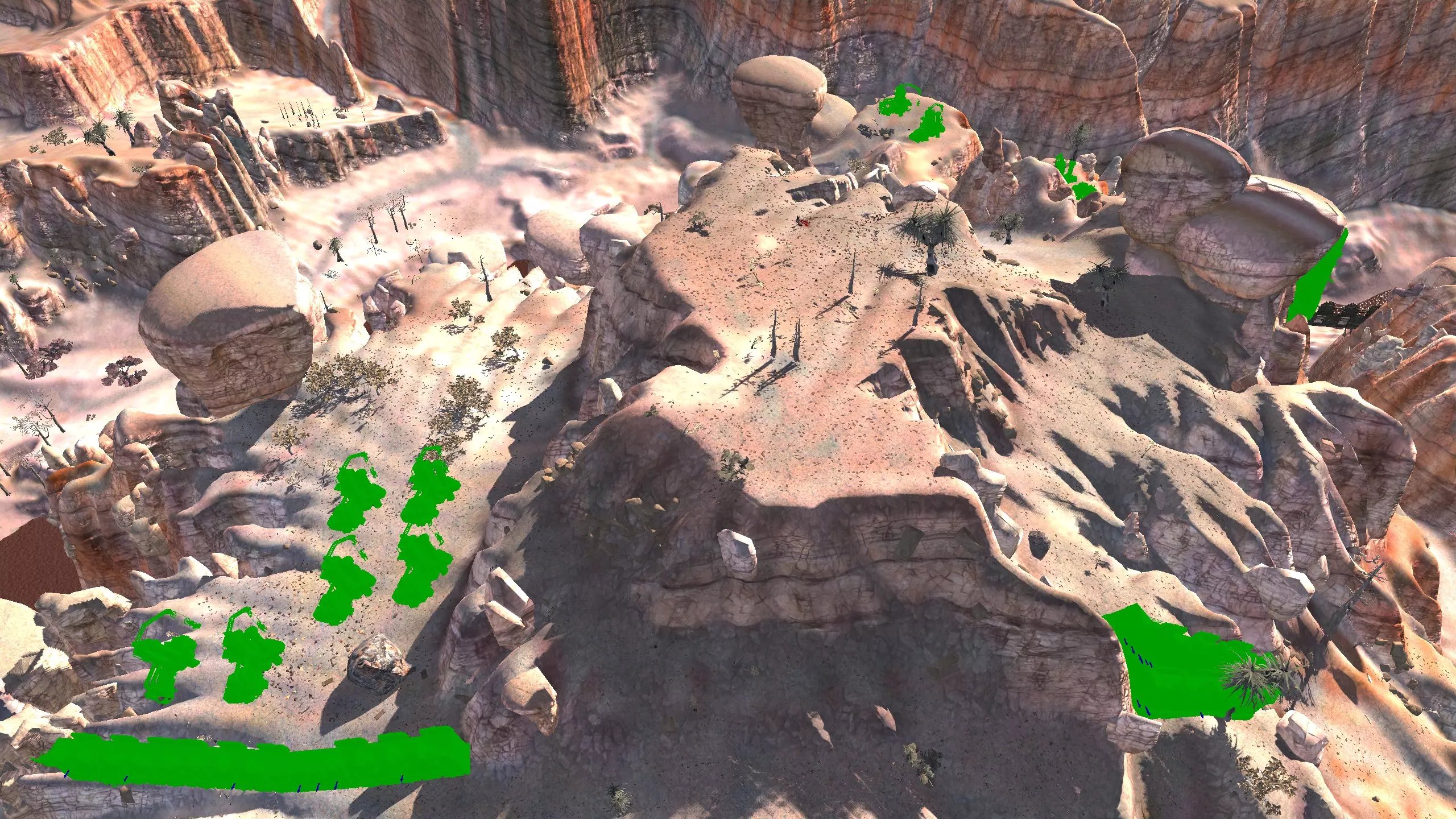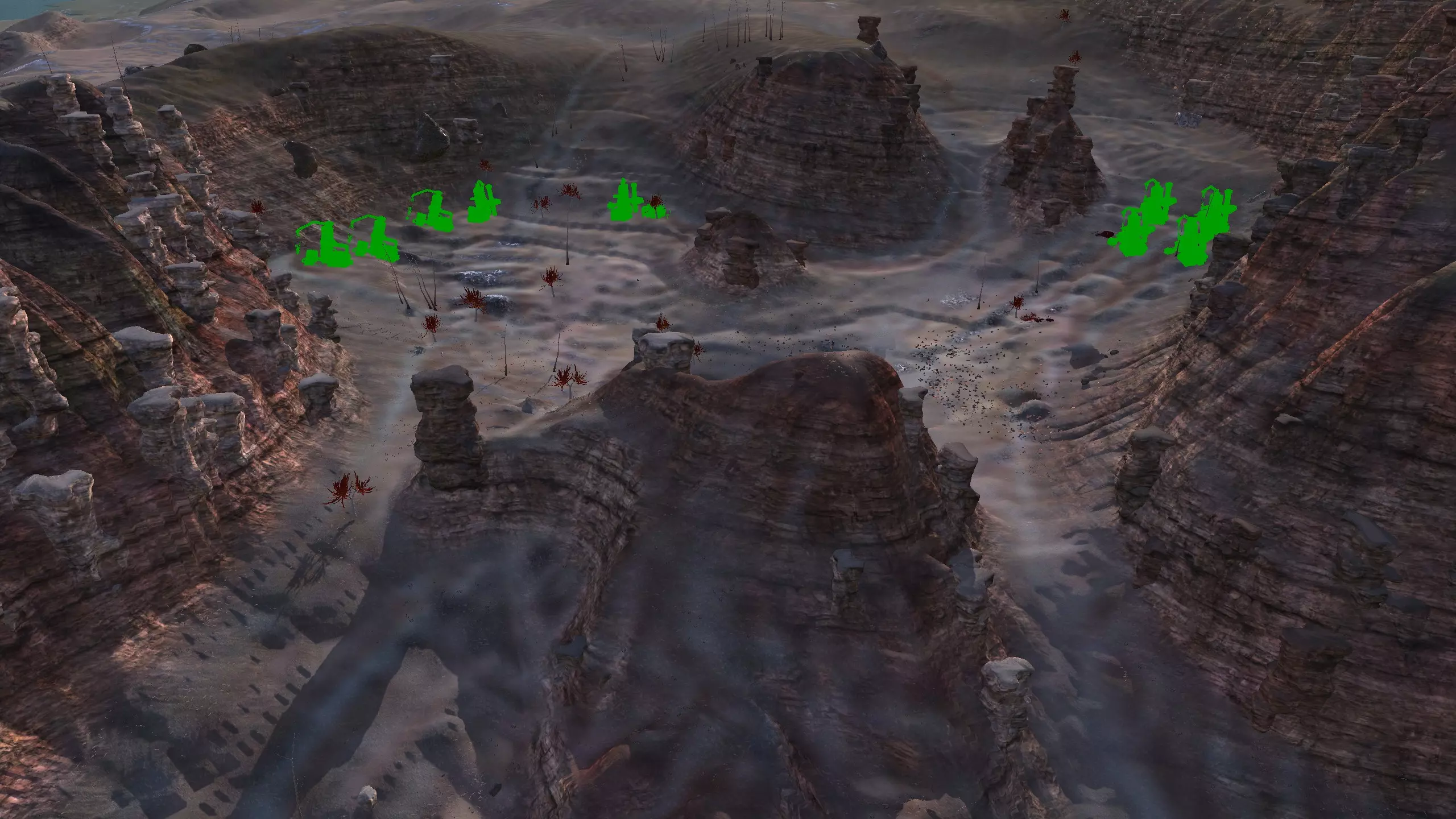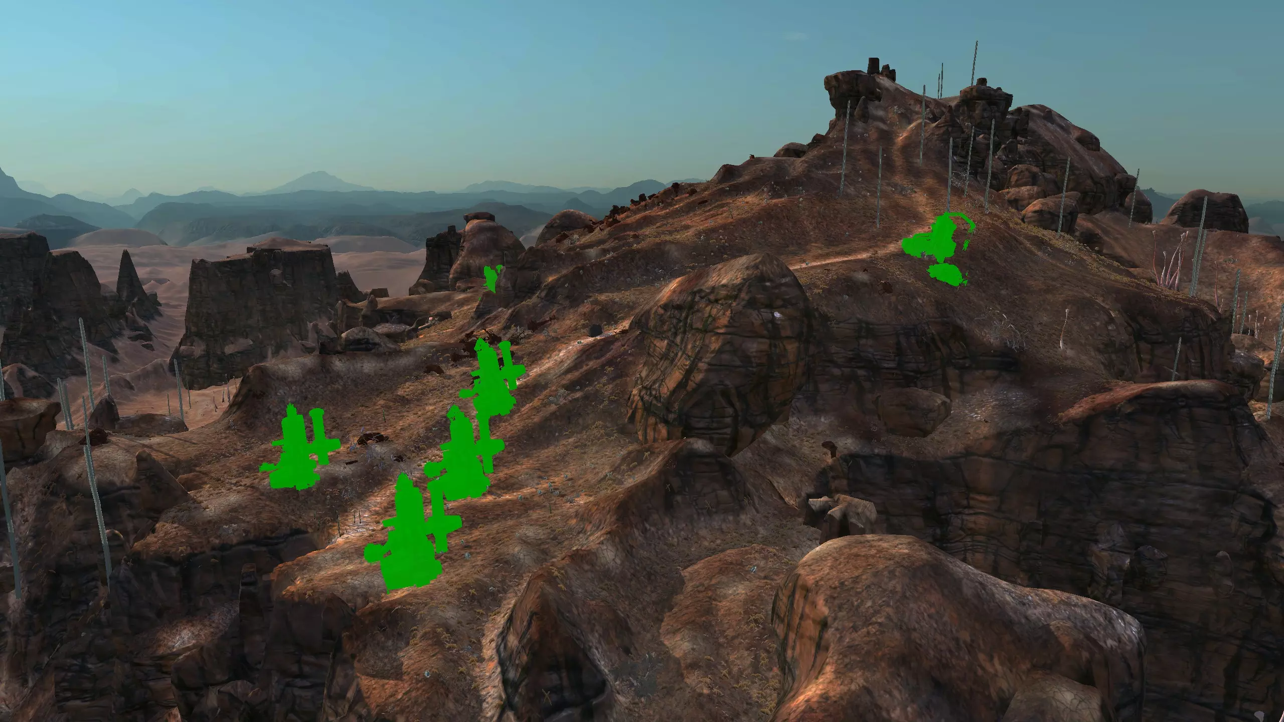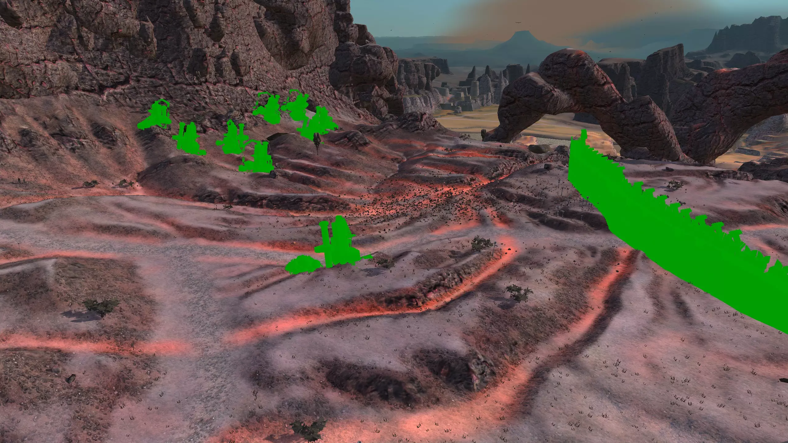 描述:左侧的墙壁是附近NPC聚落生成的禁止建造区域。 这座分层的环形山顶非常棒,无论是作为军事前哨站,还是建造具有垂直层次感的防御基地,都是绝佳地点。这里靠近一些沙克族军事前哨站,对于任何以沙克族为核心的玩家派系来说,都是理想的定居点。 注意,你只能从附近的山脉获取铁矿。你可以选择使用深钻采矿,不过这取决于你自己的决定! 资源:0%铁矿,50-60%铜矿,70%石材,24-50%水源,90%肥沃度 危险:皮肤蜘蛛、 kral's chosen、狂战士、骨犬、骸骨乐队。这里还会触发沙克族派系事件,如征税等。 2-S) 脊柱峡谷,斯坦沙漠 脊柱峡谷 1)