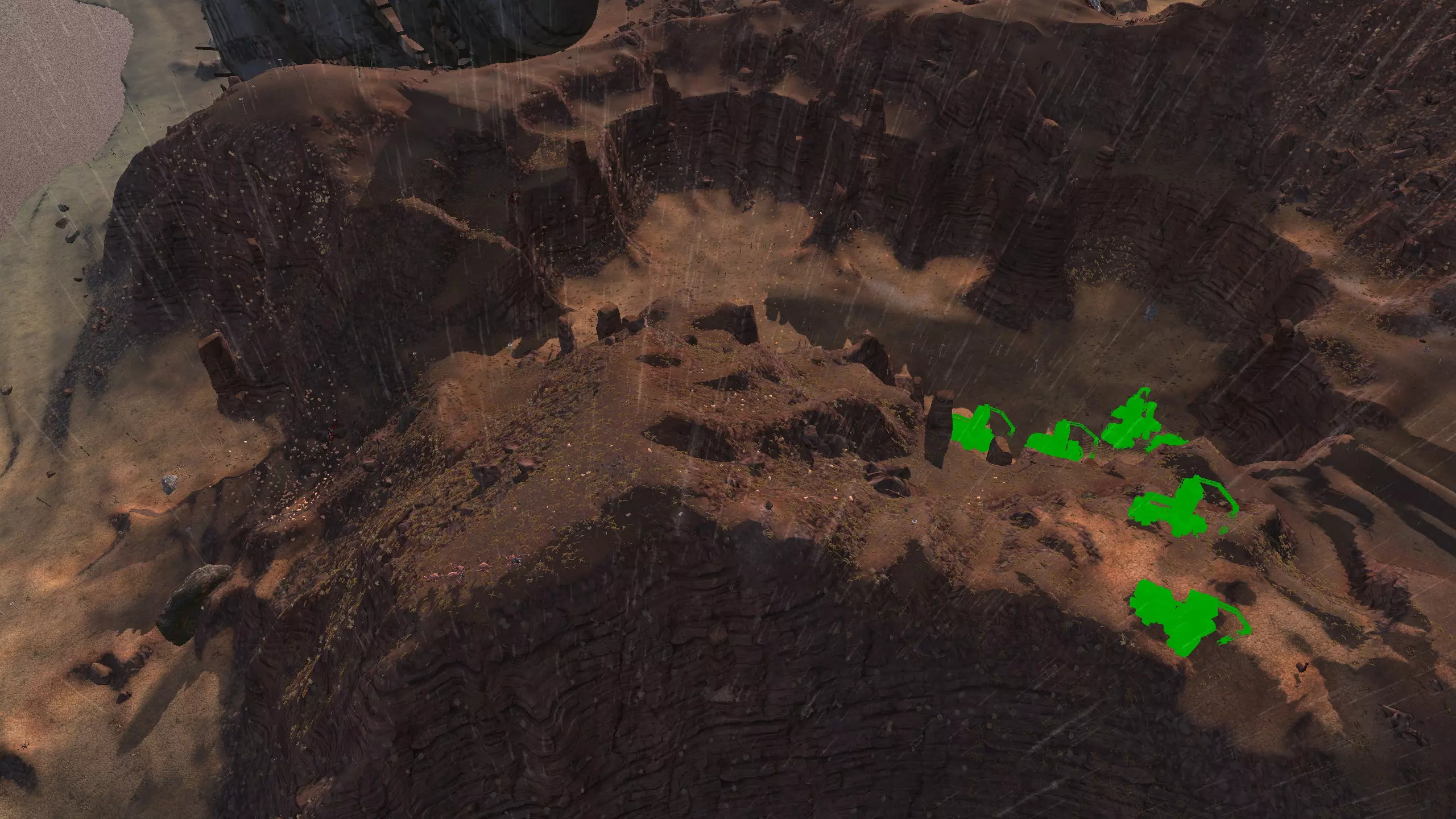 这张截图拍得不是很好,但说实话,要拍好这个地方确实挺难的。不管怎样!这里的布局有点独特,因为右边的悬崖上有丰富的铜矿,而山谷里则有铁矿和石头,实际上所有建筑都应该建在山谷里。你可以在周围的山上建一两个瞭望塔,以及任何你觉得需要的墙壁。 哦对了,顺便说一下那雨?是酸雨。哦,而且这里是游戏中最危险的区域之一。不过!地形很酷!另外,这里只能进行水培种植。附近的【前哨站】会阻止你往太北边建造。这应该不成问题,只是要记住这一点。 资源:100%铁矿,100%铜矿,100%石头,约70%水,0%肥力 危险:螃蟹、螃蟹掠夺者、咕噜怪……还有更多。