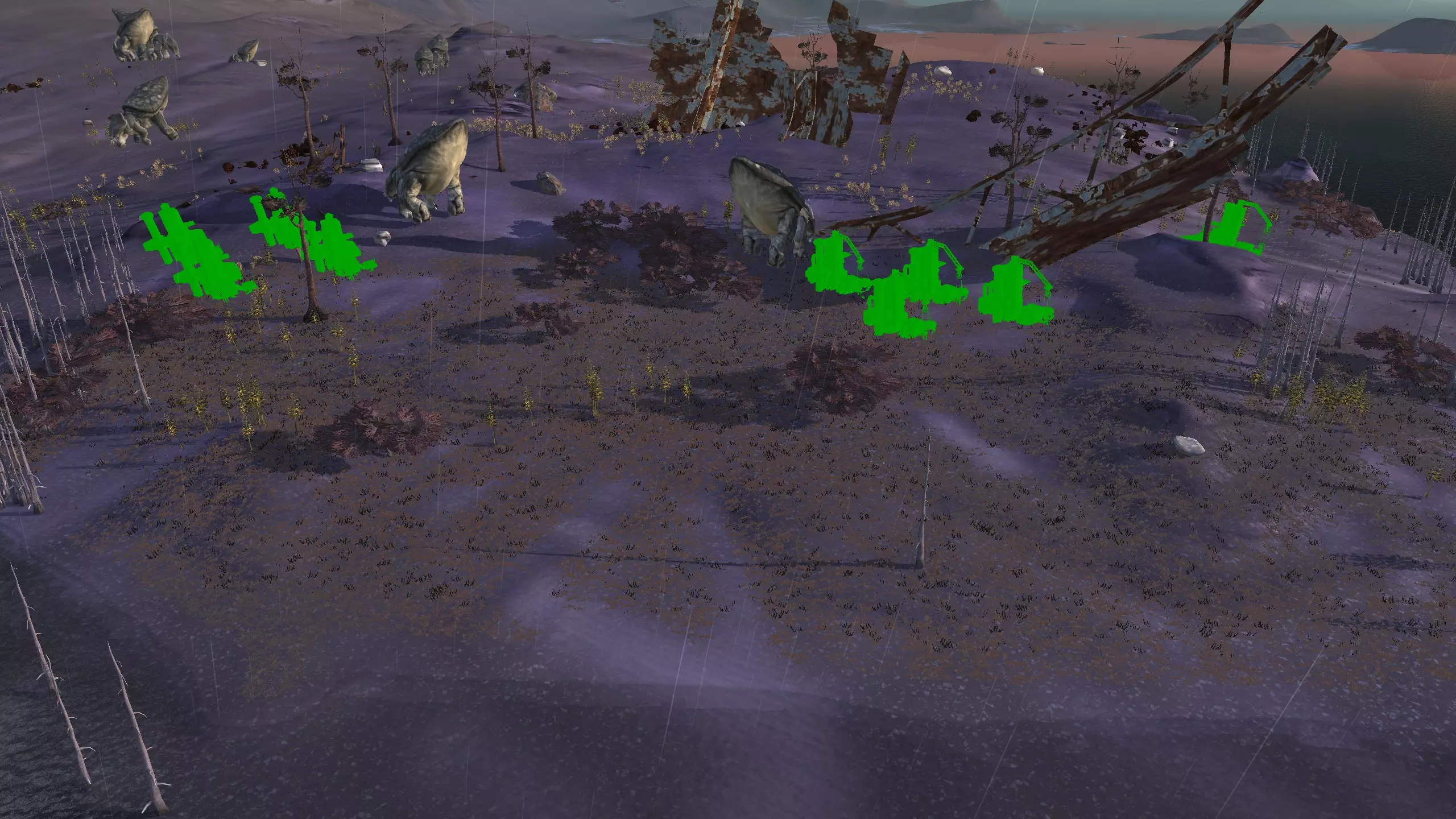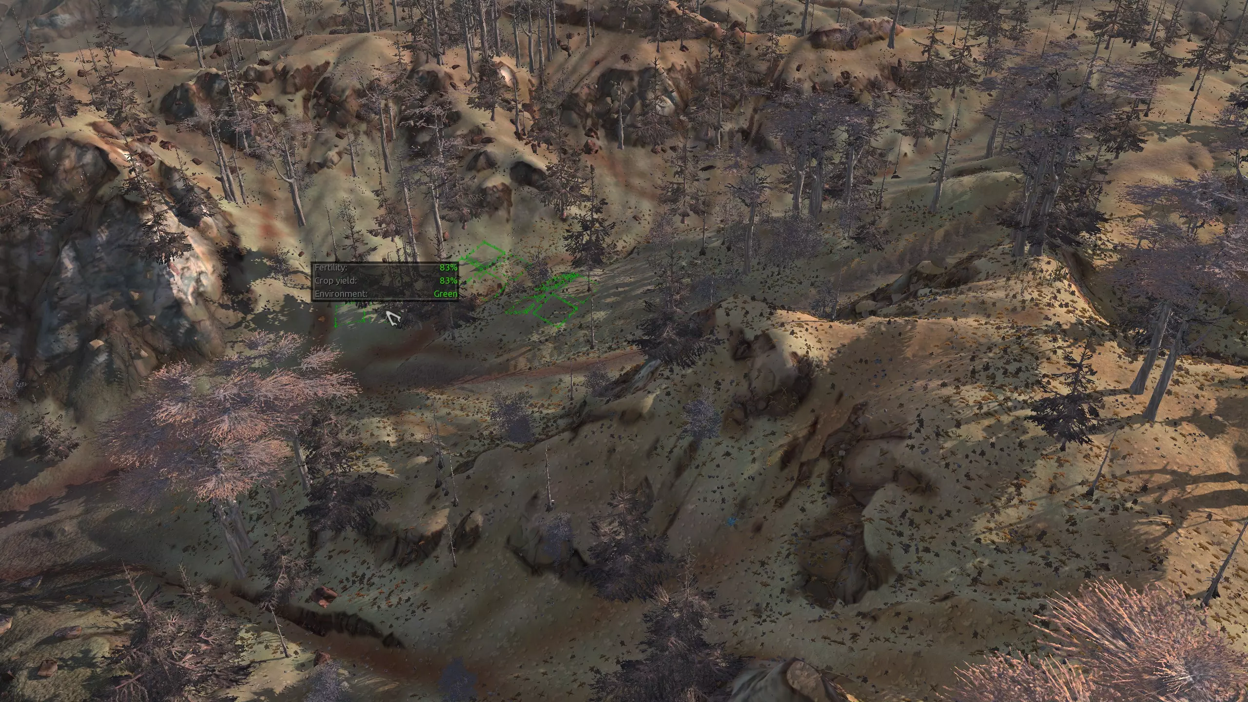 这个地点正好位于坐标网格的中央,这让我有点恼火,所以我破例拍了一张奇怪的截图。 不管怎样,这个地点是建造山地基地的绝佳位置!不过,山顶的土地肥力为零,但山下的山谷却有肥力。问题在于,除非你想建造一个真正庞大的巨型基地并向西或向北扩展,否则东边直接沿着陡峭悬崖下去的区域,可能是放置水井和农场的最近地点。 如果你想在山顶建造一个防御严密的要塞和城堡,而把防御薄弱的农场等设施建在城墙外,从主题上来说可能会很有趣。或者,考虑使用水培技术,如果山顶的水源条件不佳,或许可以升级 moisture farming enhanced。资源:100%铁,50%铜,100%石头,20%水,0-75%肥力 危险:草地海盗、拾荒者、叛乱农民、骨犬、喙嘴兽、黑犬、奴隶商队、贵族猎人。 2-S) 尖叫森林 尖叫森林 1)