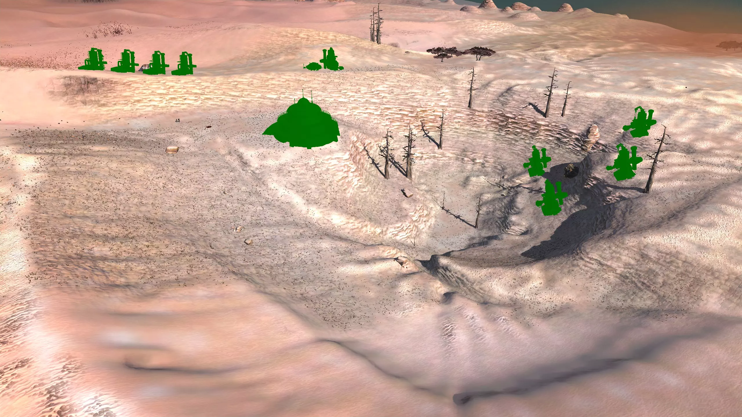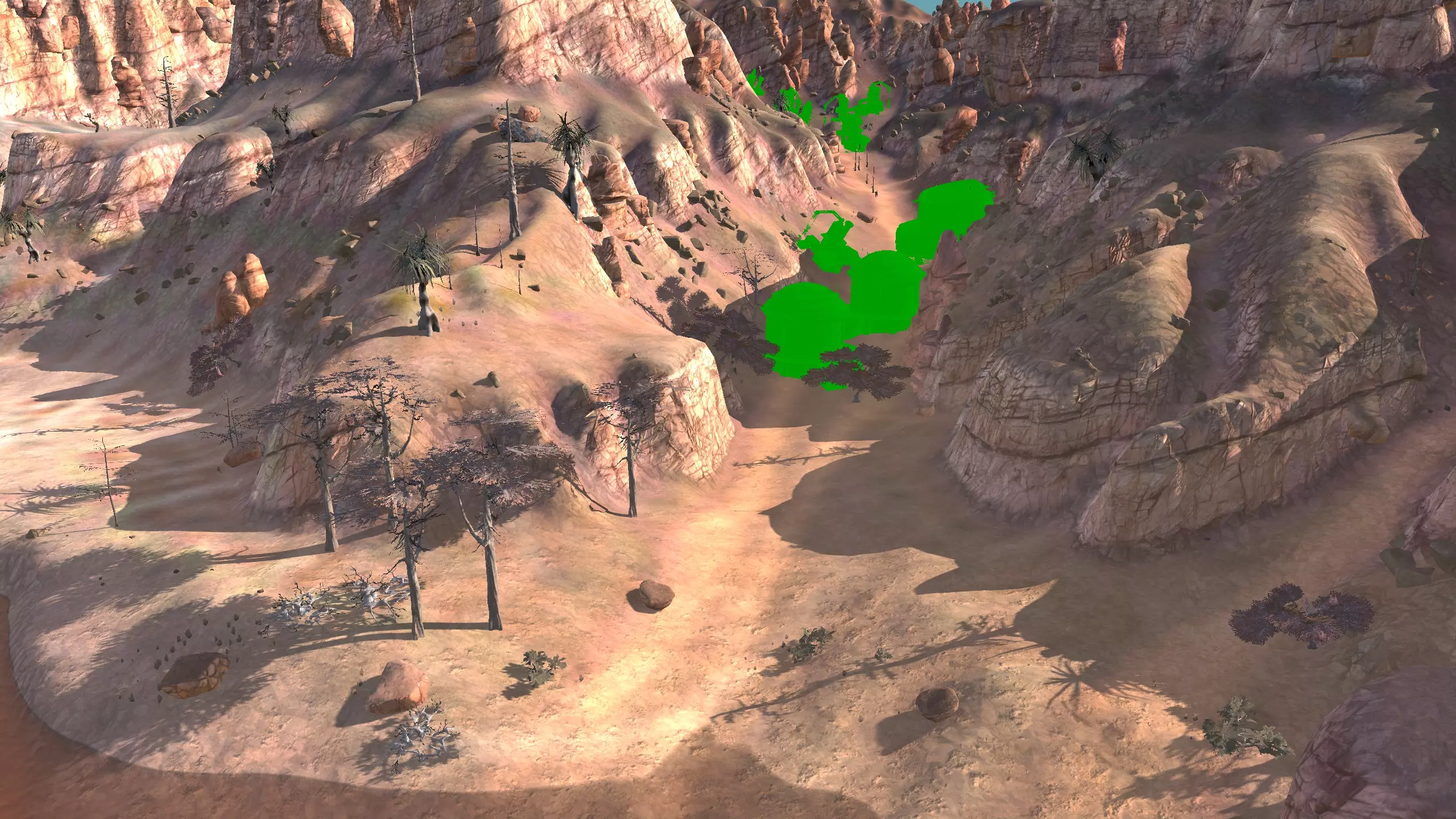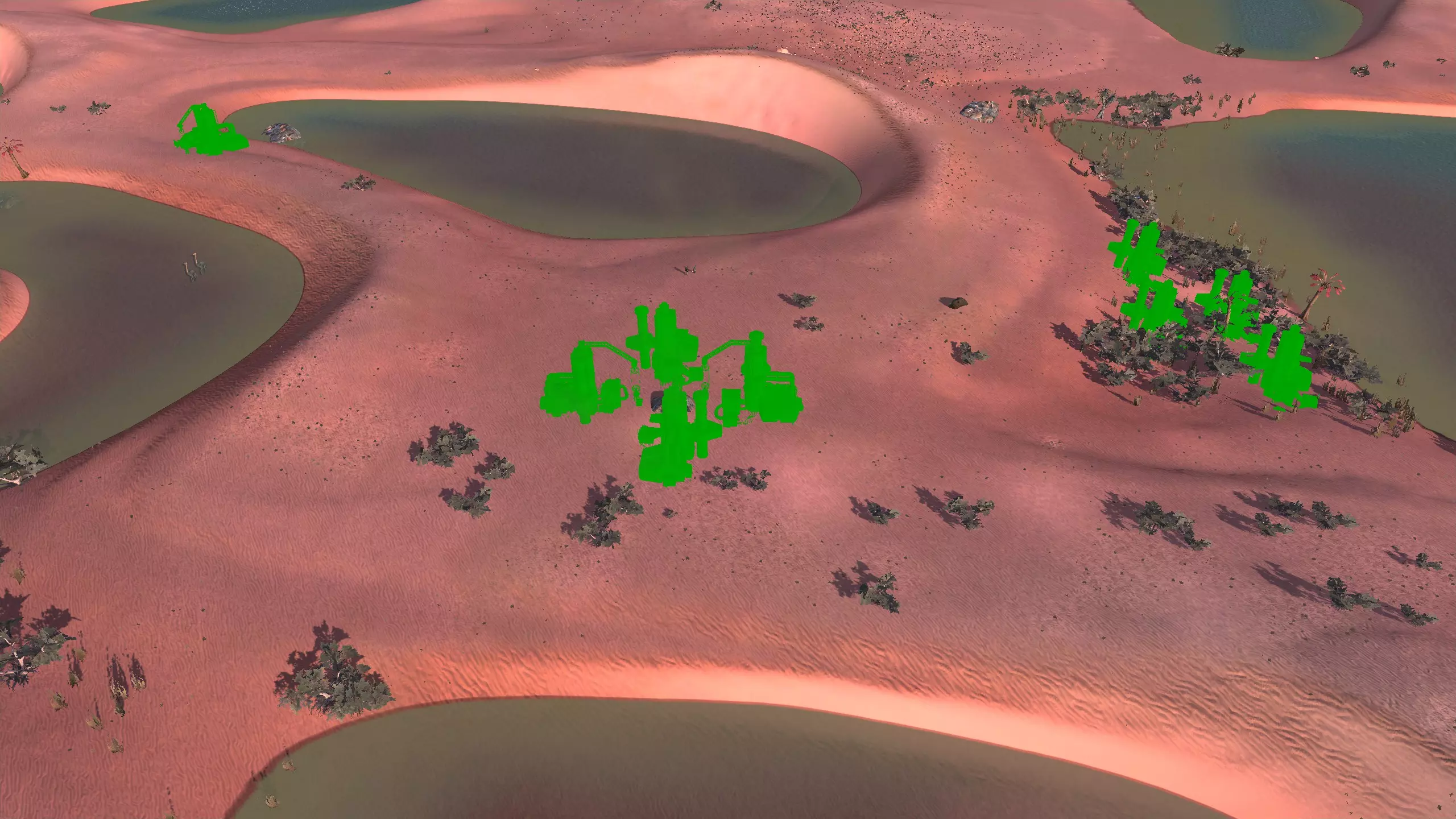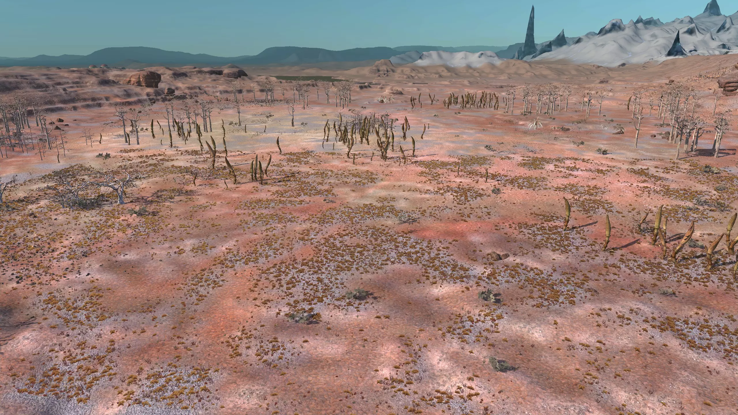 描述:这里可能是古特地区最无聊的定居点,但也是最轻松且最高效的地方。它实在太无聊了,我得翻看之前拍的截图才能想起它长什么样。上面的截图并没有展示出你所有可建造的区域,镜头左右两侧还有很大空间,所以如果你想在古特建造一座宏伟的城市,这里就是你的不二之选。 这个地点看起来似乎就在区域的边缘,但我周围仍能看到不少排水沟。如果你真的想让敌人穿过尽可能多的排水沟才能到达你的基地,不妨考虑选择古特2号地点。如果你不想让一棵巨大的铁树位于基地中央,可以将它向左或向右偏移,使其位于城市的某一侧,但这或许能成为一个不错的角色扮演元素。也许你的派系视铁为“神圣之物”,因此这些树便是神圣的象征。好了,关于这个区域我就说这么多。 资源:100% 铁矿,约50% 铜矿,100% 石料,80% 水源,约90% 肥力 危险:我不想剧透。 2-G) 大沙漠 大沙漠 注意:在探索大沙漠时,我发现了比预期多得多的潜在基地选址。整个区域资源丰富,而且面积非常广阔。我在此只指出最佳或最值得注意的地点。如果你觉得我下面列出的地点都不合你口味,可以自己去探索这个区域,但要记住,外面有很多无聊的沙丘。你可能会发现,就连我的列表里也有不少无聊的沙丘。 1)
