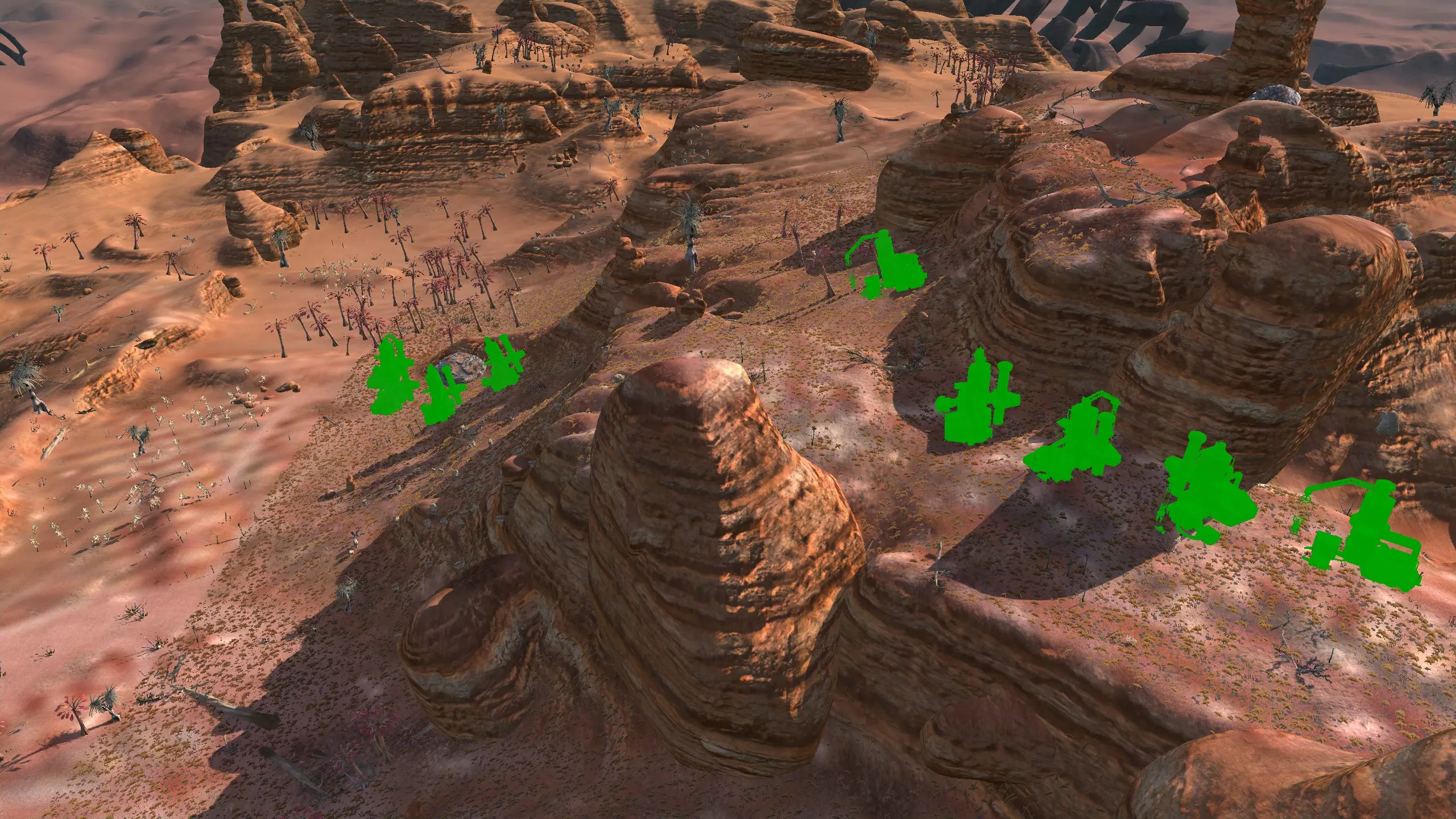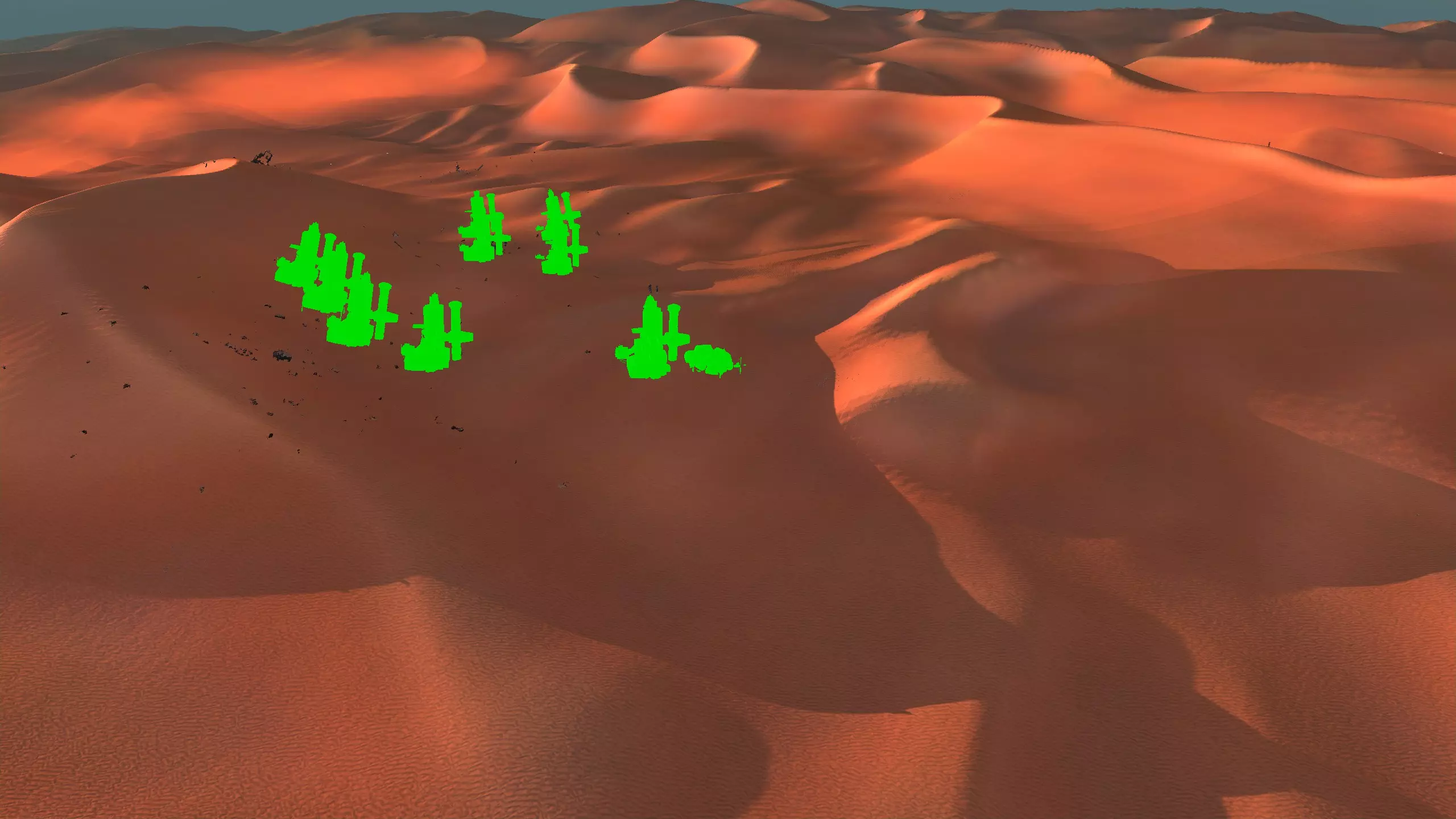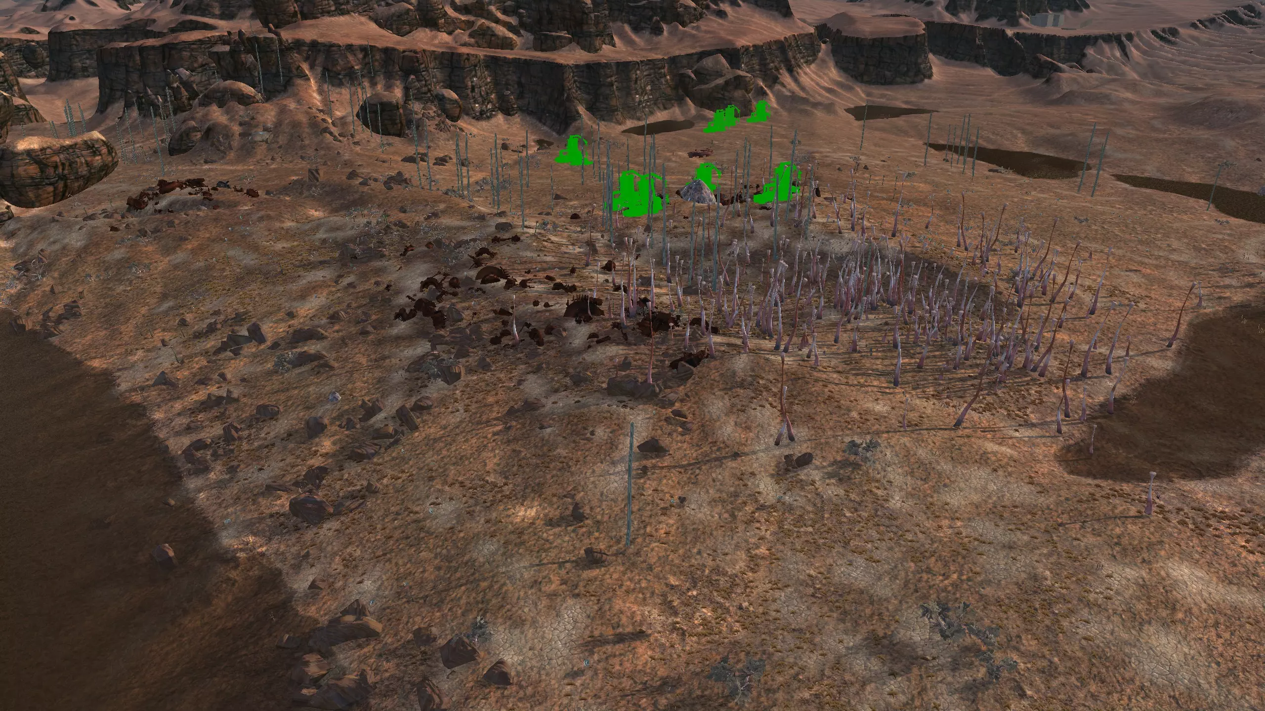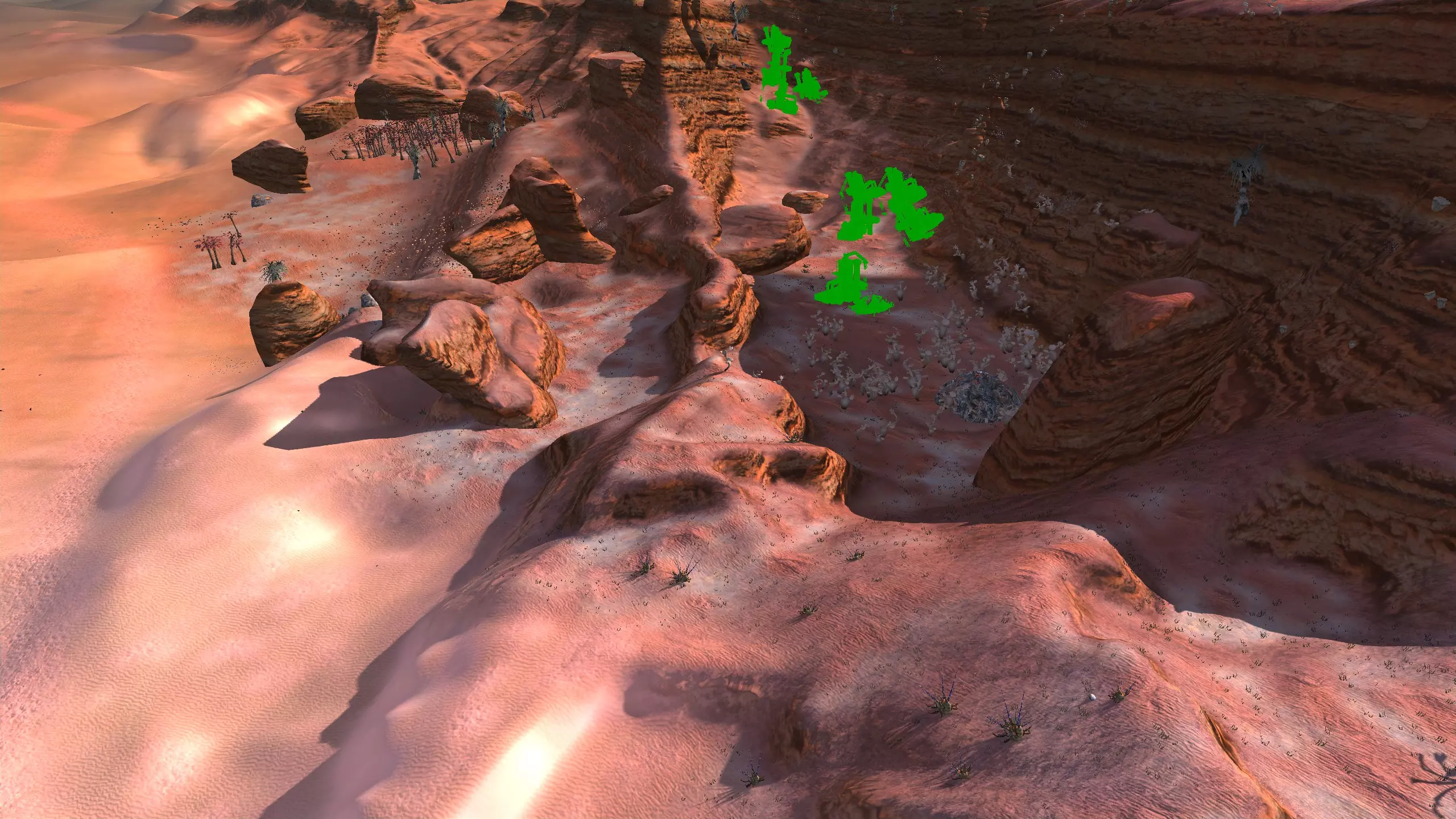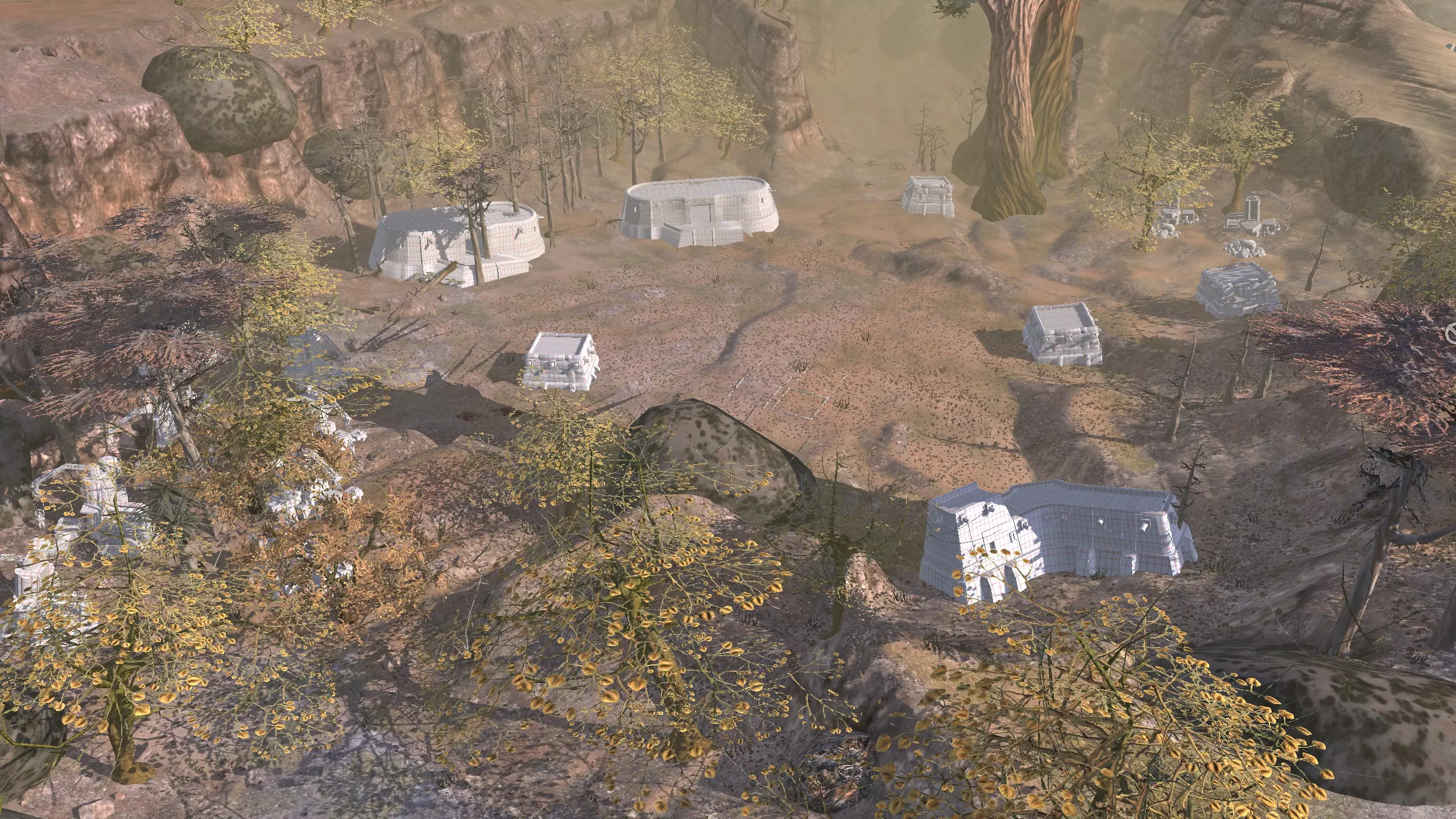描述:这里可能是古特地区最无聊的定居点,但也是最轻松且最高效的地方。它实在太无聊了,我得翻看之前拍的截图才能想起它长什么样。上面的截图并没有展示出你所有可建造的区域,镜头左右两侧还有很大空间,所以如果你想在古特建造一座宏伟的城市,这里就是你的不二之选。 这个地点看起来似乎就在区域的边缘,但我周围仍能看到不少排水沟。如果你真的想让敌人穿过尽可能多的排水沟才能到达你的基地,不妨考虑选择古特2号地点。如果你不想让一棵巨大的铁树位于基地中央,可以将它向左或向右偏移,使其位于城市的某一侧,但这或许能成为一个不错的角色扮演元素。也许你的派系视铁为“神圣之物”,因此这些树便是神圣的象征。好了,关于这个区域我就说这么多。 资源:100% 铁矿,约50% 铜矿,100% 石料,80% 水源,约90% 肥力 危险:我不想剧透。 2-G) 大沙漠 大沙漠 注意:在探索大沙漠时,我发现了比预期多得多的潜在基地选址。整个区域资源丰富,而且面积非常广阔。我在此只指出最佳或最值得注意的地点。如果你觉得我下面列出的地点都不合你口味,可以自己去探索这个区域,但要记住,外面有很多无聊的沙丘。你可能会发现,就连我的列表里也有不少无聊的沙丘。 1)