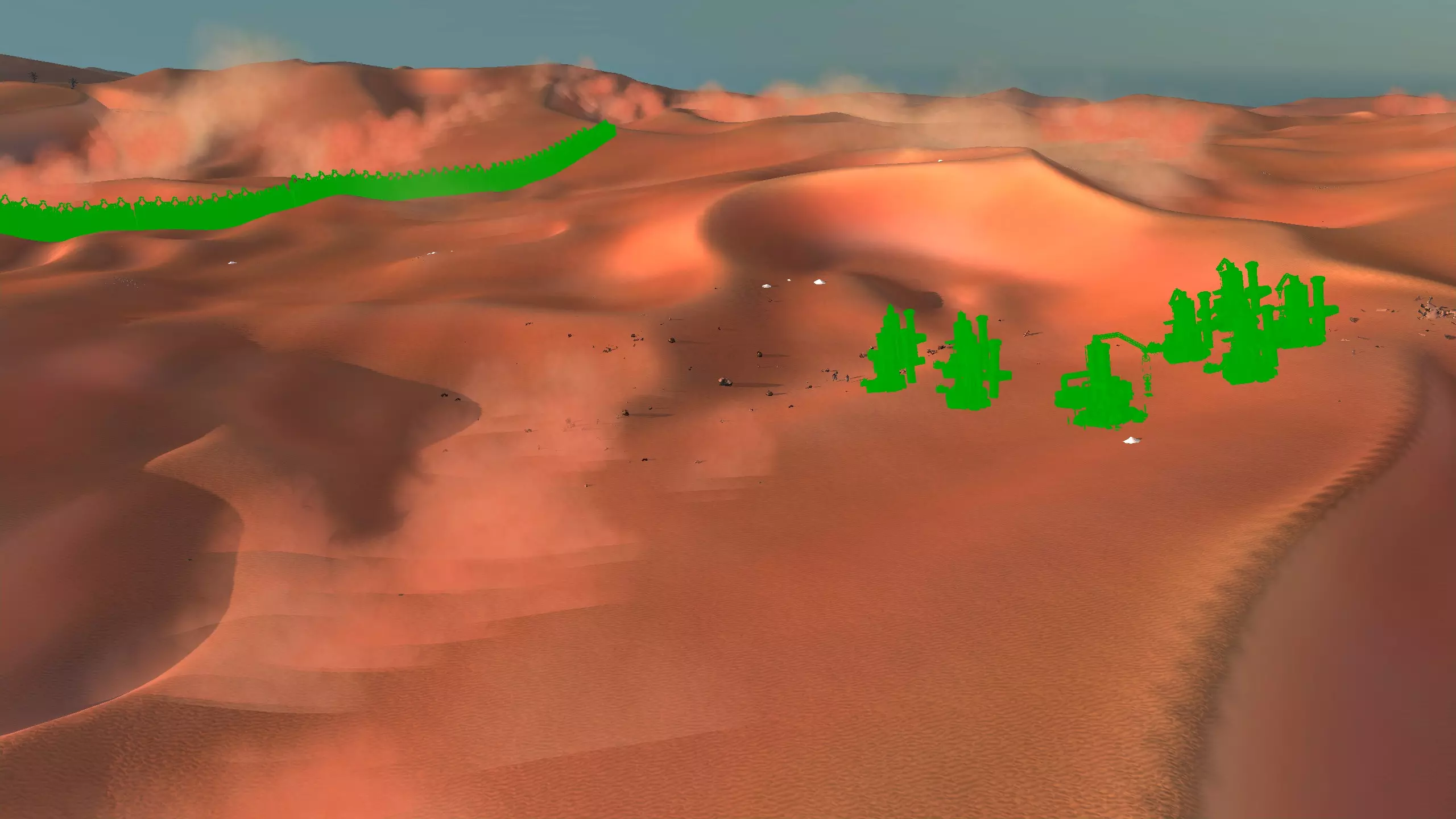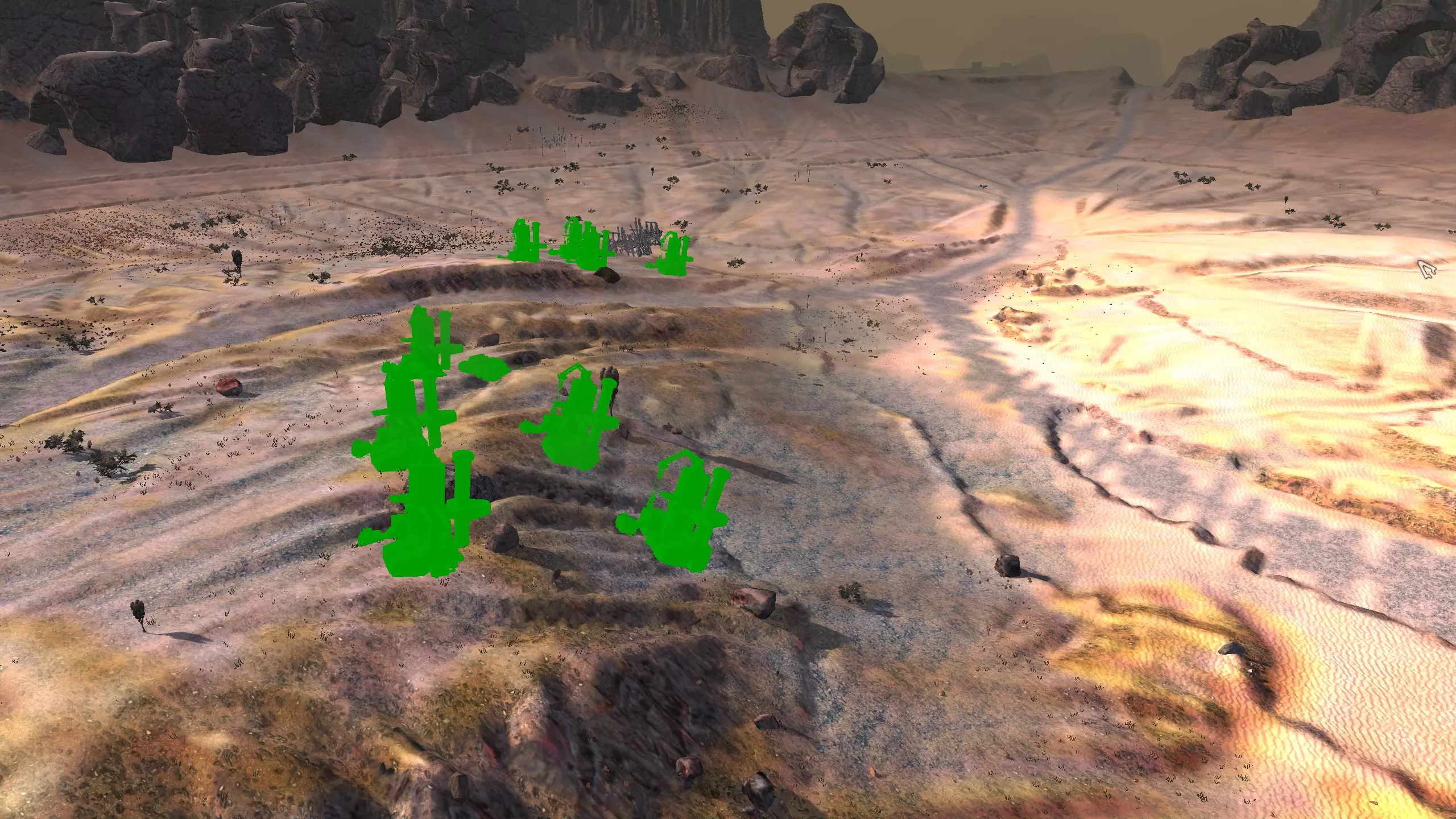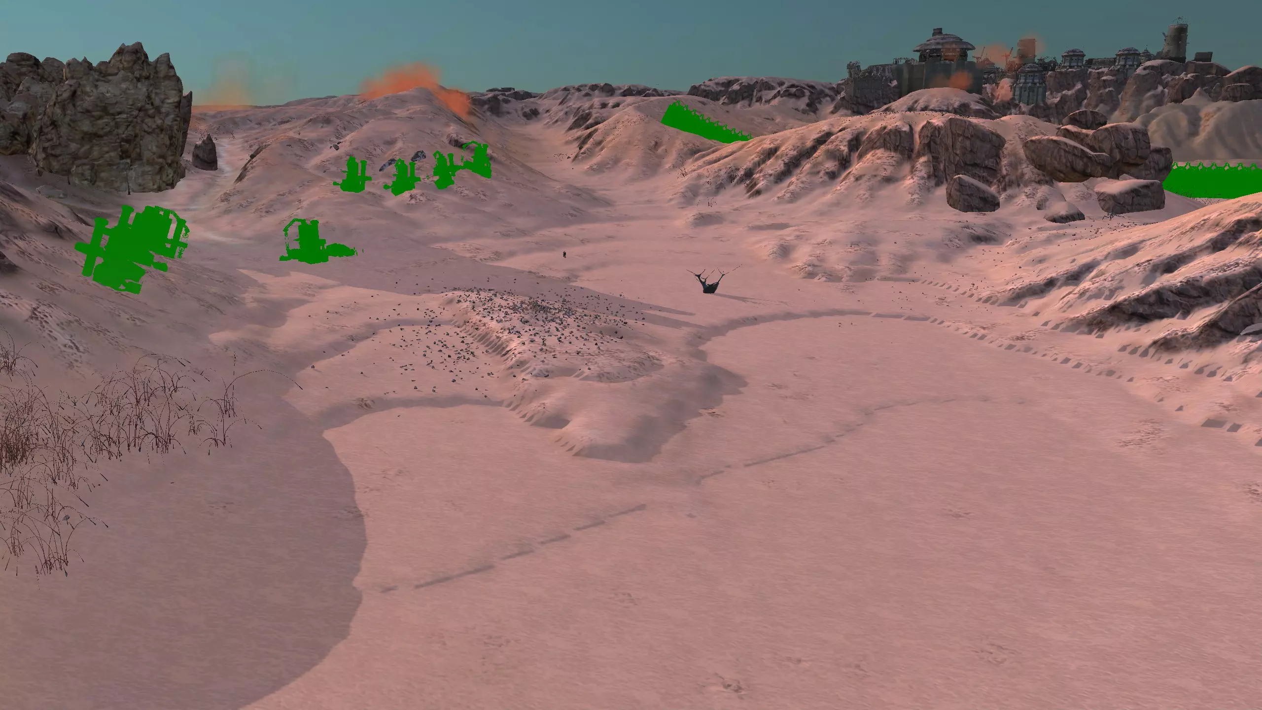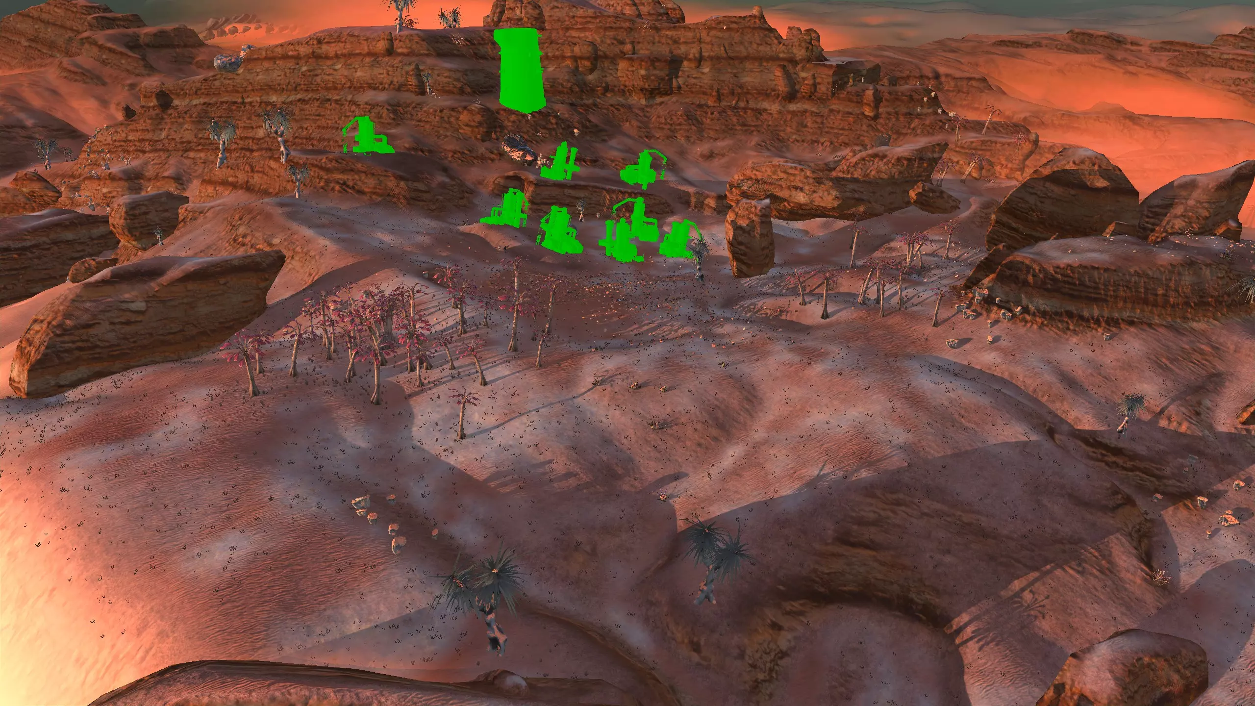 描述:这里可能是古特地区最无聊的定居点,但也是最轻松且最高效的地方。它实在太无聊了,我得翻看之前拍的截图才能想起它长什么样。上面的截图并没有展示出你所有可建造的区域,镜头左右两侧还有很大空间,所以如果你想在古特建造一座宏伟的城市,这里就是你的不二之选。 这个地点看起来似乎就在区域的边缘,但我周围仍能看到不少排水沟。如果你真的想让敌人穿过尽可能多的排水沟才能到达你的基地,不妨考虑选择古特2号地点。如果你不想让一棵巨大的铁树位于基地中央,可以将它向左或向右偏移,使其位于城市的某一侧,但这或许能成为一个不错的角色扮演元素。也许你的派系视铁为“神圣之物”,因此这些树便是神圣的象征。好了,关于这个区域我就说这么多。 资源:100% 铁矿,约50% 铜矿,100% 石料,80% 水源,约90% 肥力 危险:我不想剧透。 2-G) 大沙漠 大沙漠 注意:在探索大沙漠时,我发现了比预期多得多的潜在基地选址。整个区域资源丰富,而且面积非常广阔。我在此只指出最佳或最值得注意的地点。如果你觉得我下面列出的地点都不合你口味,可以自己去探索这个区域,但要记住,外面有很多无聊的沙丘。你可能会发现,就连我的列表里也有不少无聊的沙丘。 1)