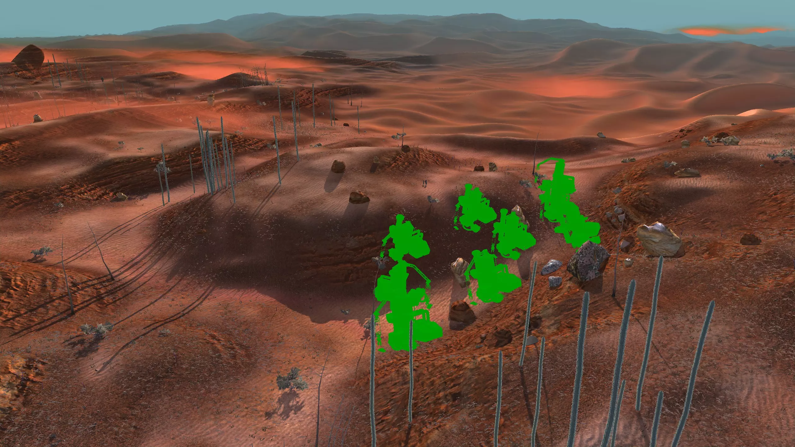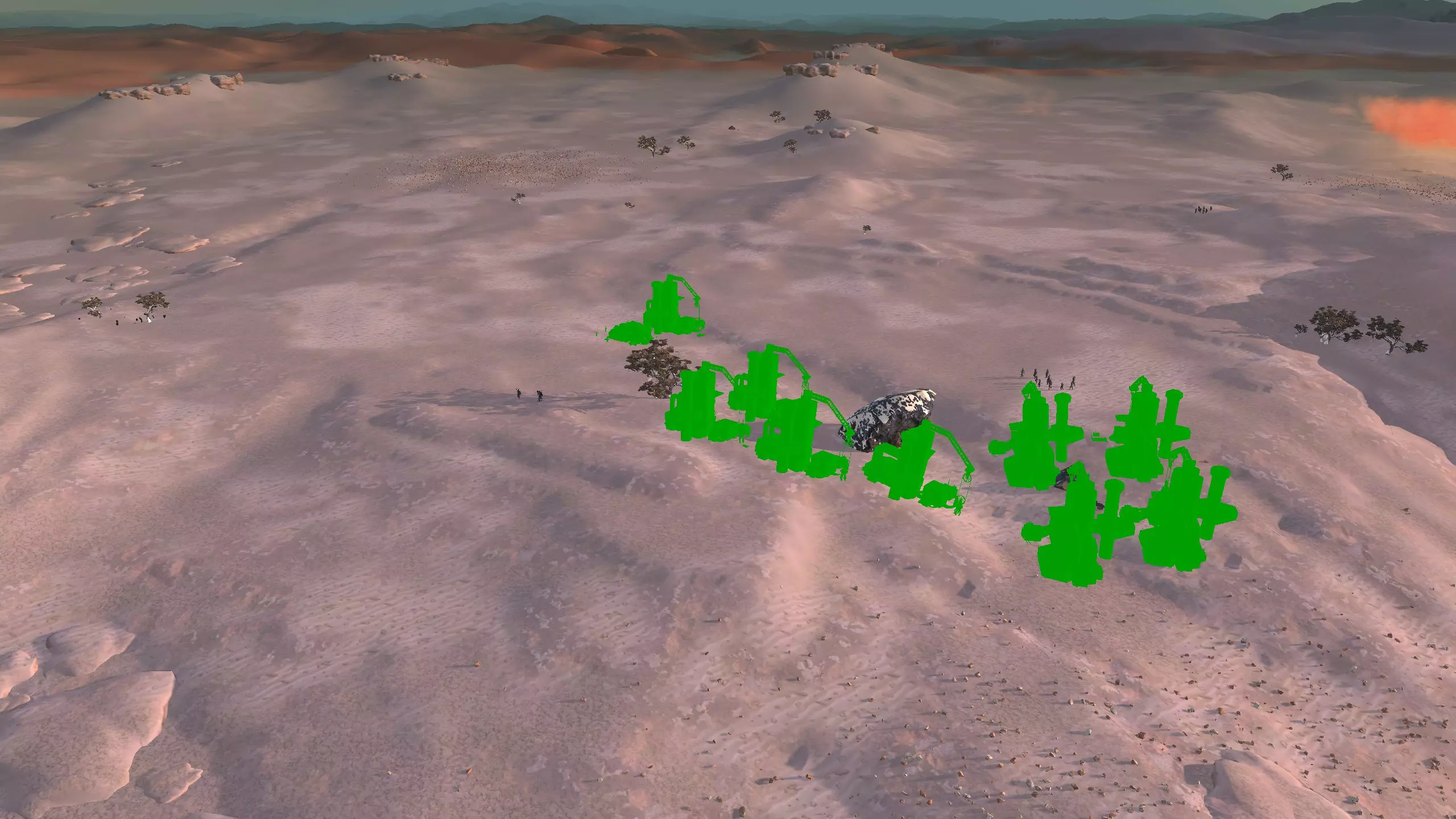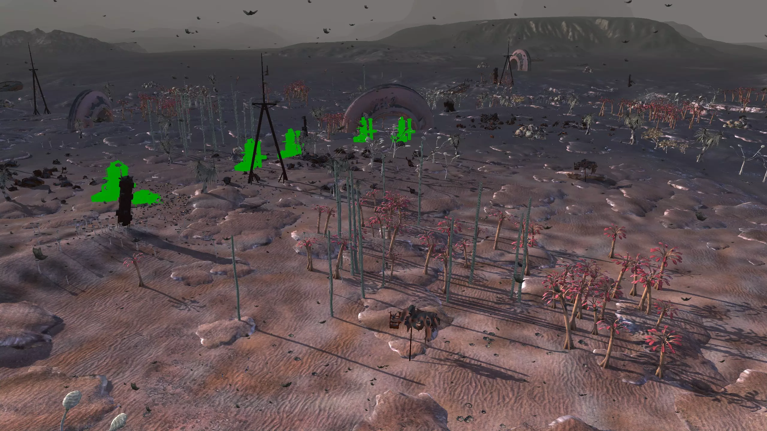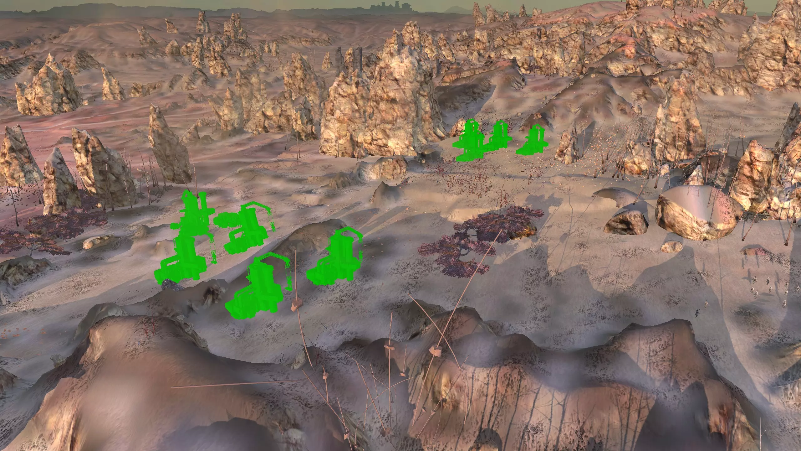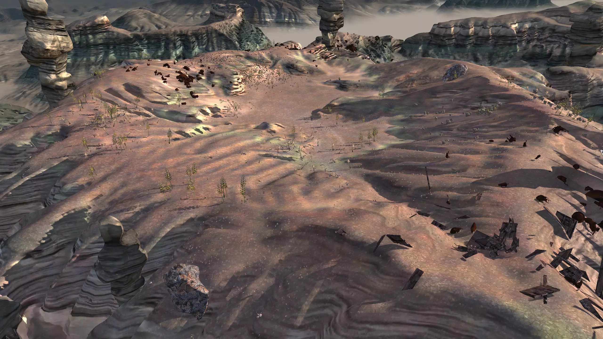 描述:这里可能是古特地区最无聊的定居点,但也是最轻松且最高效的地方。它实在太无聊了,我得翻看之前拍的截图才能想起它长什么样。上面的截图并没有展示出你所有可建造的区域,镜头左右两侧还有很大空间,所以如果你想在古特建造一座宏伟的城市,这里就是你的不二之选。 这个地点看起来似乎就在区域的边缘,但我周围仍能看到不少排水沟。如果你真的想让敌人穿过尽可能多的排水沟才能到达你的基地,不妨考虑选择古特2号地点。如果你不想让一棵巨大的铁树位于基地中央,可以将它向左或向右偏移,使其位于城市的某一侧,但这或许能成为一个不错的角色扮演元素。也许你的派系视铁为“神圣之物”,因此这些树便是神圣的象征。好了,关于这个区域我就说这么多。 资源:100% 铁矿,约50% 铜矿,100% 石料,80% 水源,约90% 肥力 危险:我不想剧透。 2-G) 大沙漠 大沙漠 注意:在探索大沙漠时,我发现了比预期多得多的潜在基地选址。整个区域资源丰富,而且面积非常广阔。我在此只指出最佳或最值得注意的地点。如果你觉得我下面列出的地点都不合你口味,可以自己去探索这个区域,但要记住,外面有很多无聊的沙丘。你可能会发现,就连我的列表里也有不少无聊的沙丘。 1)