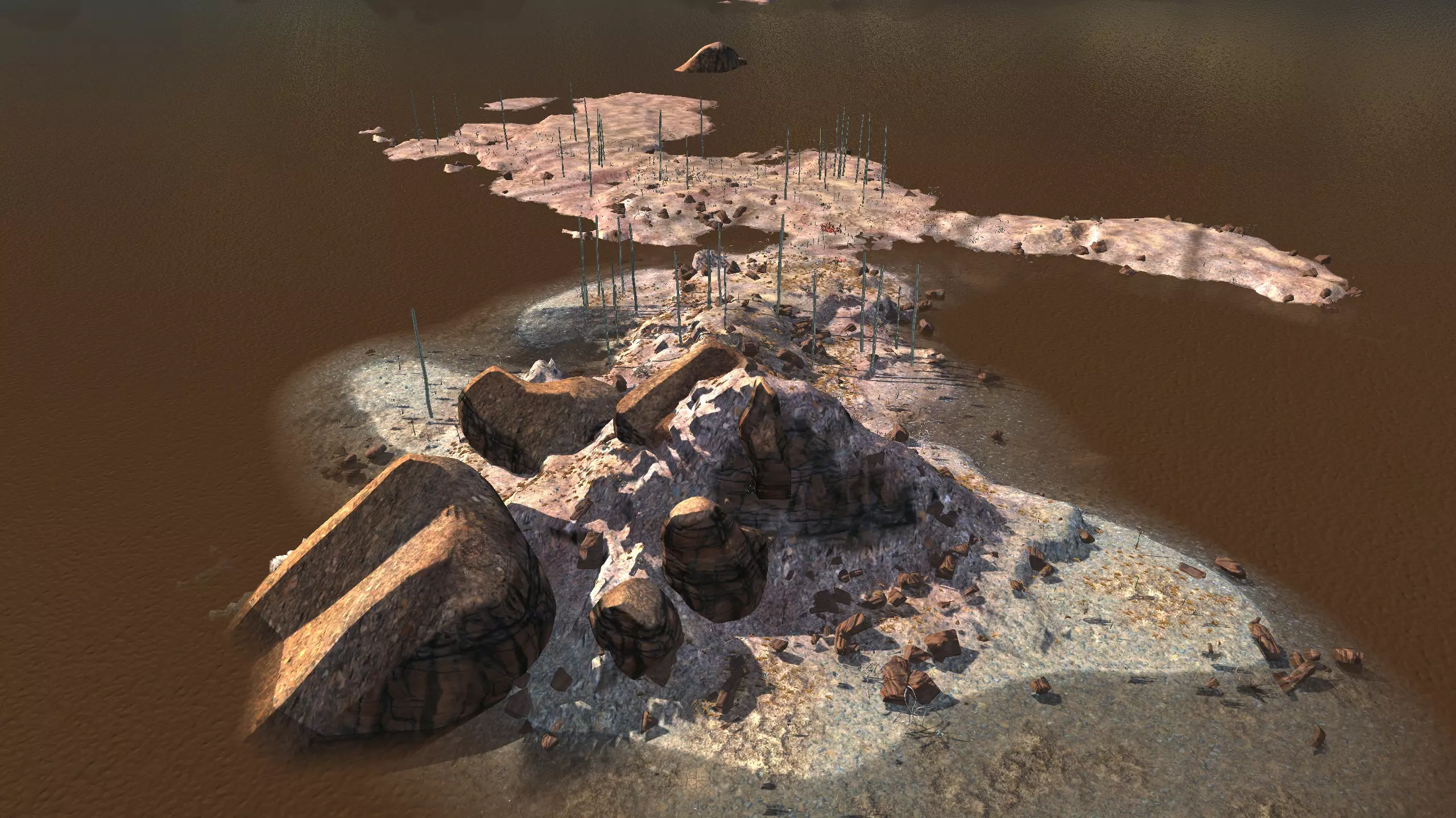 从技术上讲,这里并不属于“无海岸”区域,但它也不适合划分到其他任何区域。这片位于海洋中央的小土块风景格外优美,因此我将其收录进来。它是游戏中为数不多的岛屿之一,而且可能是距离大陆最远的岛屿,当食人族袭击来临时,你将有最多的时间去操控炮塔——前提是他们真的会来到这里…… 我猜,由于“无”区域存在一个“bug”,即该区域什么都没有:没有石头、没有水源、没有铁矿、没有铜矿,所以在《剑士》原版中,你在这里完全找不到任何资源。 暂且不论这个地方存在的所有问题……如果你像本指南底部可选部分中建议的某些模组那样,添加凭空生成资源的功能,理论上可以把这个地方改造成有用的场所。当然,这意味着你实际上可以在任何地方建立基地,而不仅仅是这里,不过嘛。 资源:0% 铁、0% 铜、0% 石头、0% 水、0% 肥力,因此尽管干旱度为 100%,这里也无法种植任何东西。 危险:无。这可能是整个游戏中最安全的地点。 2)