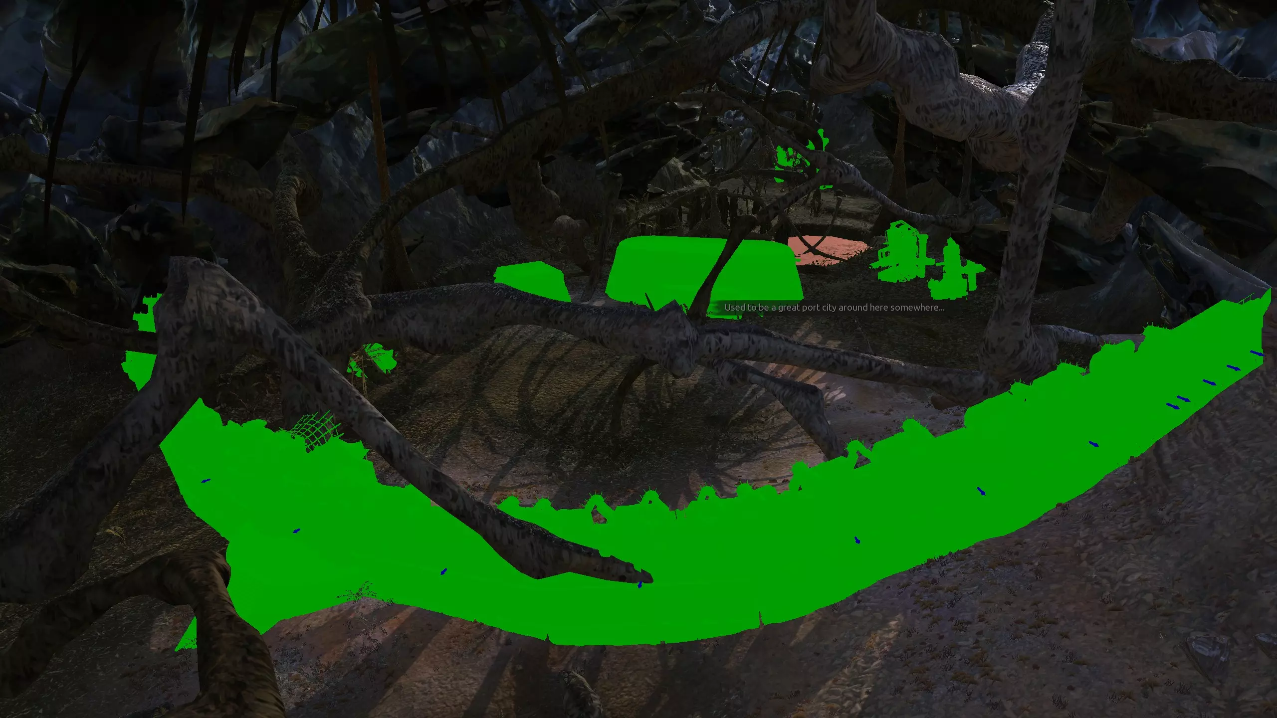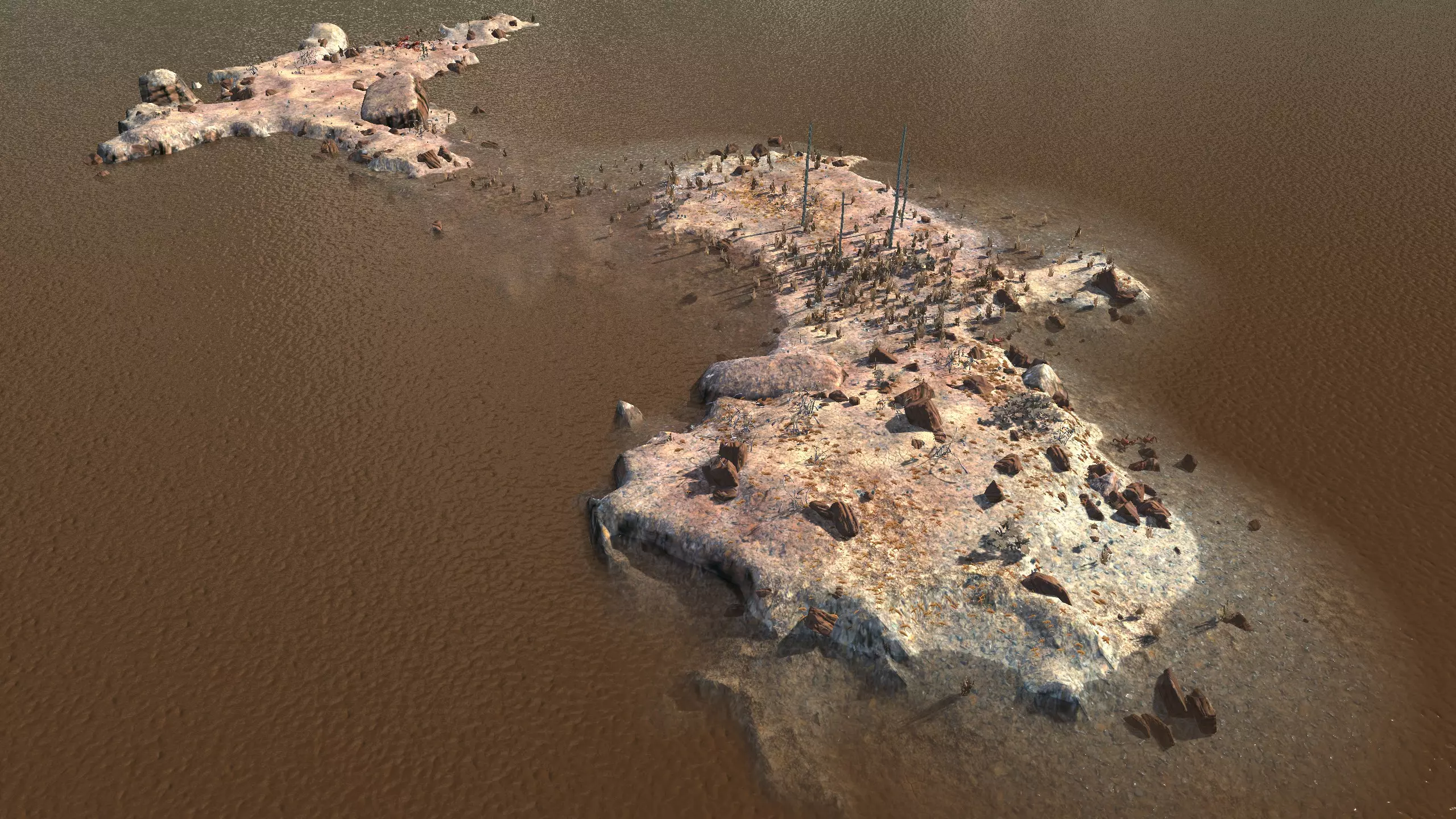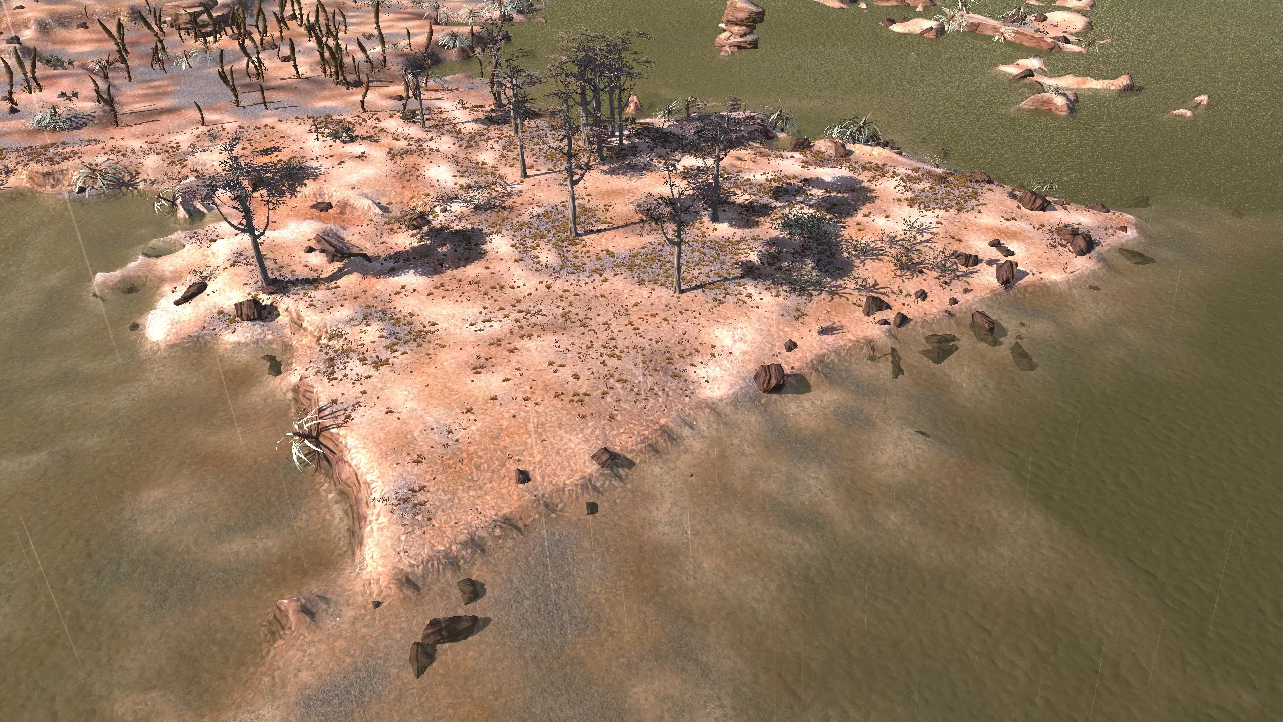 如你所见,这里就是【The Eye】。它看起来可能不像,因为它有点像是三到四个不同生物群系的混合体,但它确实是【The Eye】。所以,如果你想说“我?我住在【The Eye】”,却又想发一张看起来像是灰色沙漠和某种沙地混合的截图,那这里就很合适。 如果你想要一个类似灰色沙漠,但地形非常平坦,并且位于联合城领地内的地方,那么这个地点值得一探究竟。灰色沙漠就在联合城领地之外,而【The Eye】则在领地之内,所以你在这里可以算是兼顾了两者的优势。 如果你真的想这么做,可以建造大约20口井,以利用这里10%的水资源,但你或许也可以直接使用【Moisture Farming Enhanced】。资源:100%铁,100%铜,100%石头,10%水,93%肥沃度 危险:沙忍者、草忍者、猎人小队、血袭者小队、奴隶小队、漫游掠行者以及骨犬。除此之外,还有联合城和商人公会事件。 2-F) 鱼人岛,浅滩泻湖 鱼人岛 1)